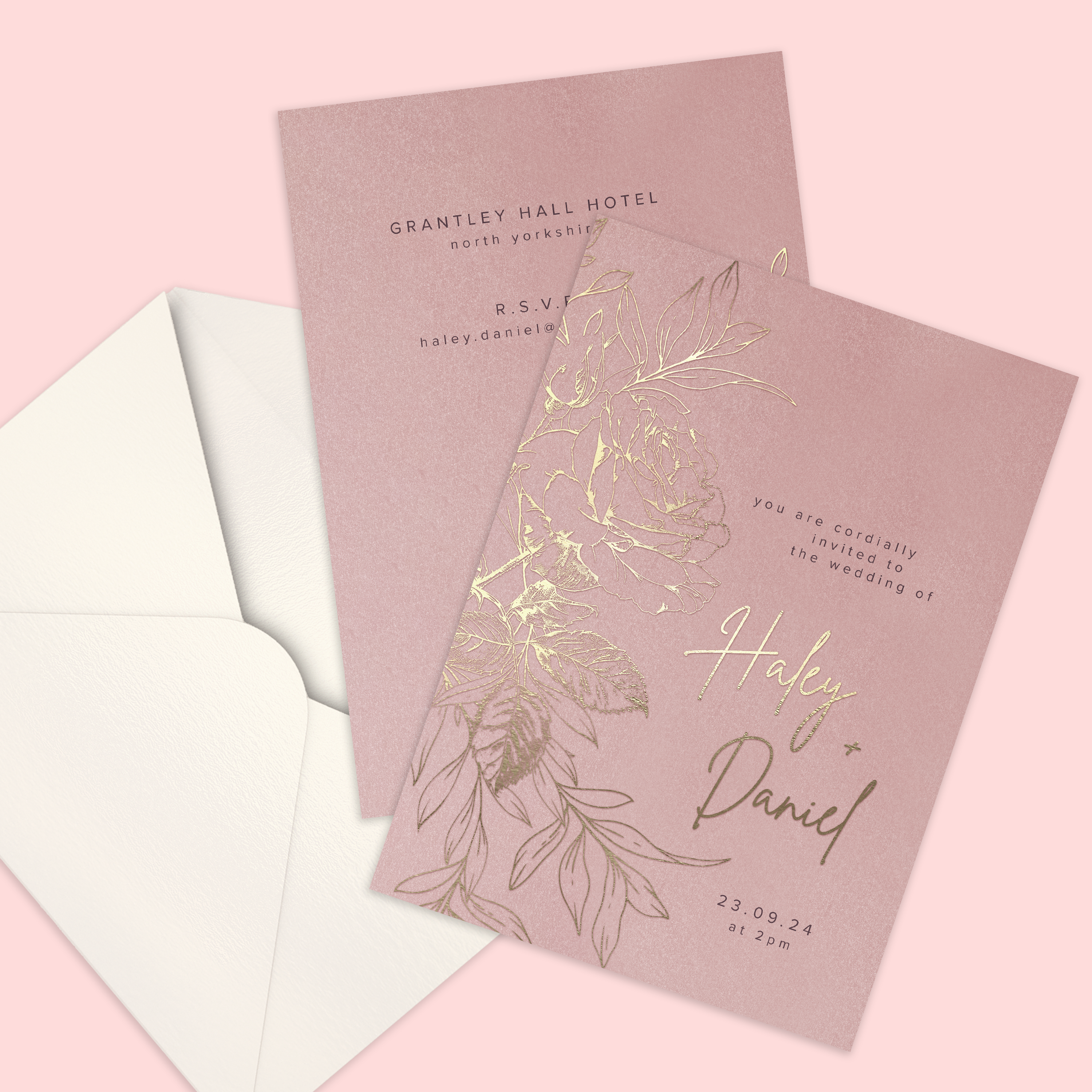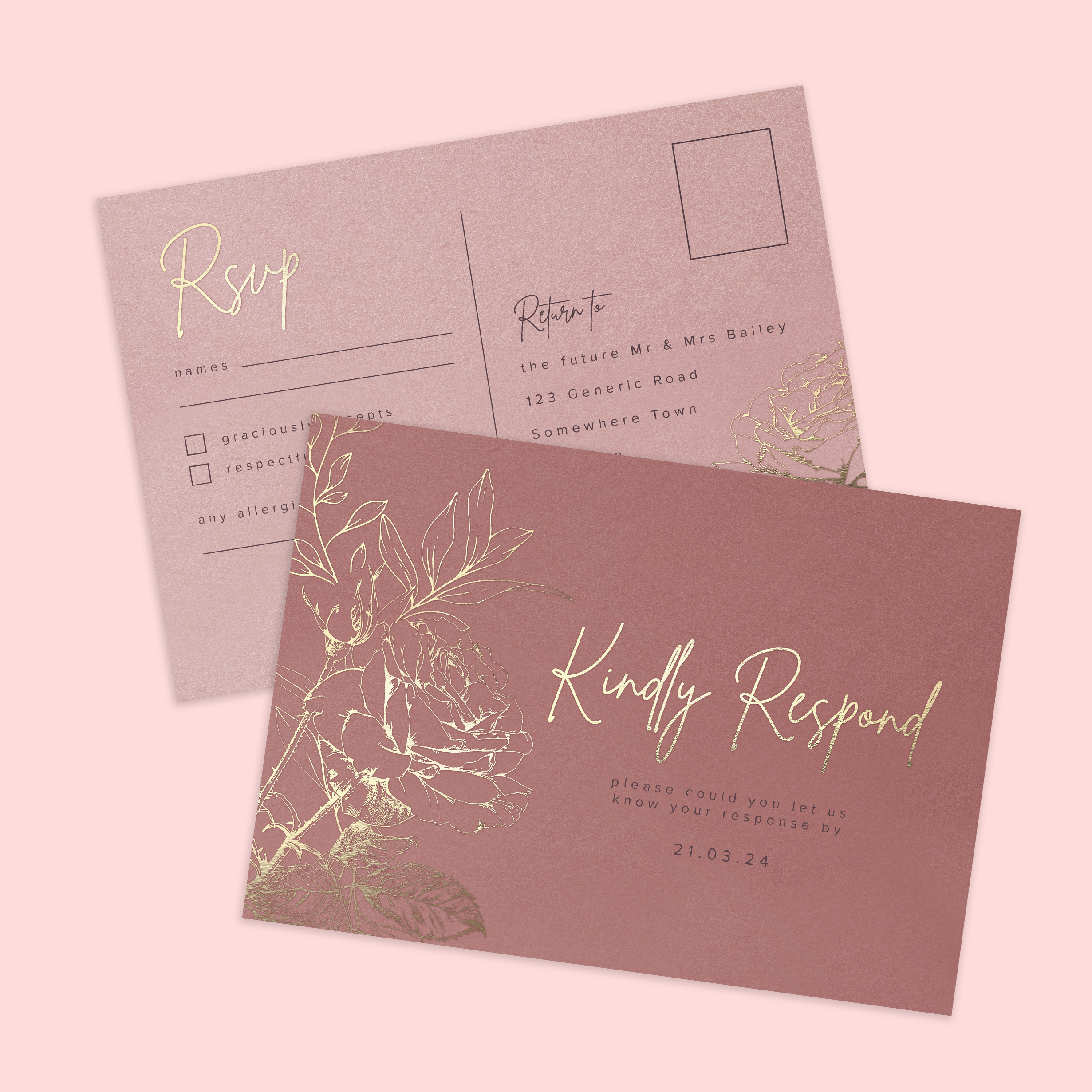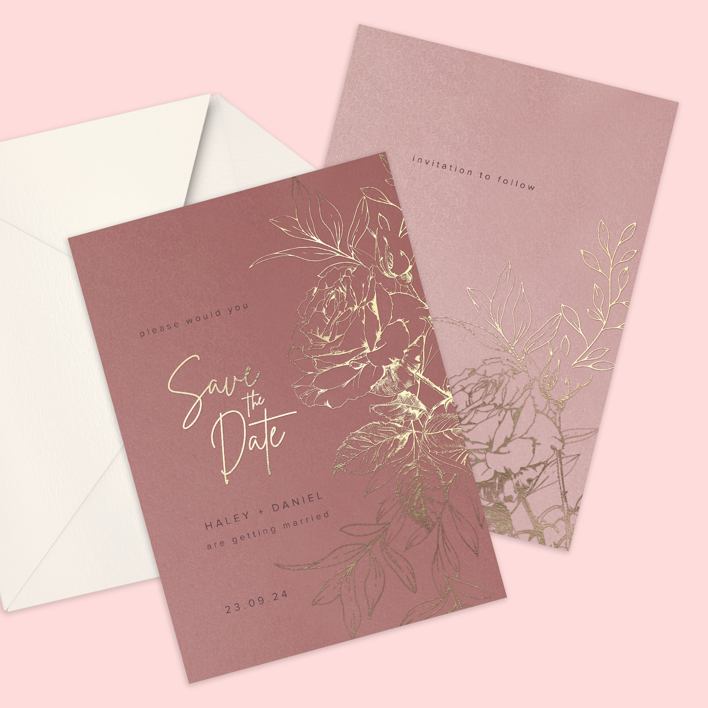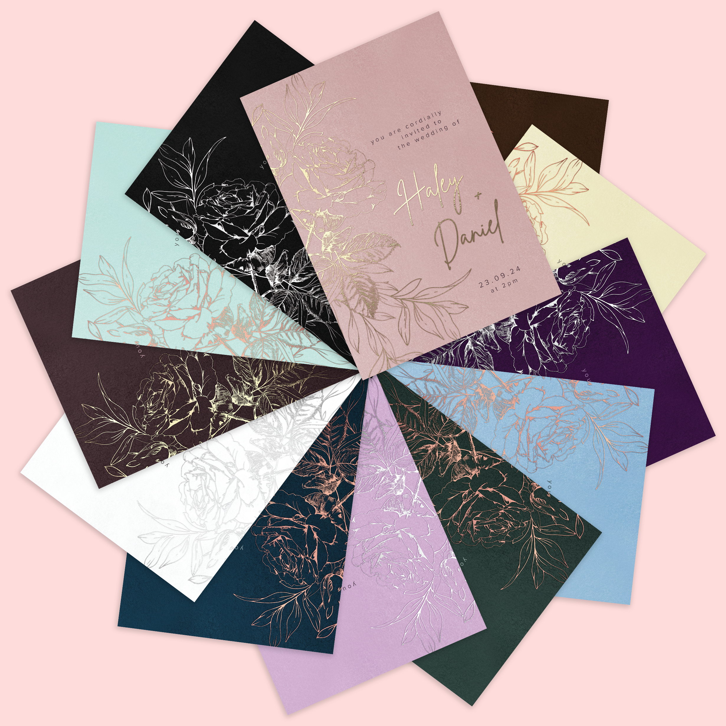 This beautifully luxurious wedding suite features real foil rose illustrations on various shades of the same colour for completely cohesive look. Choose pearl oyster paper and envelopes for an all over shimmer.
