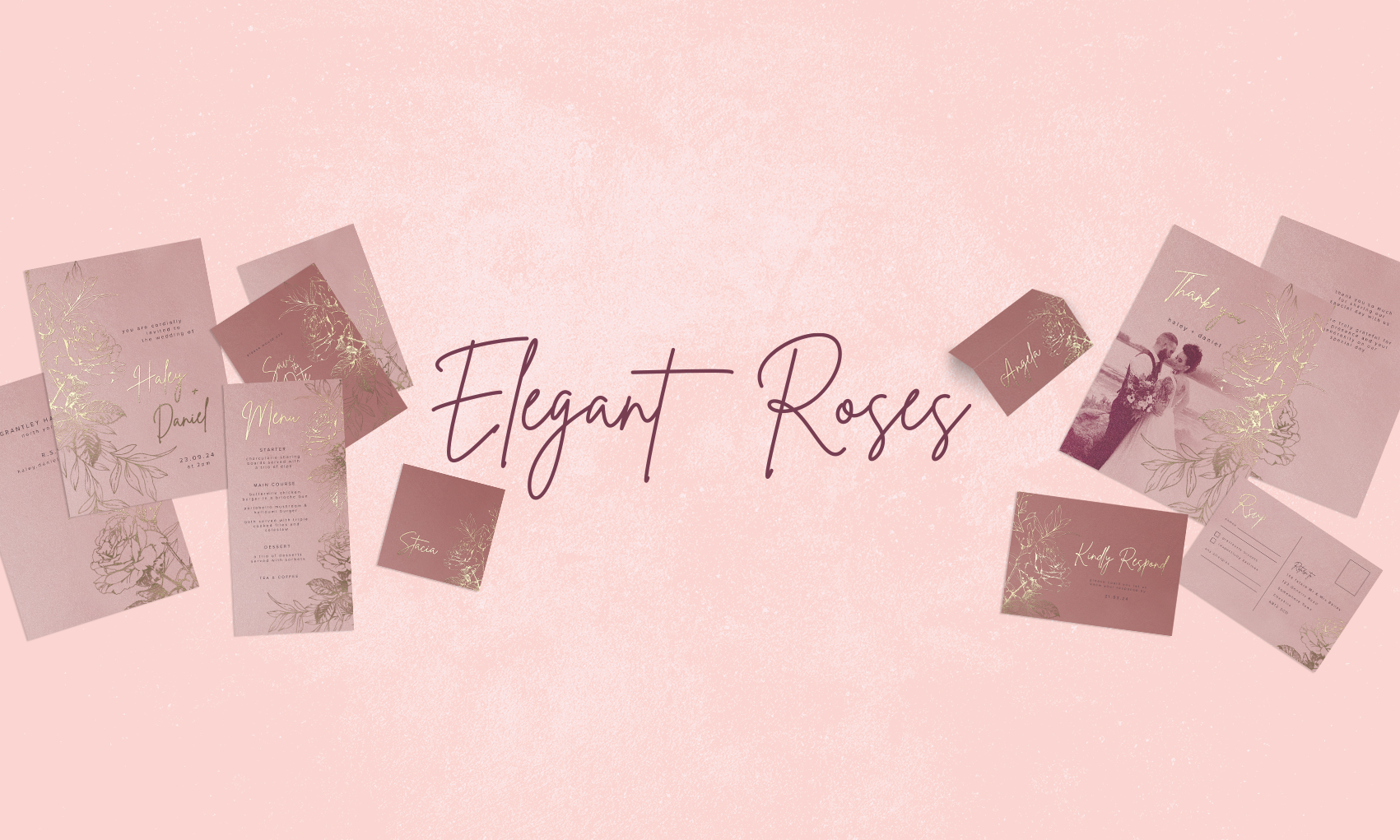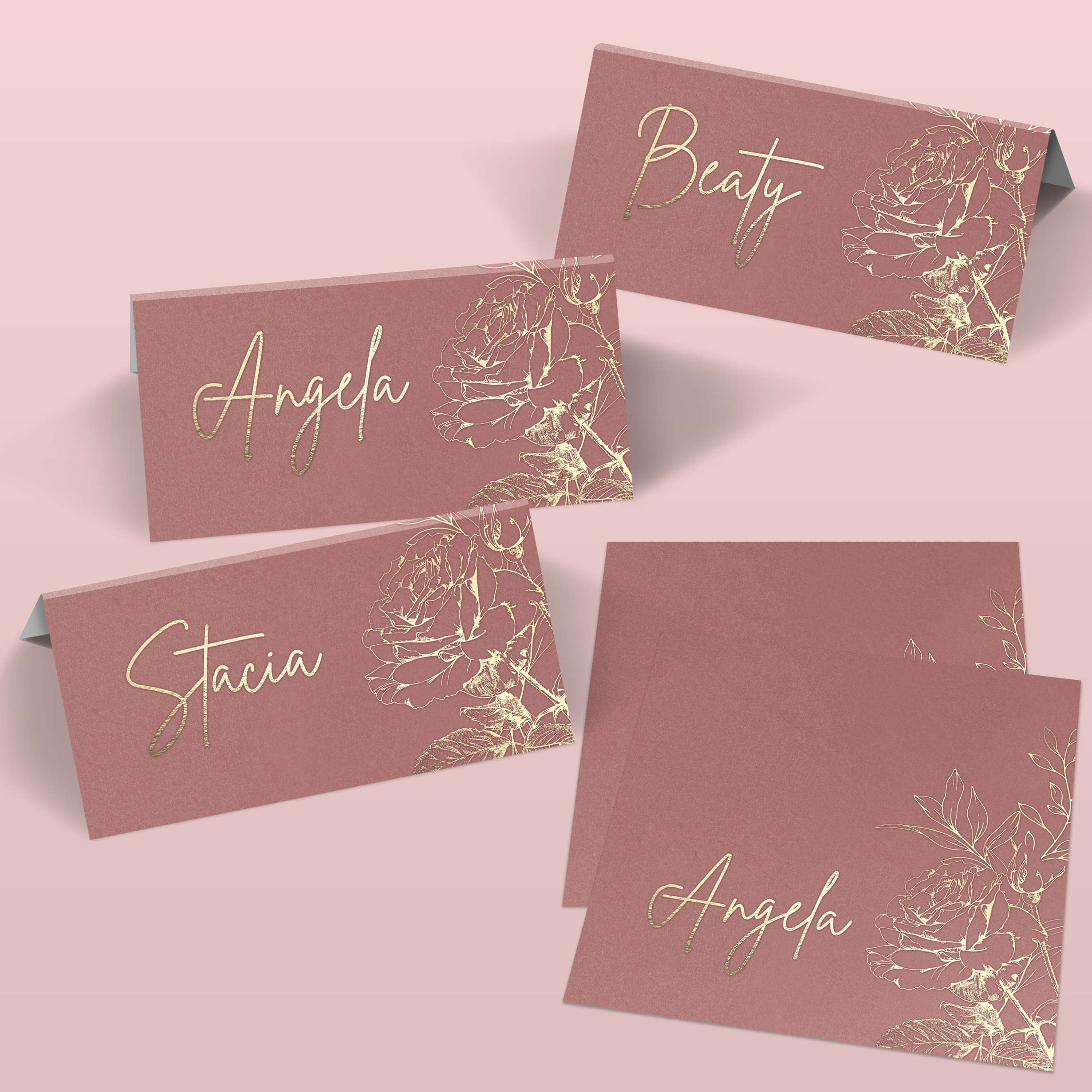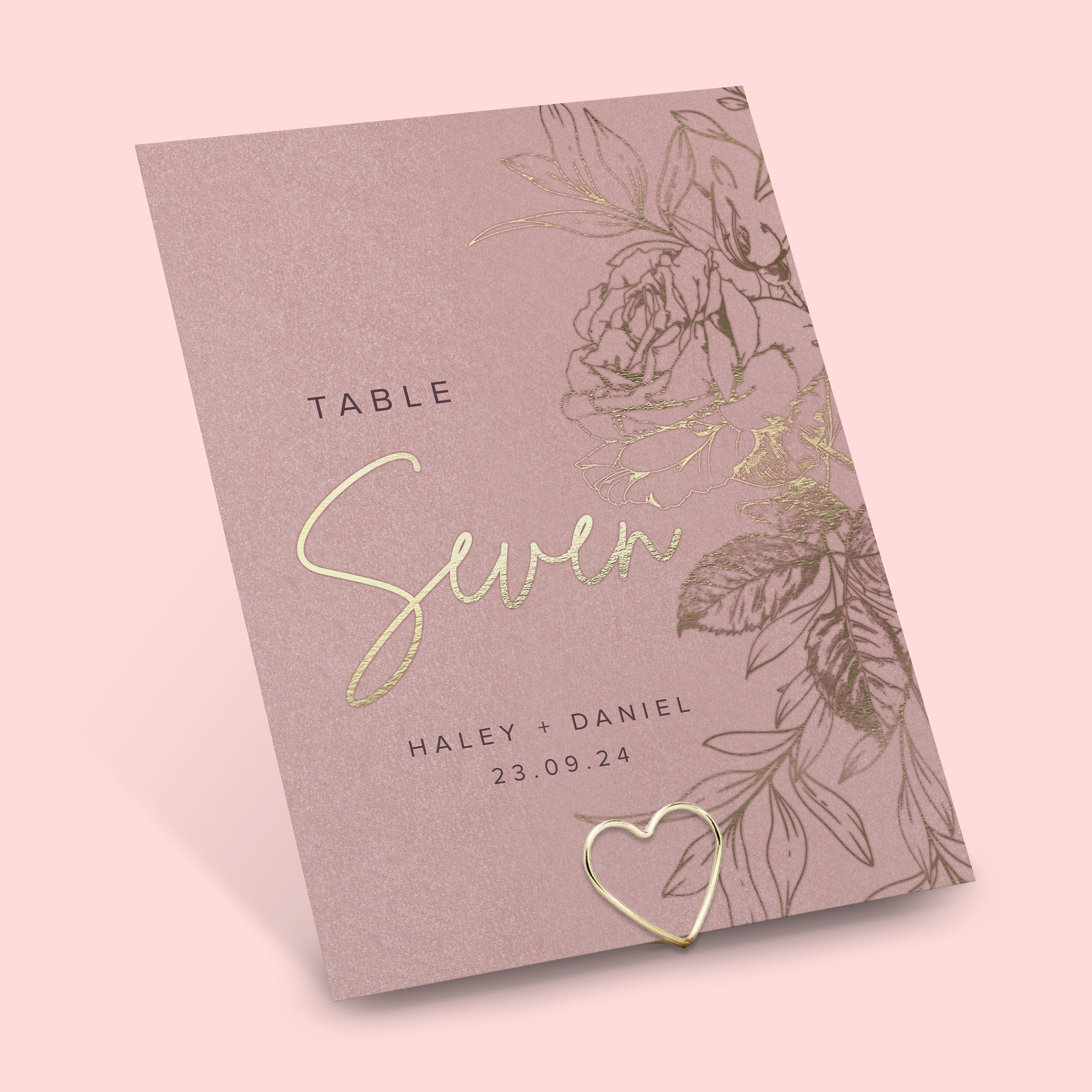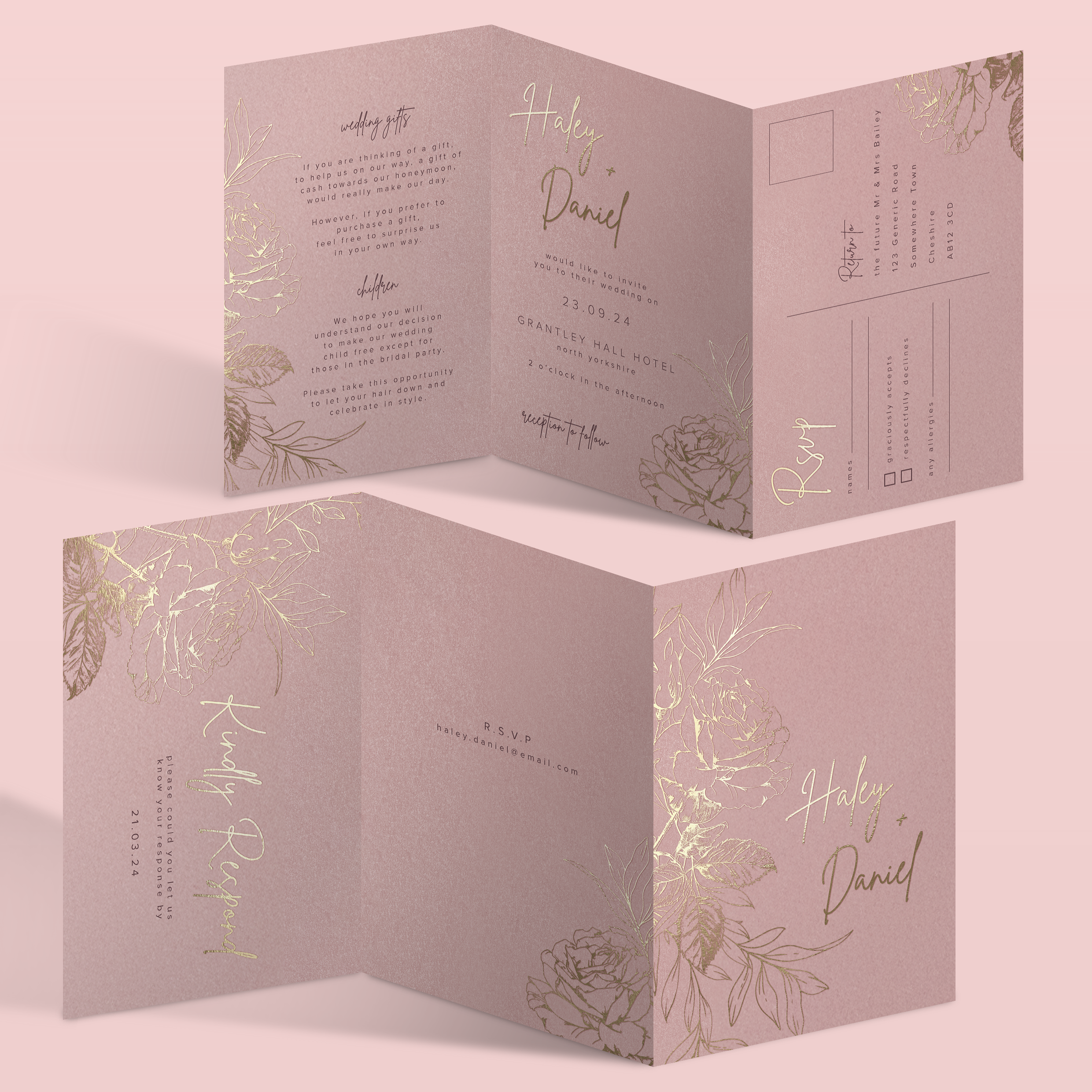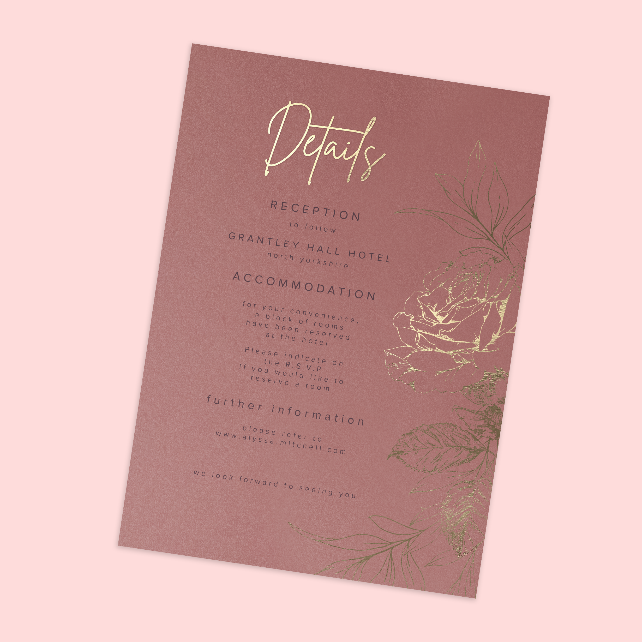 This beautifully luxurious wedding suite features real foil rose illustrations on various shades of the same colour for completely cohesive look. Choose pearl oyster paper and envelopes for an all over shimmer.