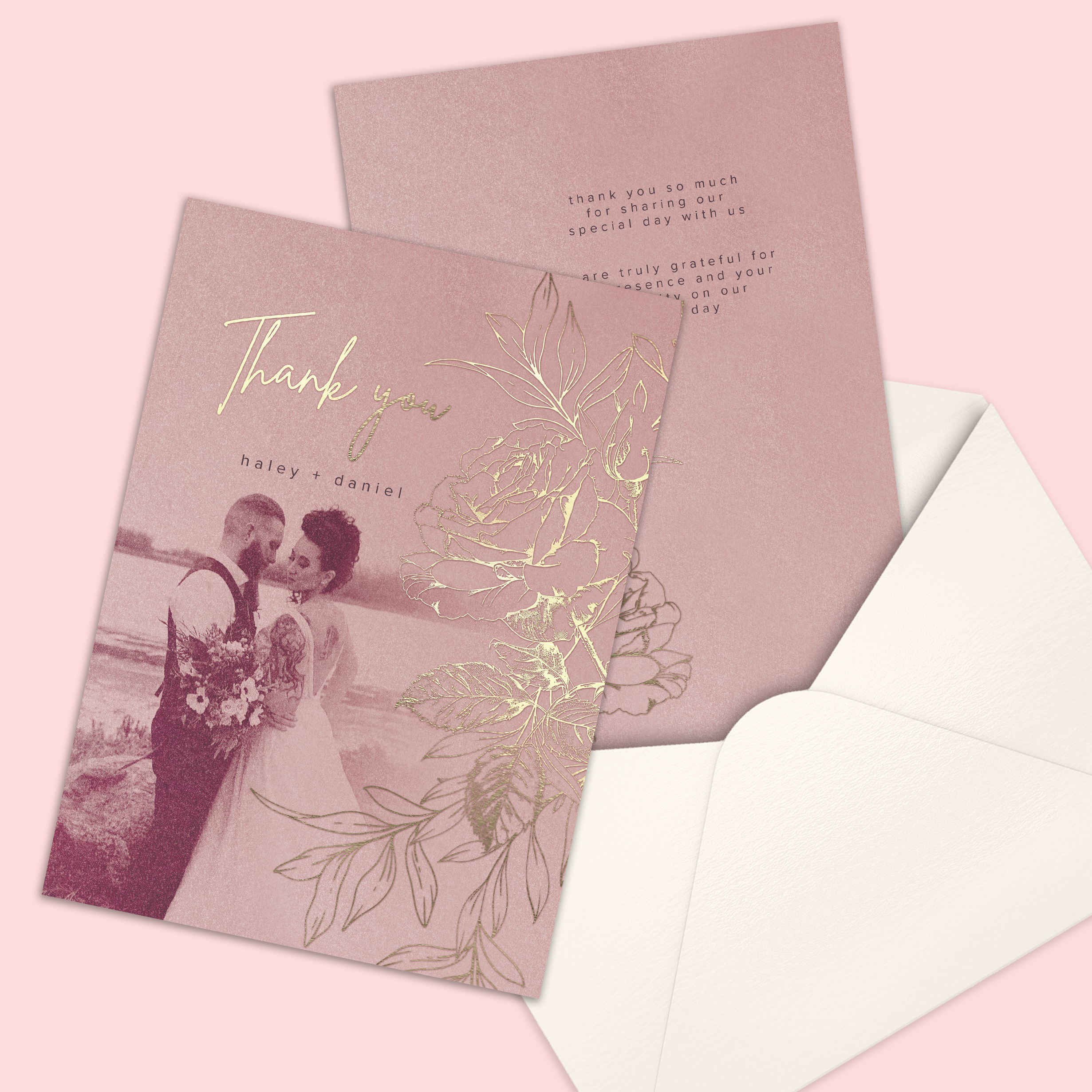 Send a heartfelt message of thanks with my thank you cards that feature a treasured memory from your special day. Available in any size, with a choice of flat or folded designs and will arrive with envelopes in a complimentary colour.