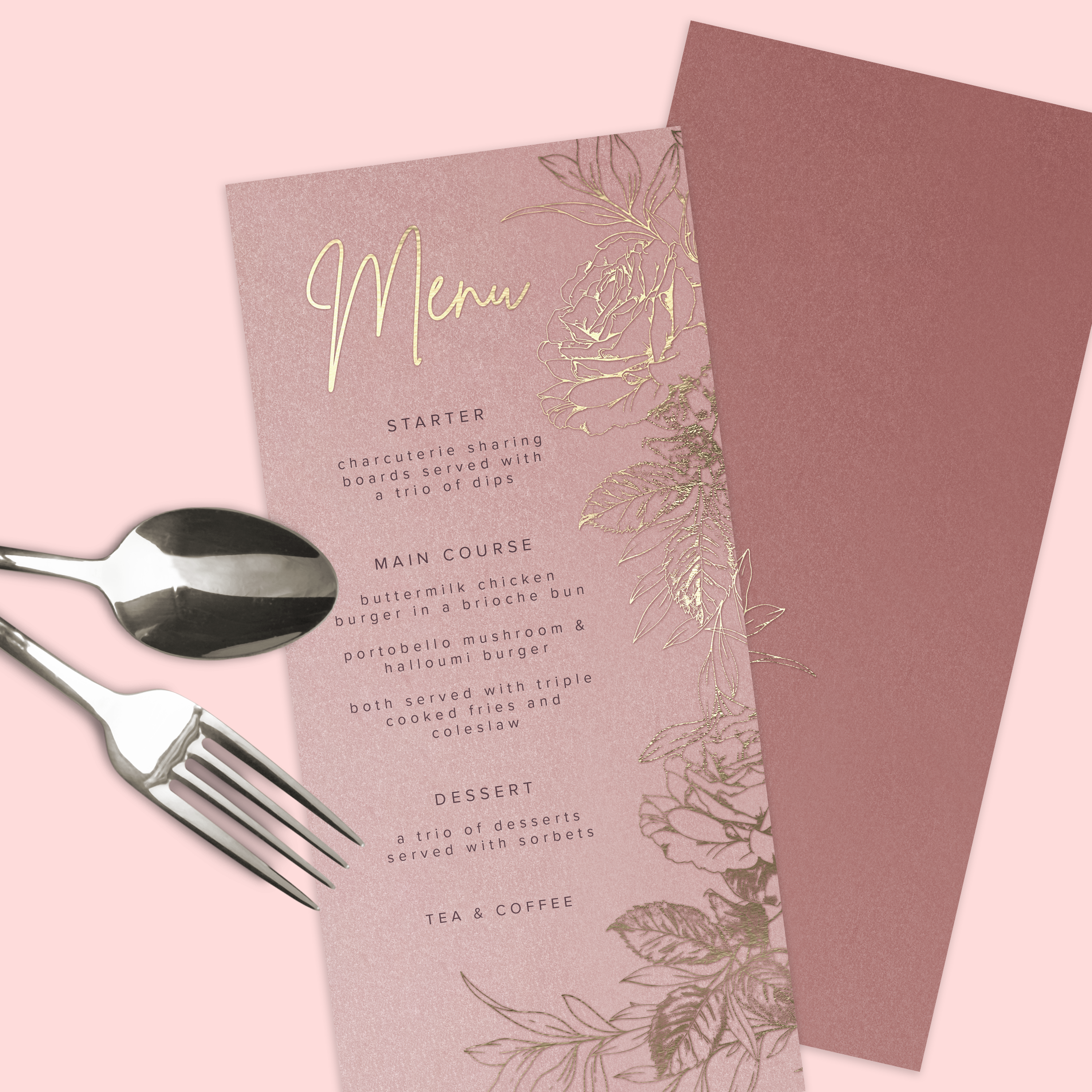 Perfectly in line with the rest of the suite, this menu can have text on both sides if your menu has more text, such as a drinks menu or further options. I can also provide separate menu's for vegan or children's menus.