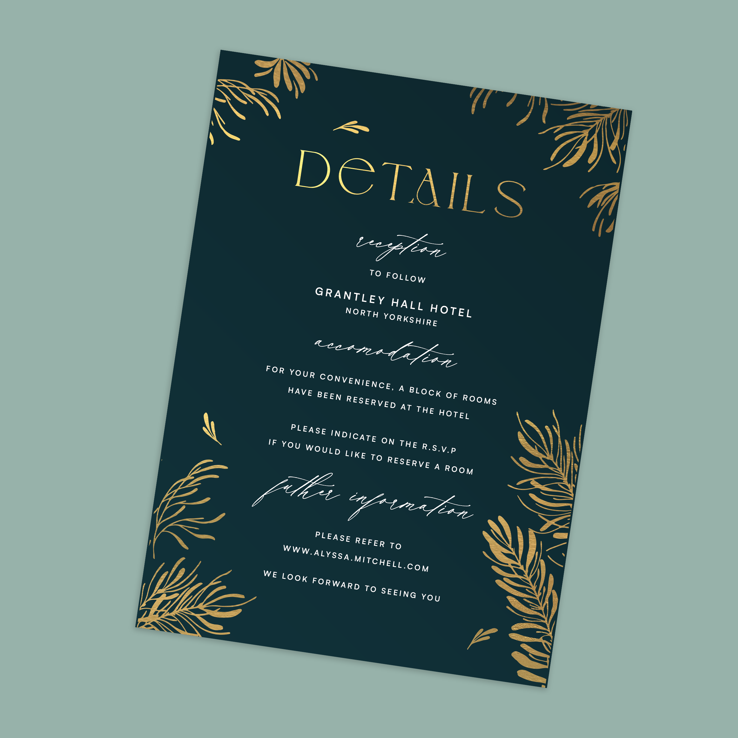 Help your guests feel prepared with a details card to provide guests all the essential information they’ll need for your big day. Available in many sizes, with single or double sided print, you can choose to include whatever information is necessary.