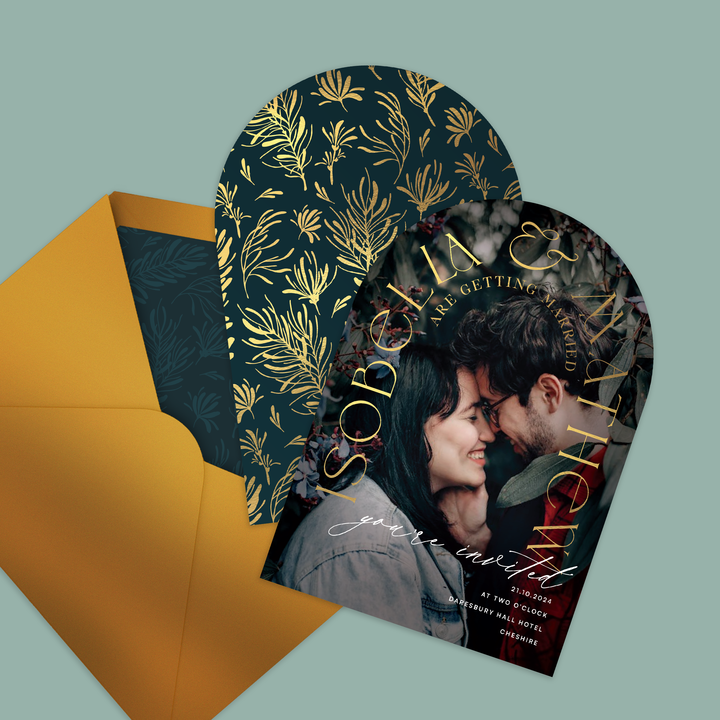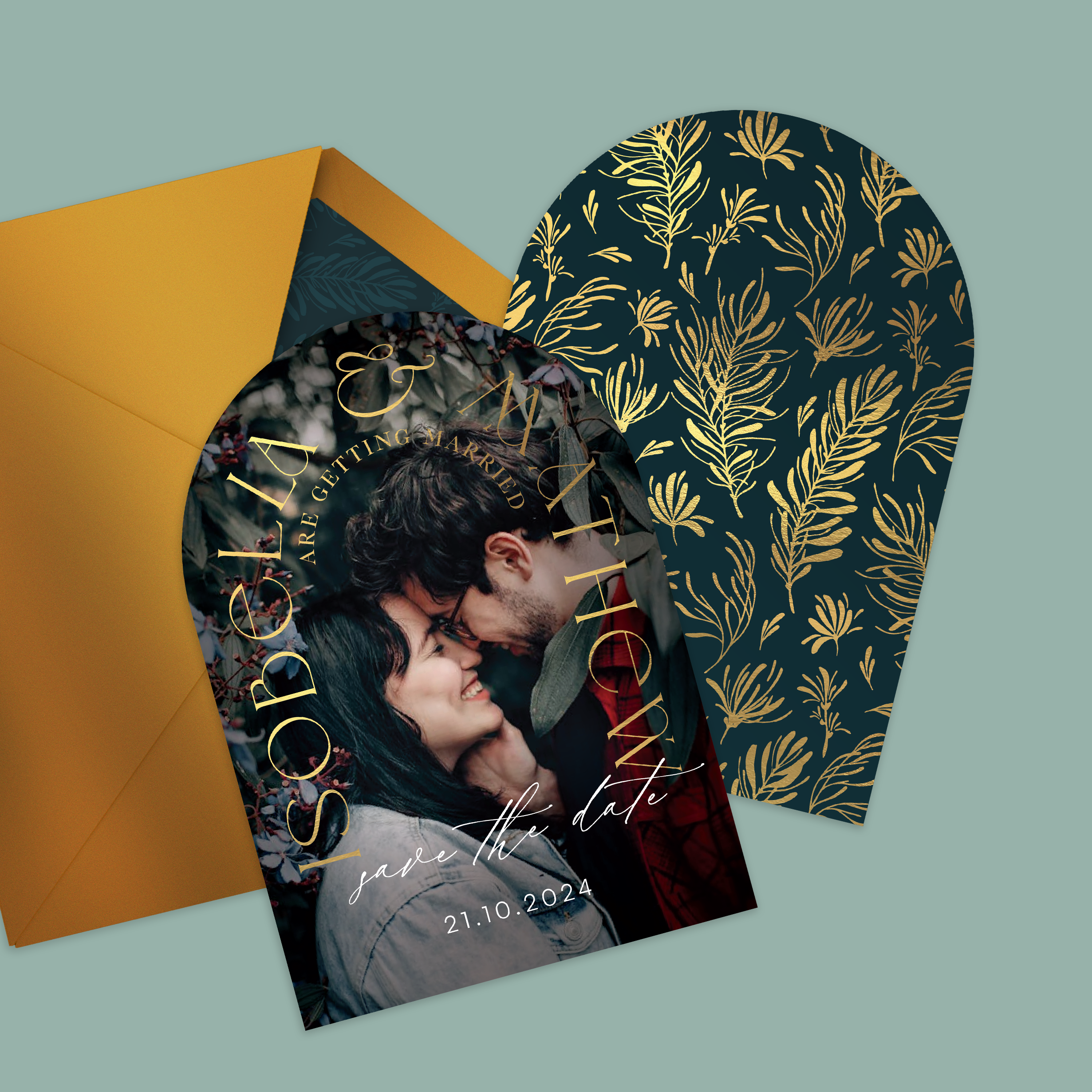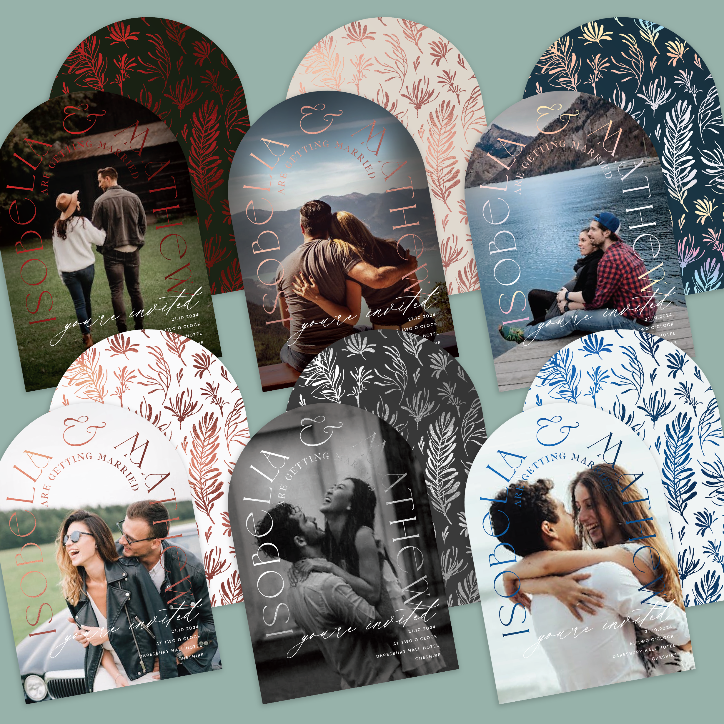 This elegant wedding suite beautifully blends contemporary design with timeless romance. The main pieces feature a refined arched edge creating a luxurious and modern design. A subtle foliage motif on the back of the stationery adds organic texture and sophistication.
