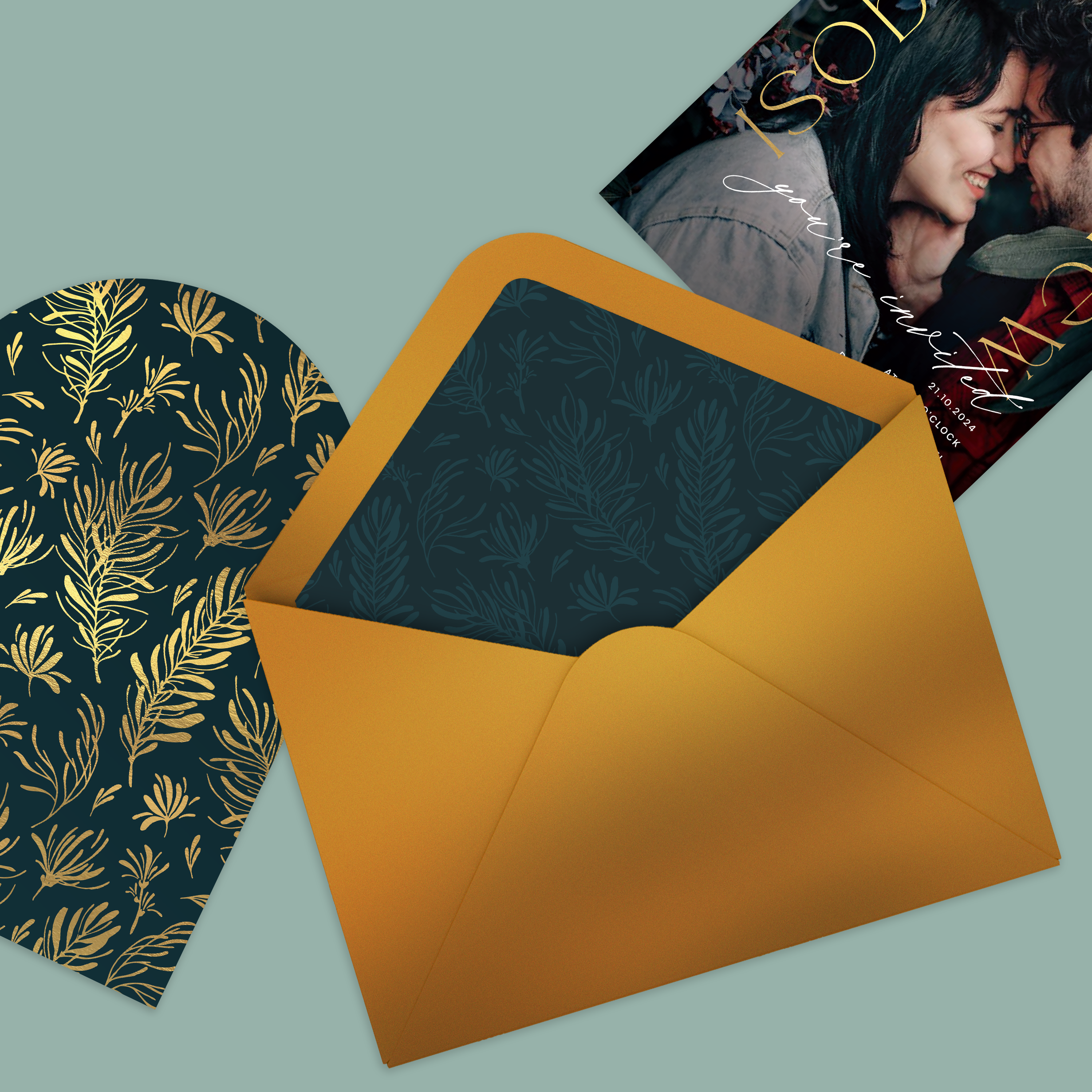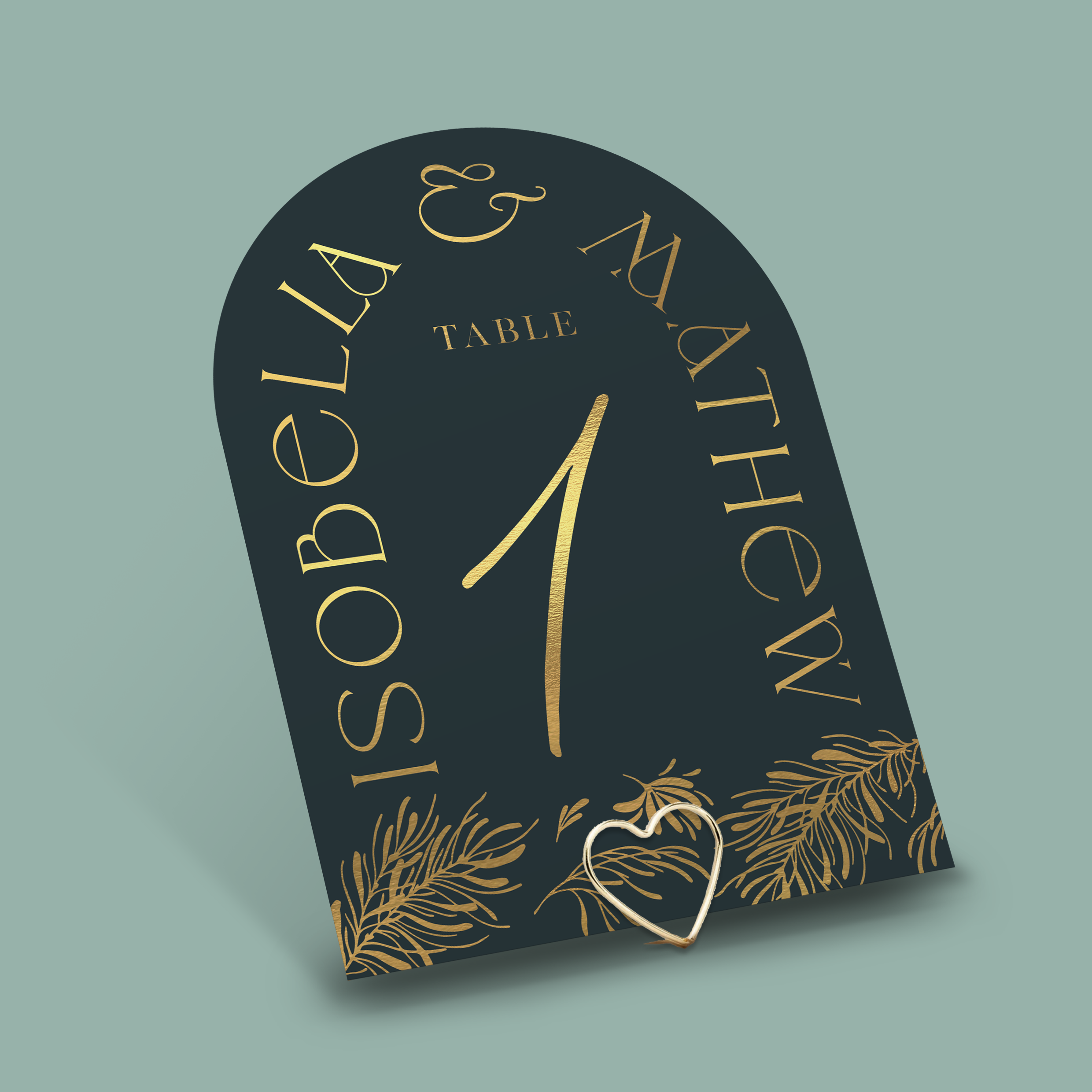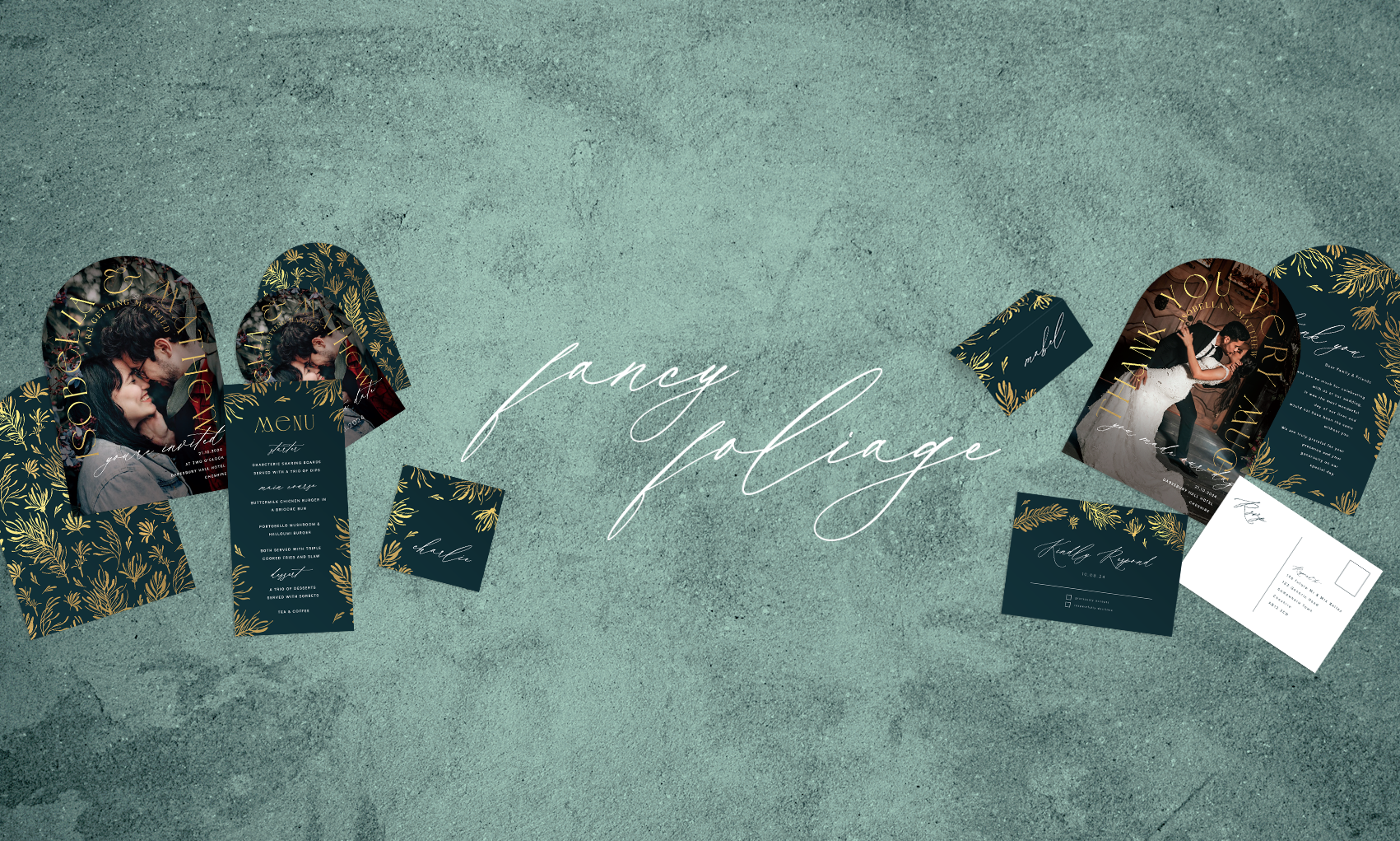 This elegant wedding suite beautifully blends contemporary design with timeless romance. The main pieces feature a refined arched edge creating a luxurious and modern design. A subtle foliage motif on the back of the stationery adds organic texture and sophistication.