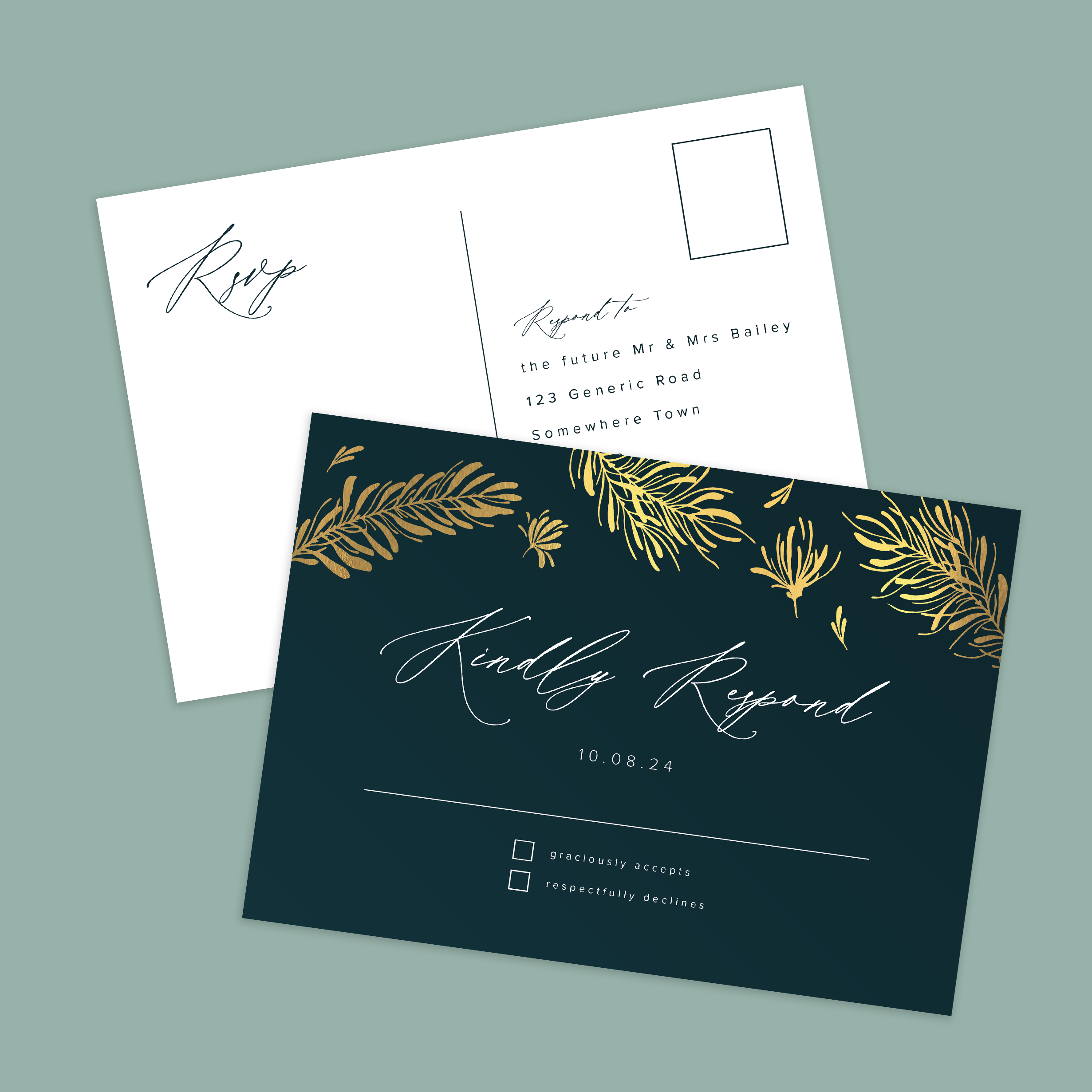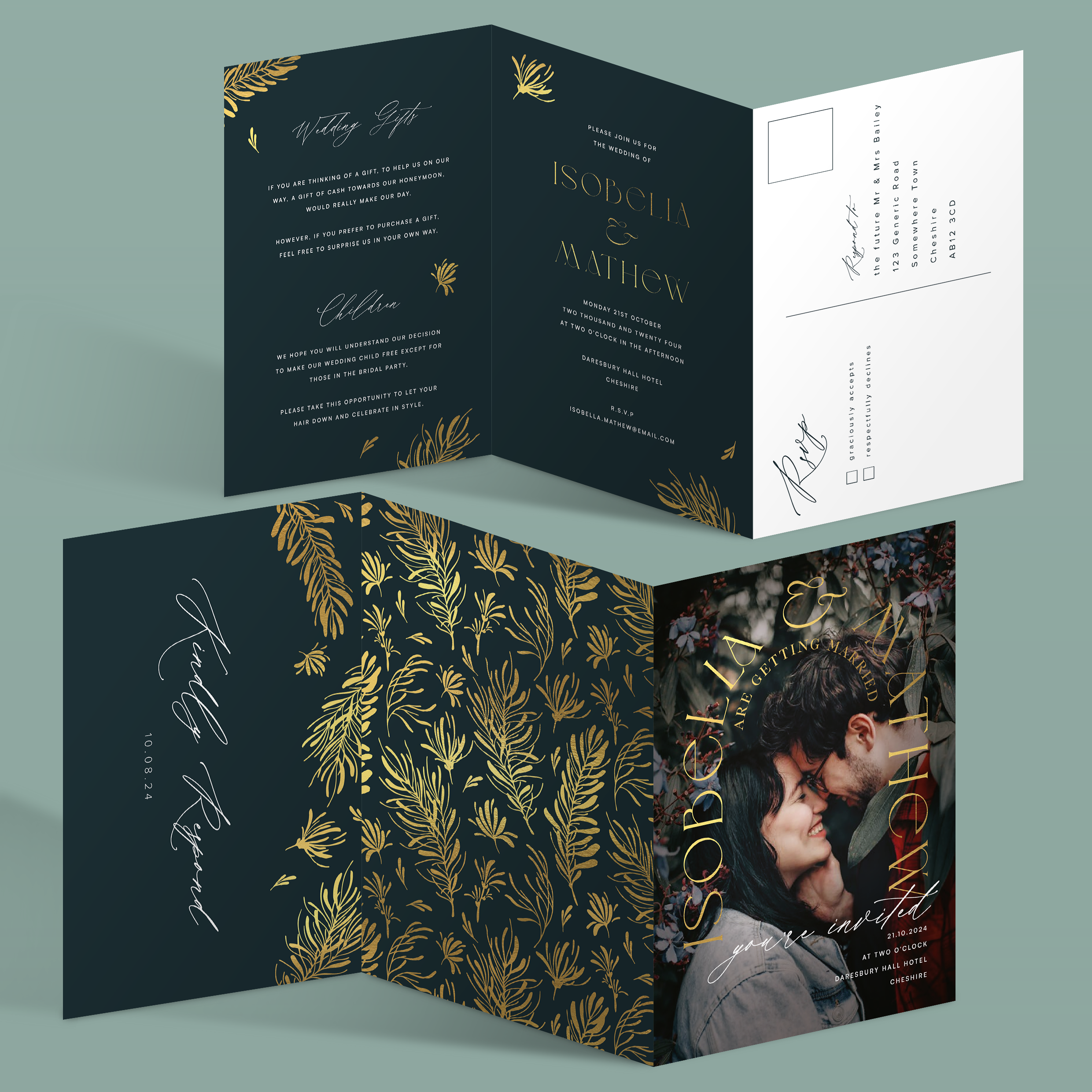 This elegant, z-fold invite also includes and tear off R.S.V.P postcard for your guests to return easily. Also available are gate fold and concertina fold alongside all the expected standard options.