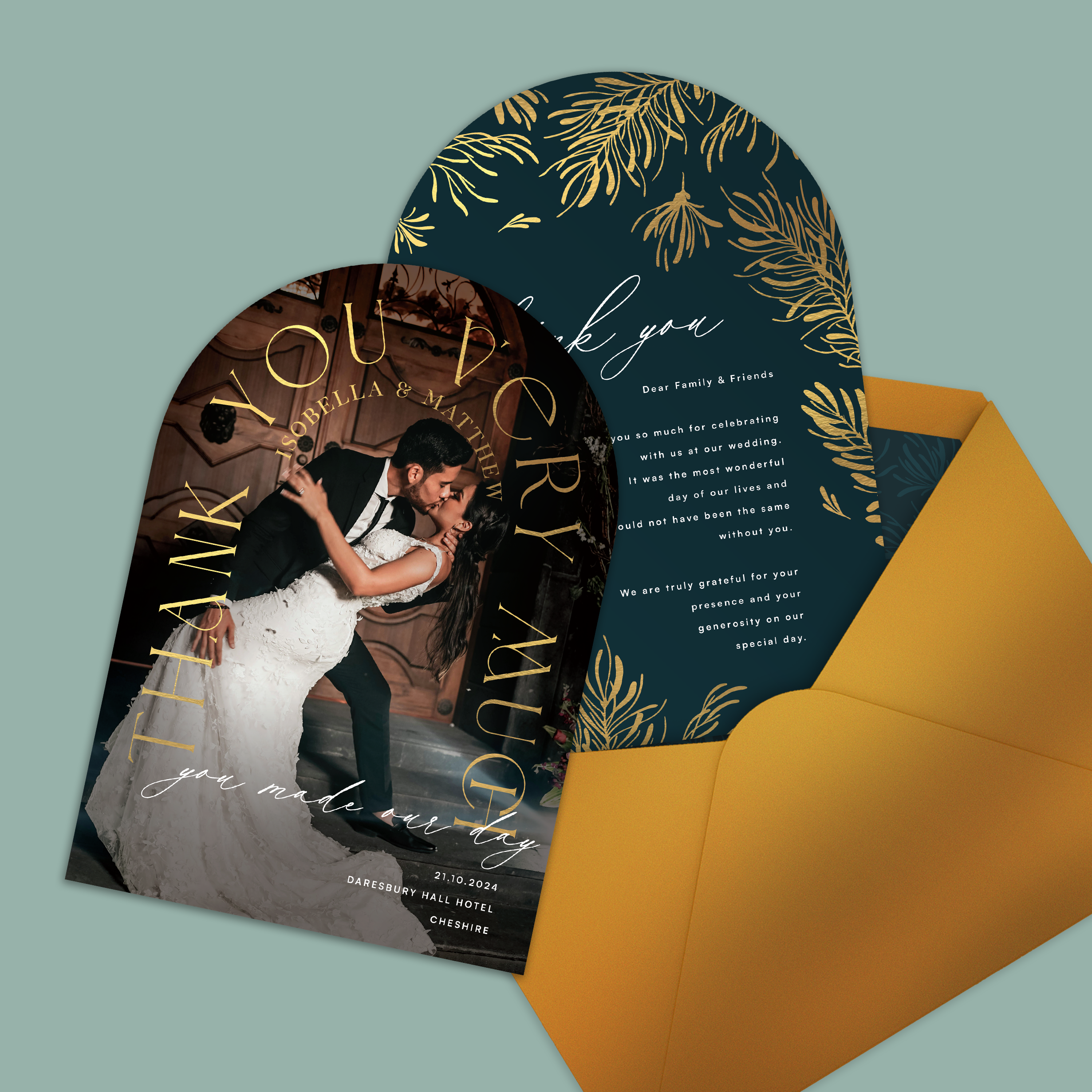 Send a heartfelt message of thanks with my thank you cards that feature a treasured memory from your special day. Available in any size, with a choice of flat or folded designs and will arrive with envelopes in a complimentary colour.