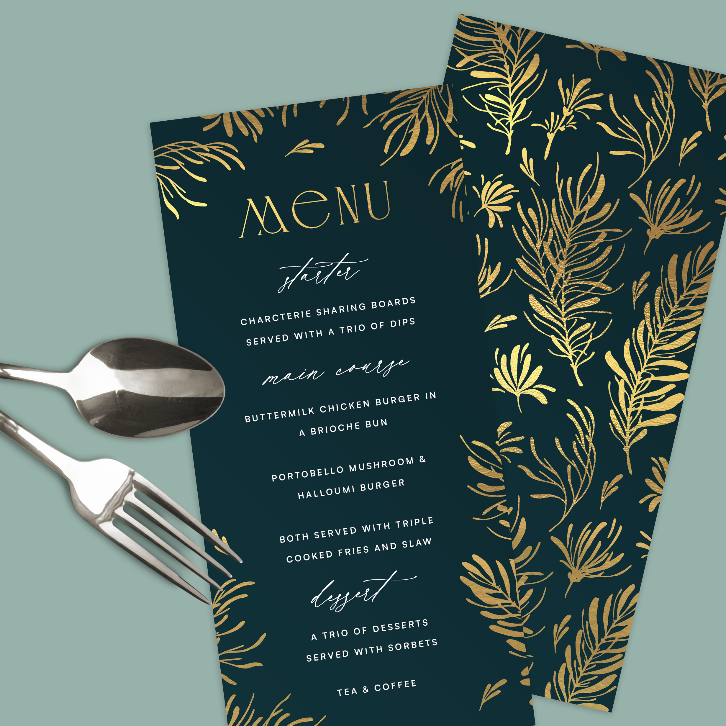 Perfectly in line with the rest of the suite, this menu can have text on both sides if your menu has more text, such as a drinks menu or further options. I can also provide separate menu's for vegan or children's menus.