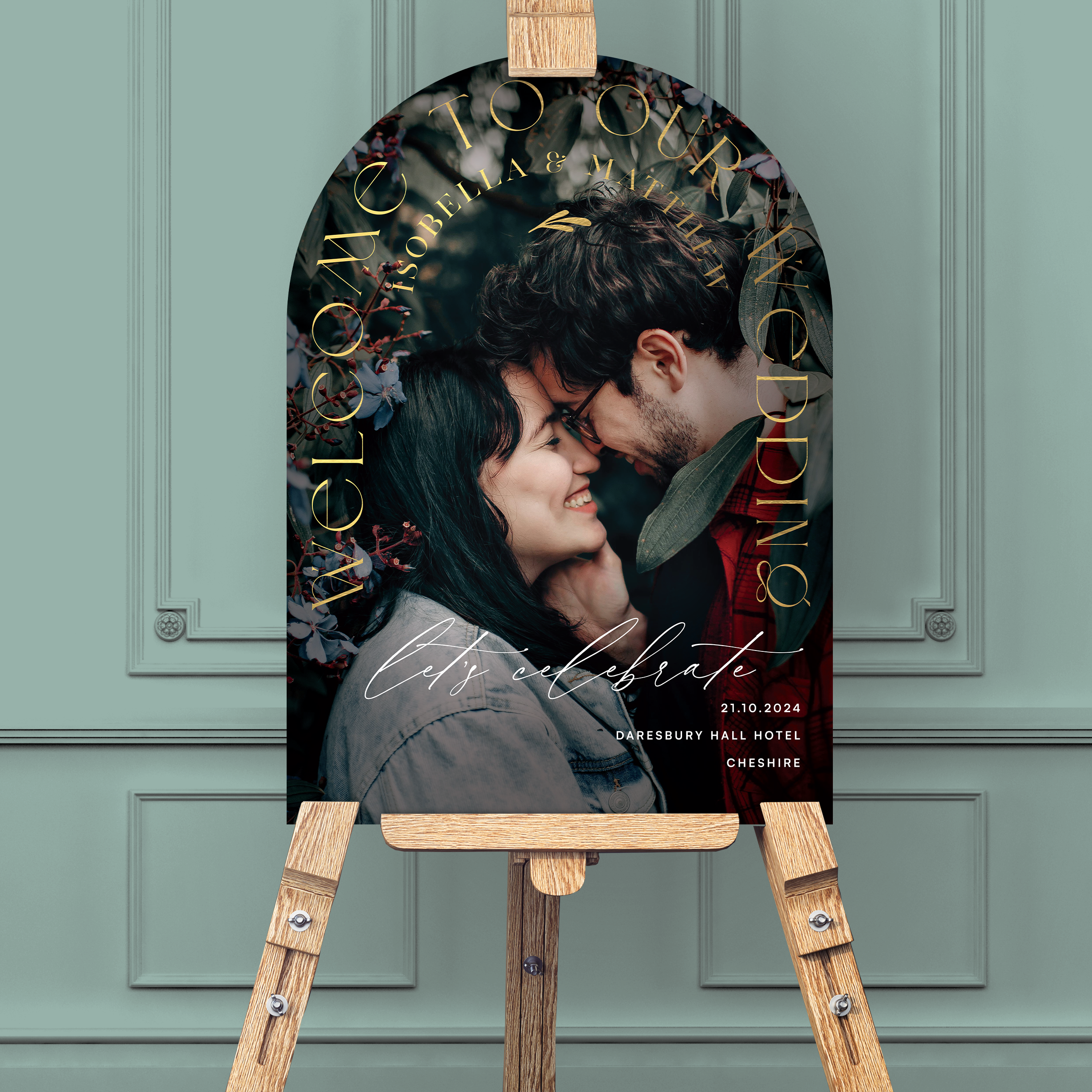 Make a statement with a beautiful sign board to welcome your guests. Available in a choice of boards and sizes, these sign boards will continue your aesthetic and look amazing when welcoming your guests outside your chosen venue. Please note, foil elements on my signboards will be a faux foil effect unless otherwise requested.