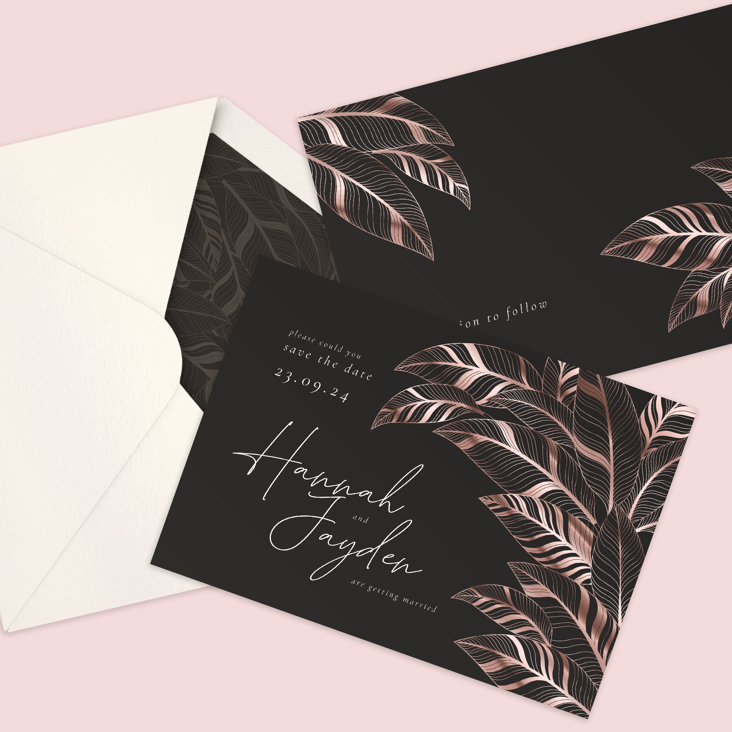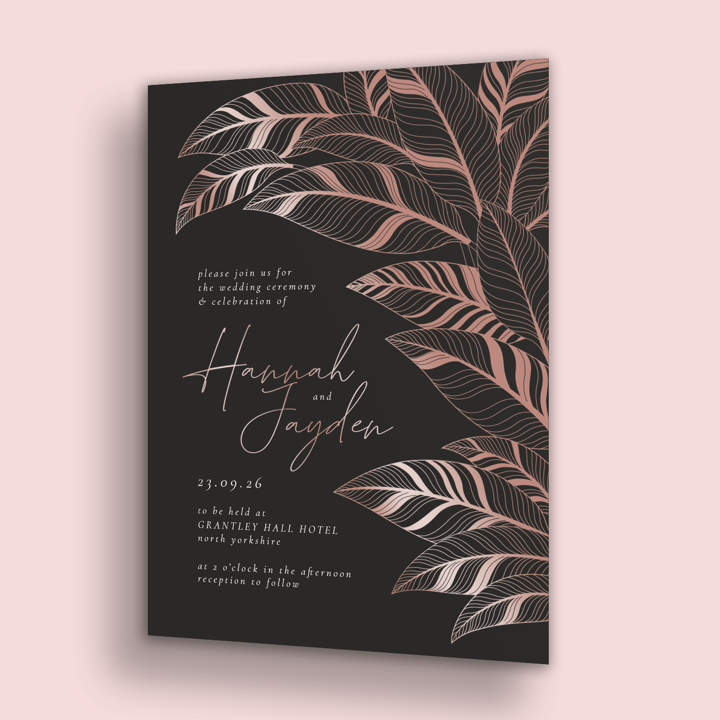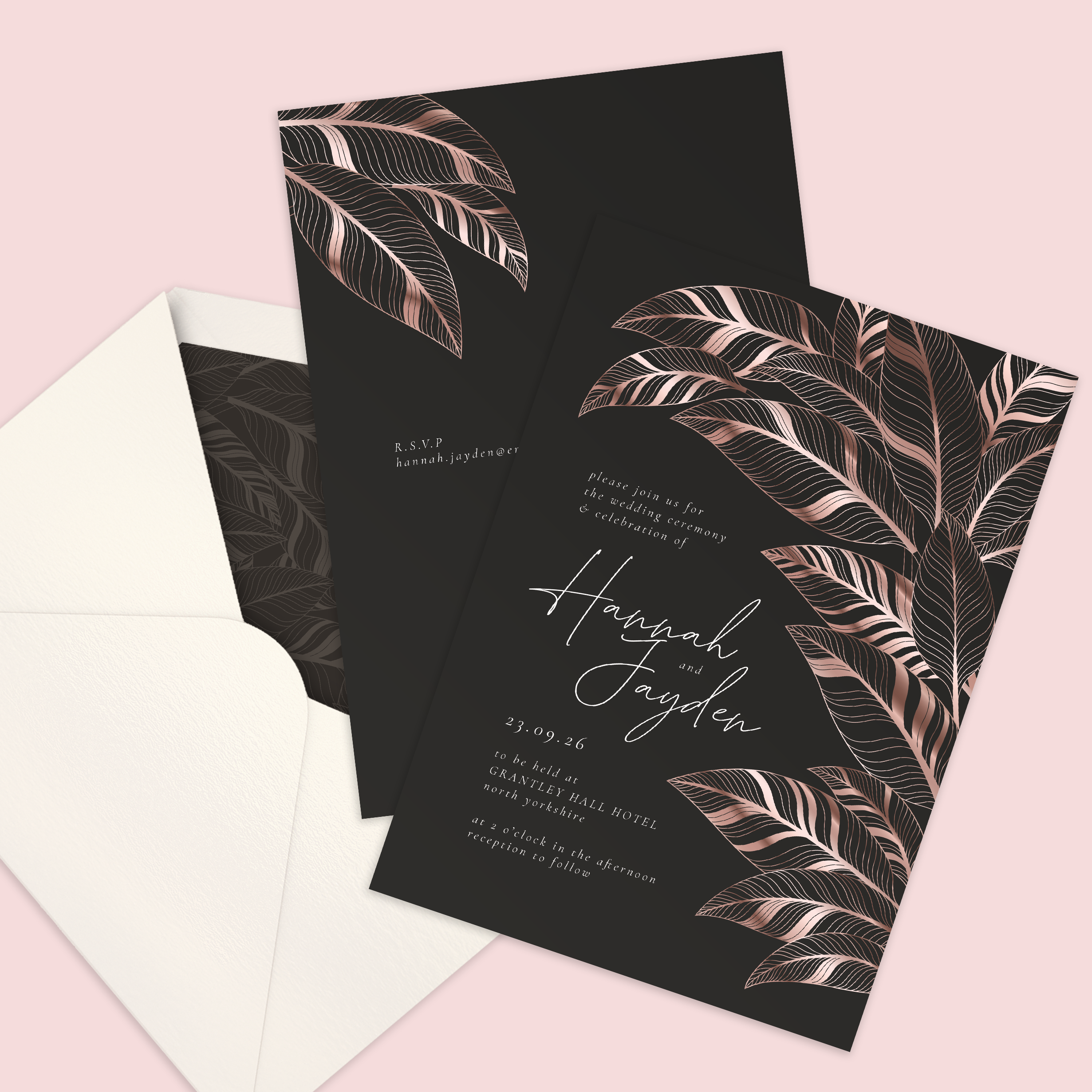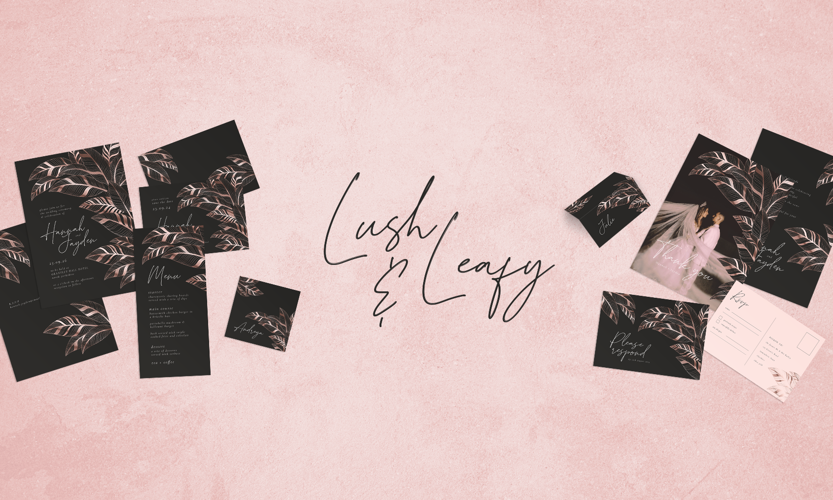 Lush & Leafy is a tropical-inspired wedding suite featuring metallic foil accents and leafy motifs. Perfect for modern celebrations with a touch of glamour, this design brings together natural beauty and refined elegance.