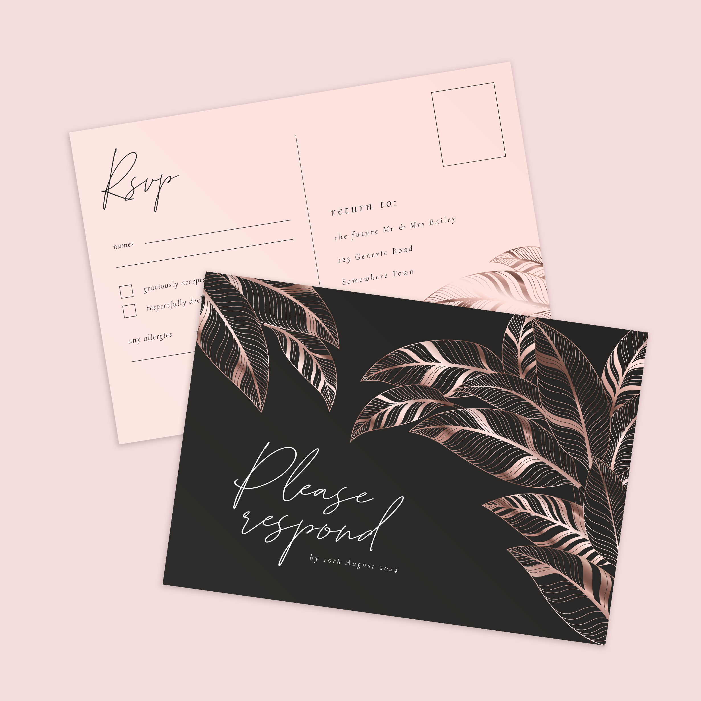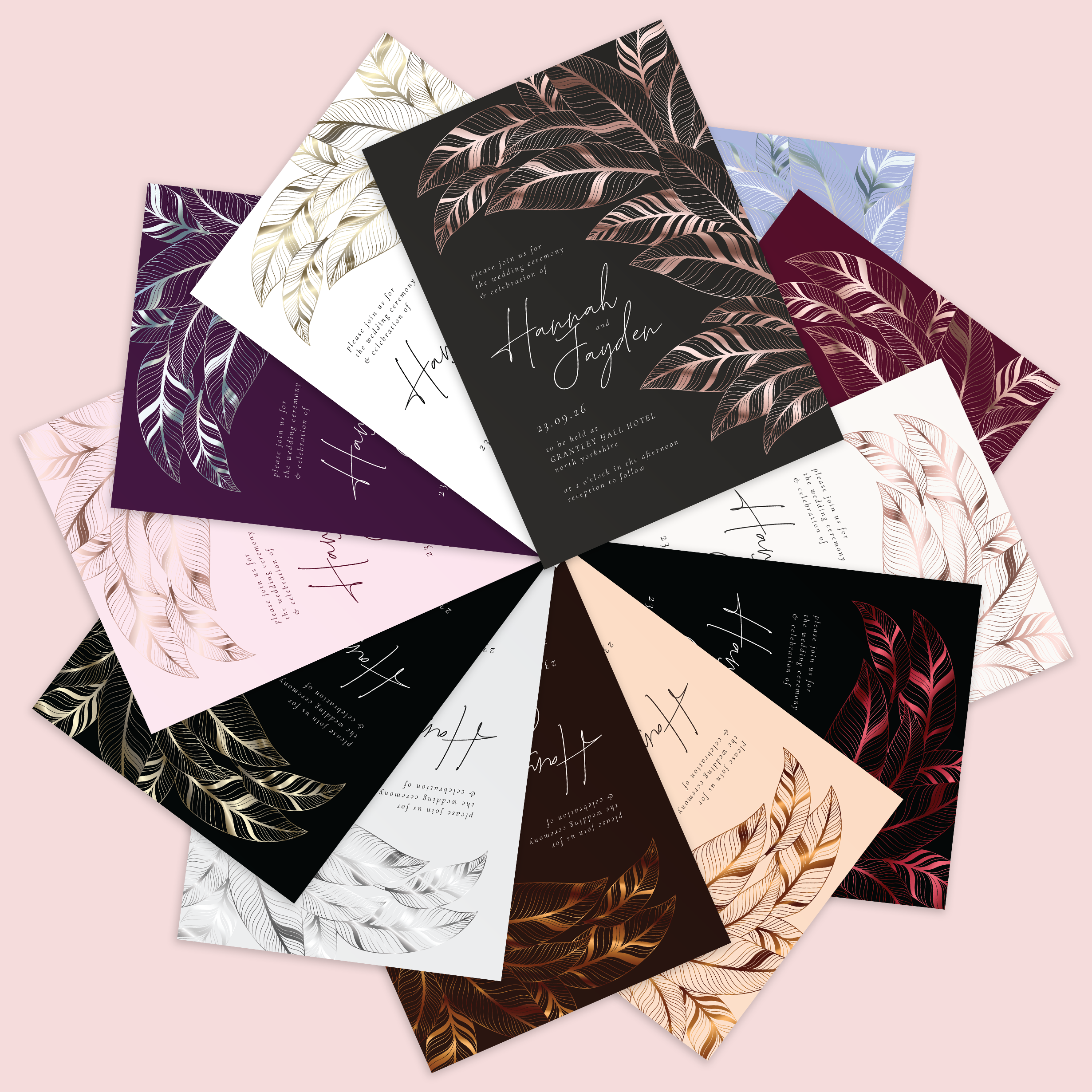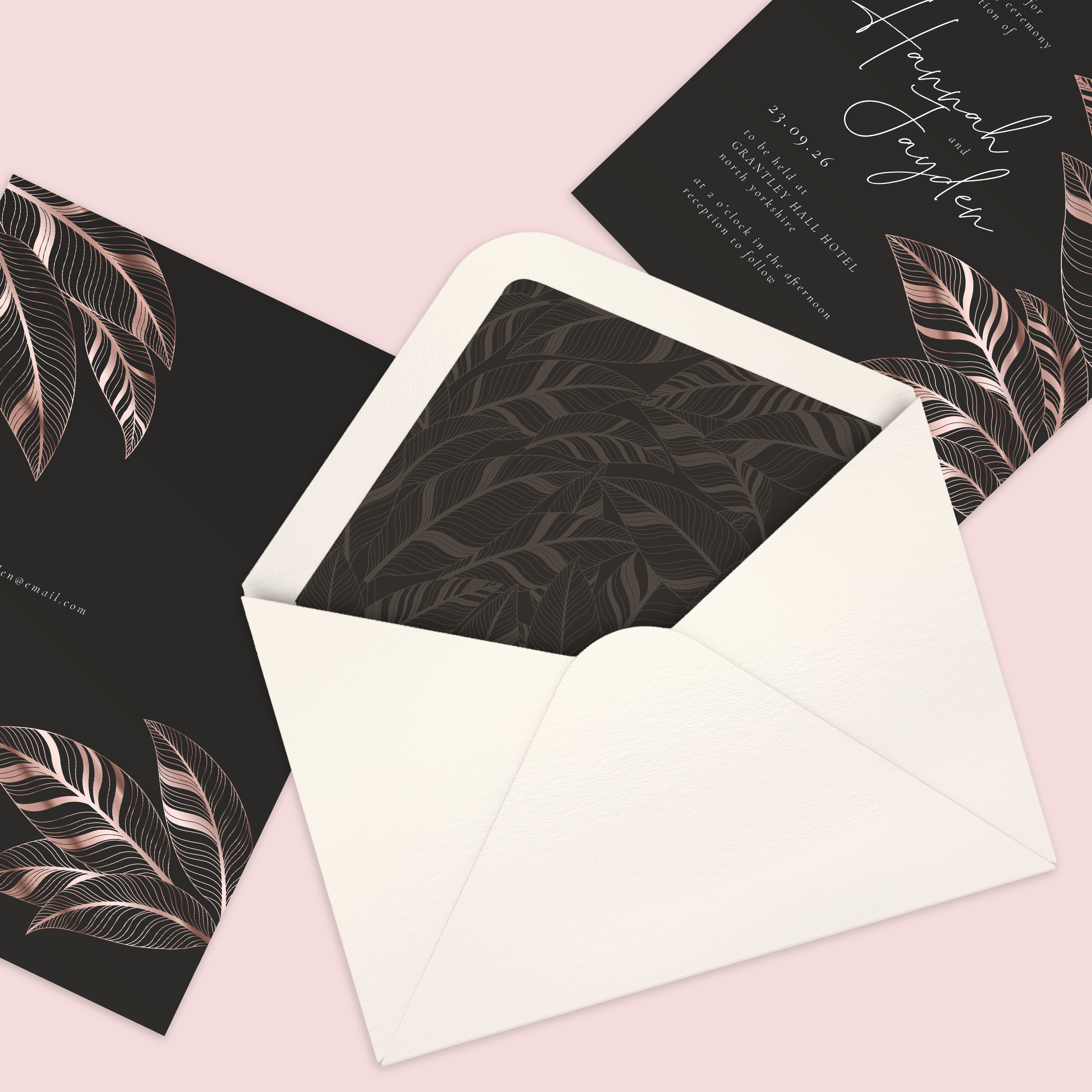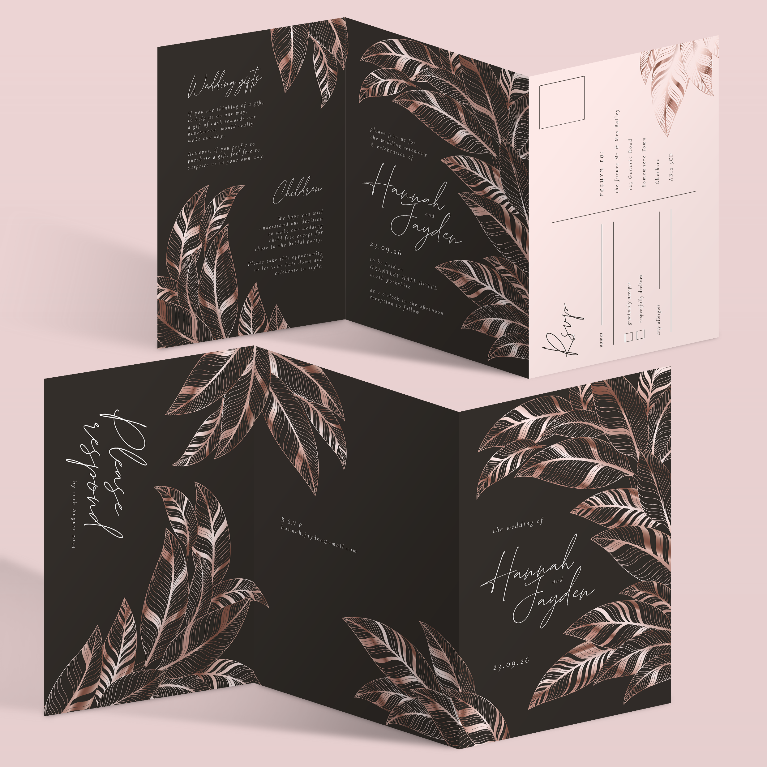 Lush & Leafy is a tropical-inspired wedding suite featuring metallic foil accents and leafy motifs. Perfect for modern celebrations with a touch of glamour, this design brings together natural beauty and refined elegance.