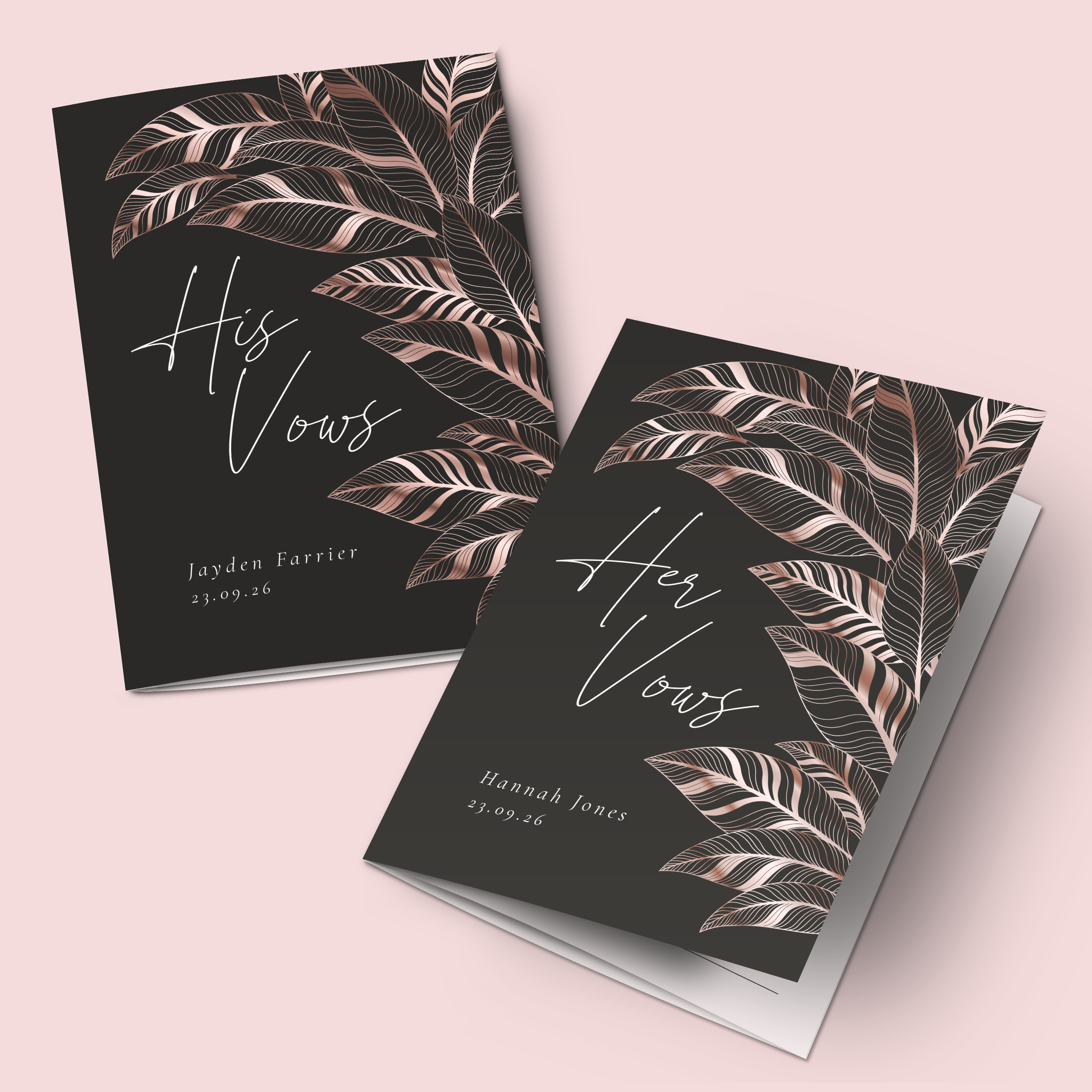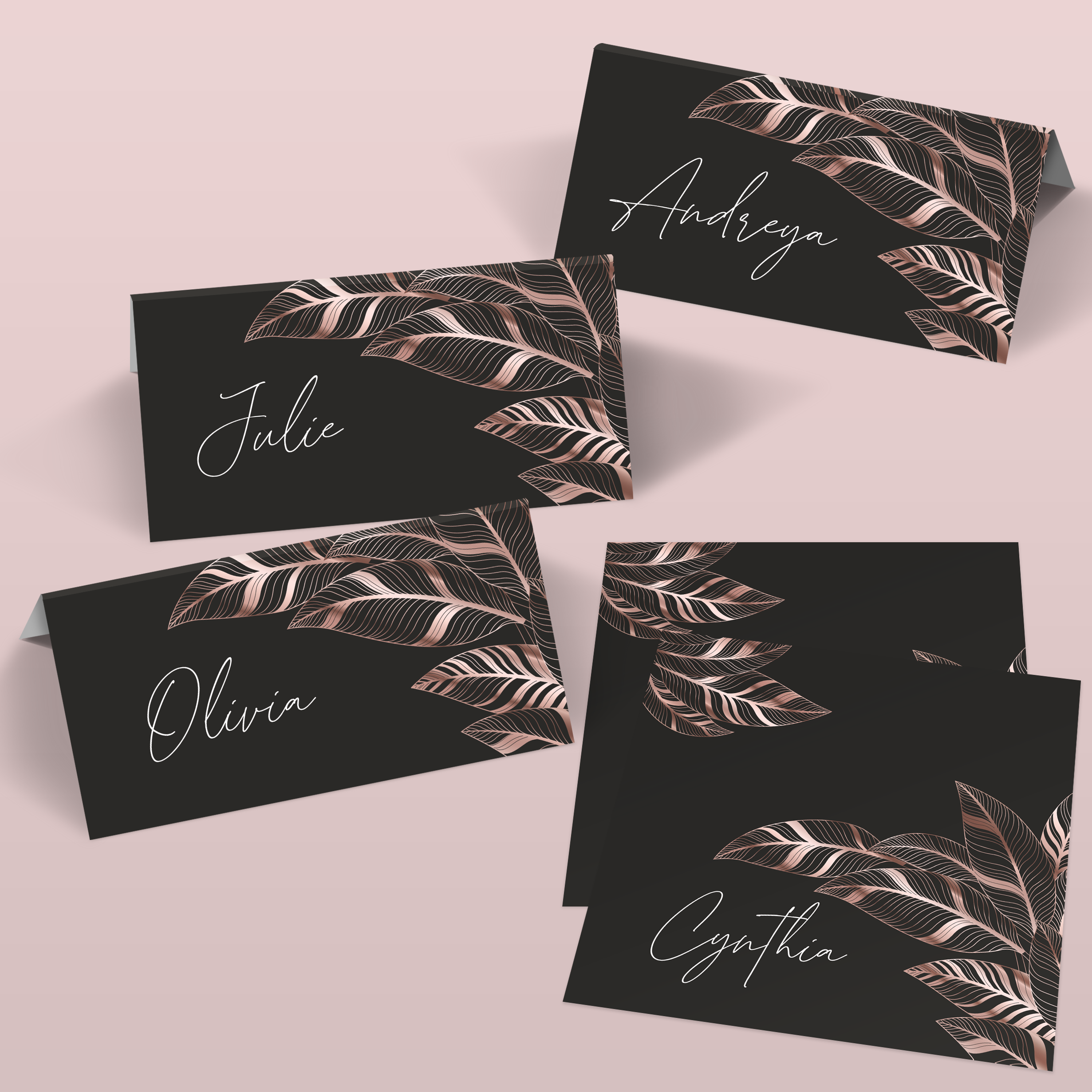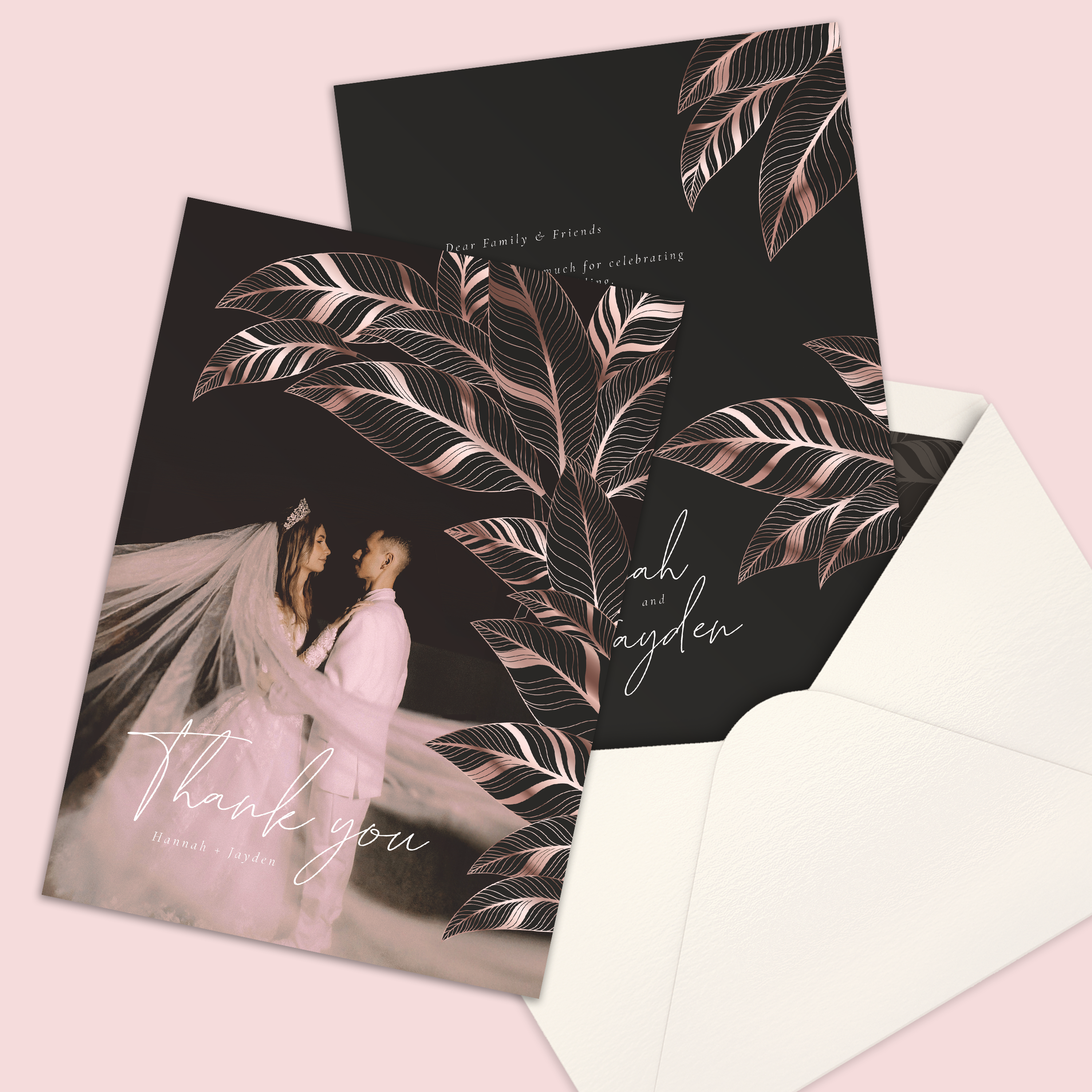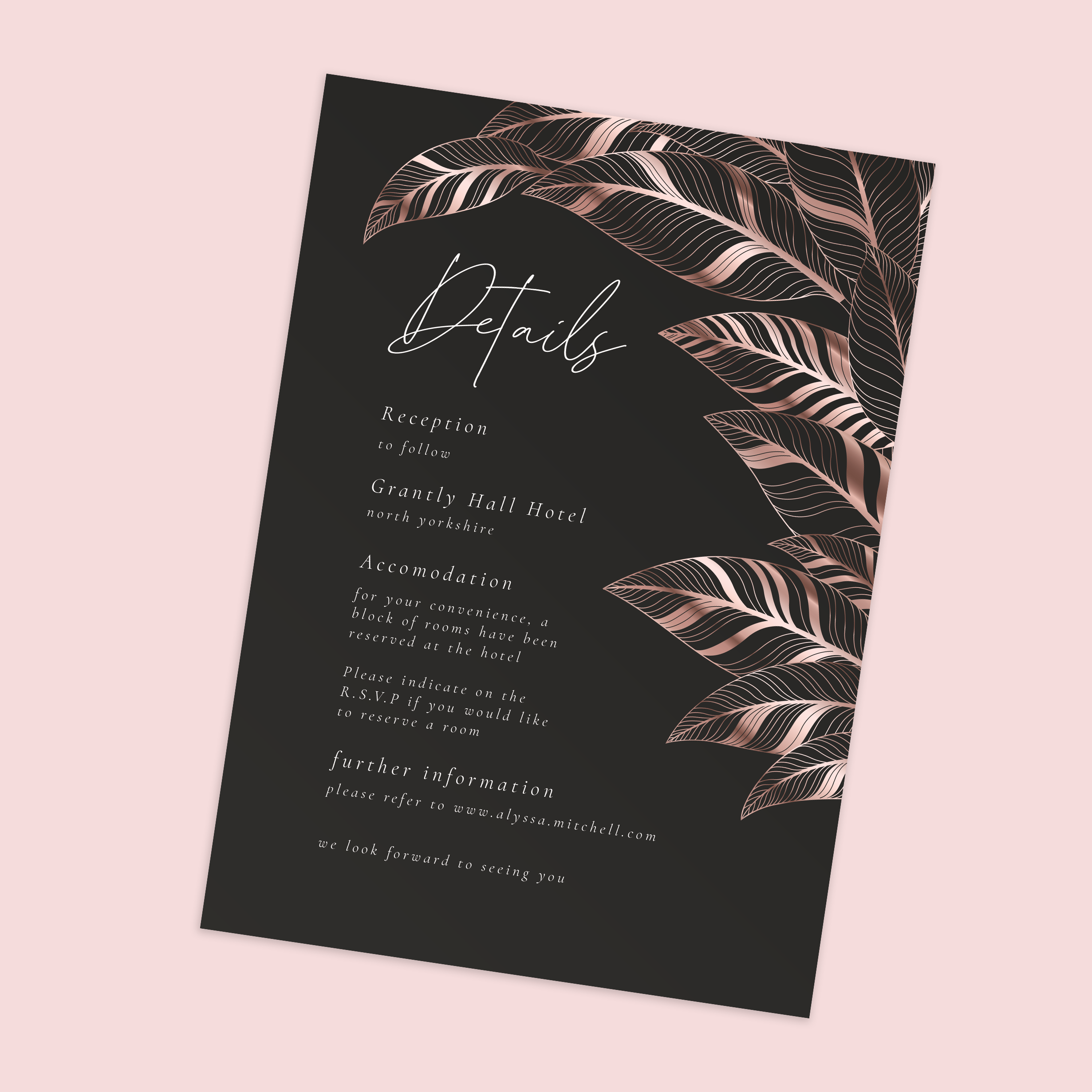 Lush & Leafy is a tropical-inspired wedding suite featuring metallic foil accents and leafy motifs. Perfect for modern celebrations with a touch of glamour, this design brings together natural beauty and refined elegance.