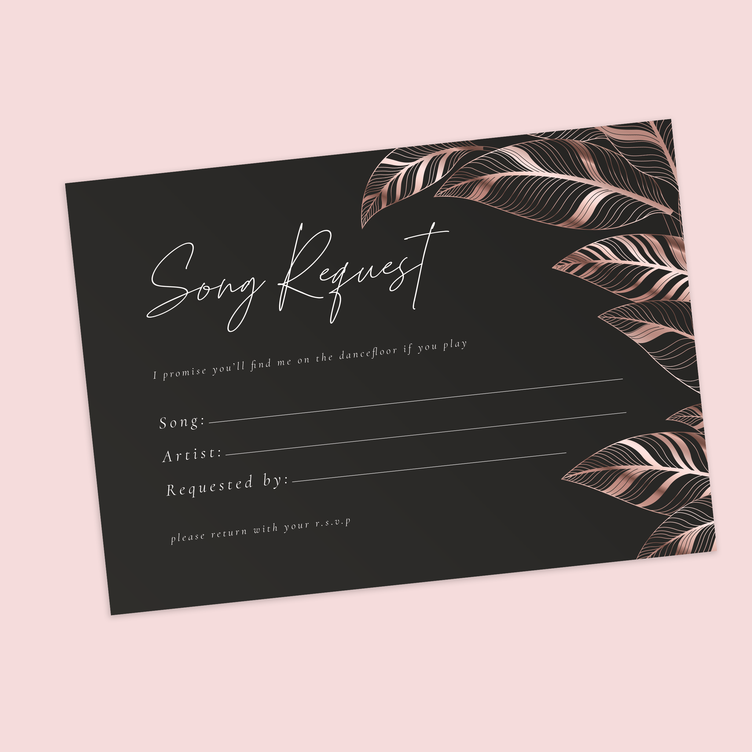 Song request cards allow guests to contribute to the celebration by requesting their favourite music and will add a personal touch to the playlist. These cards ensure the dance floor stays lively and full of memorable moments.