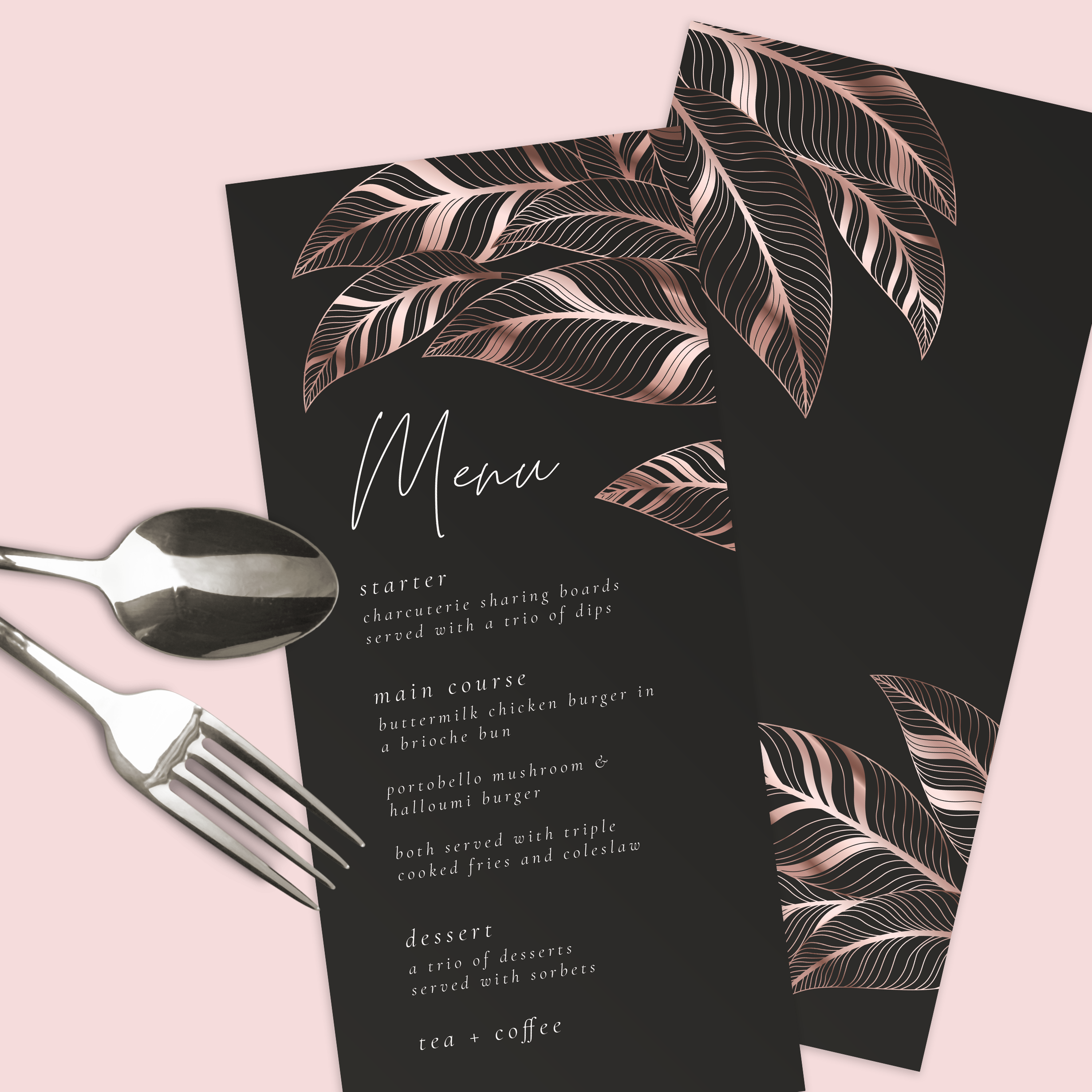 Perfectly in line with the rest of the suite, this menu can have text on both sides if your menu has more text, such as a drinks menu or further options. I can also provide separate menu's for vegan or children's menus.