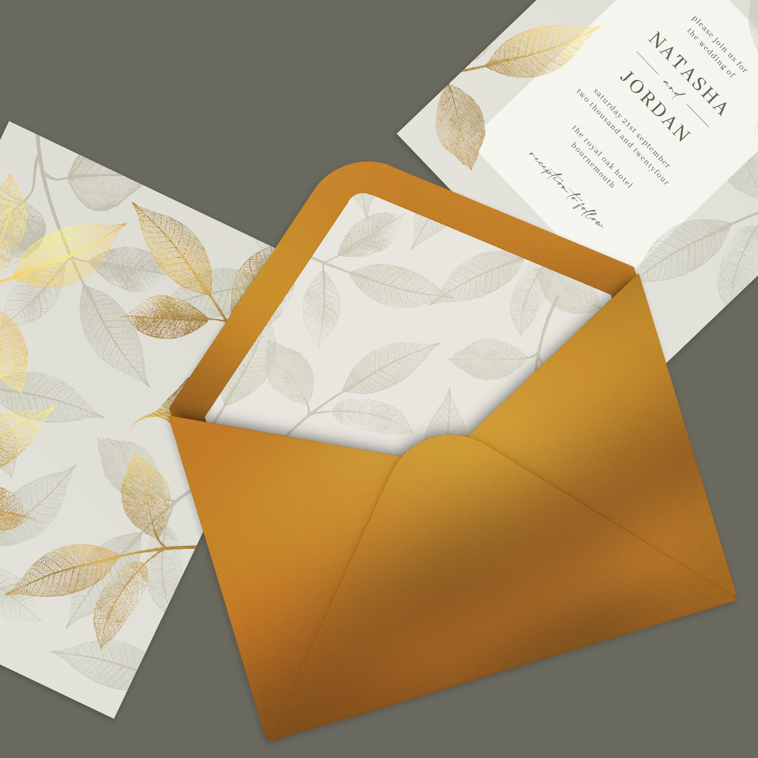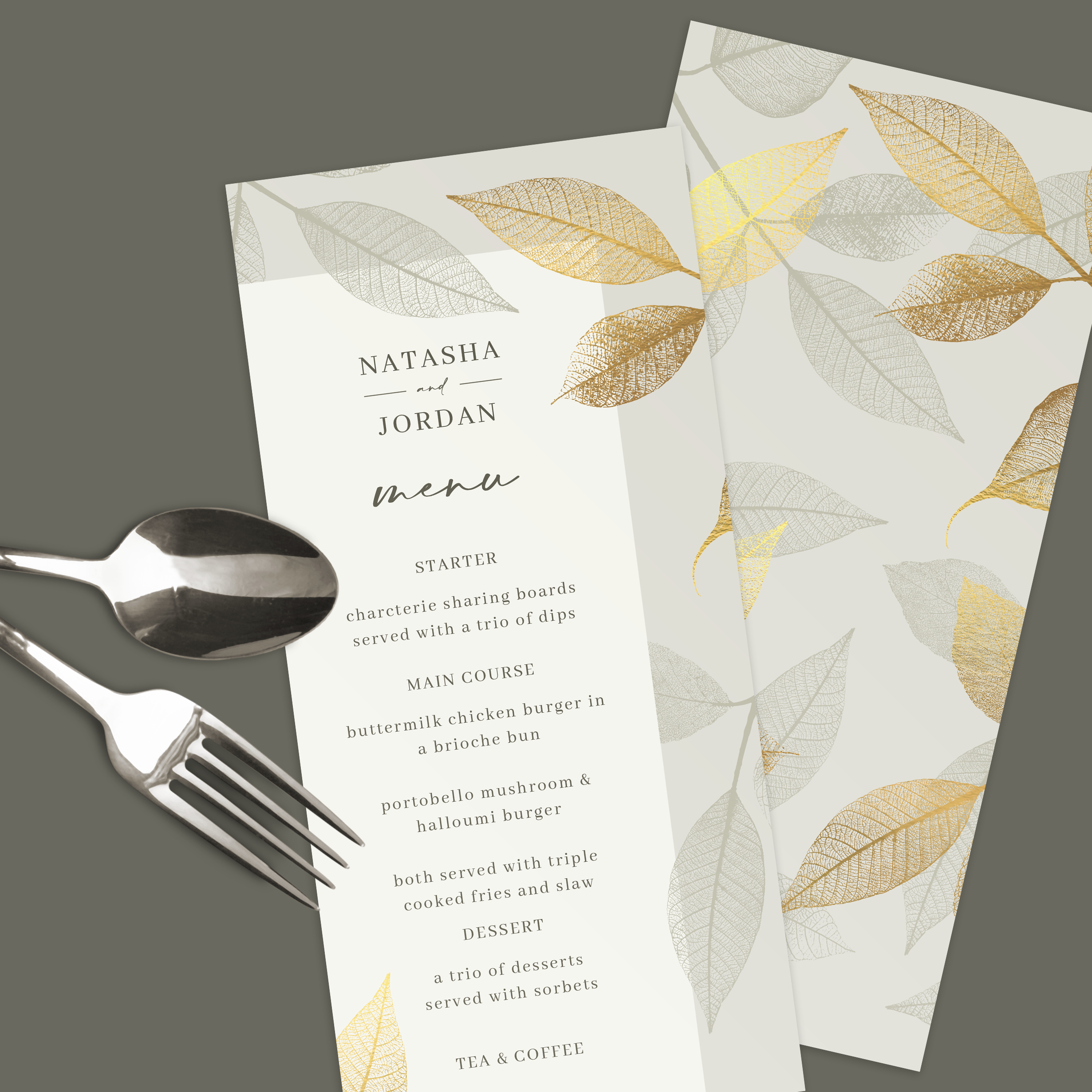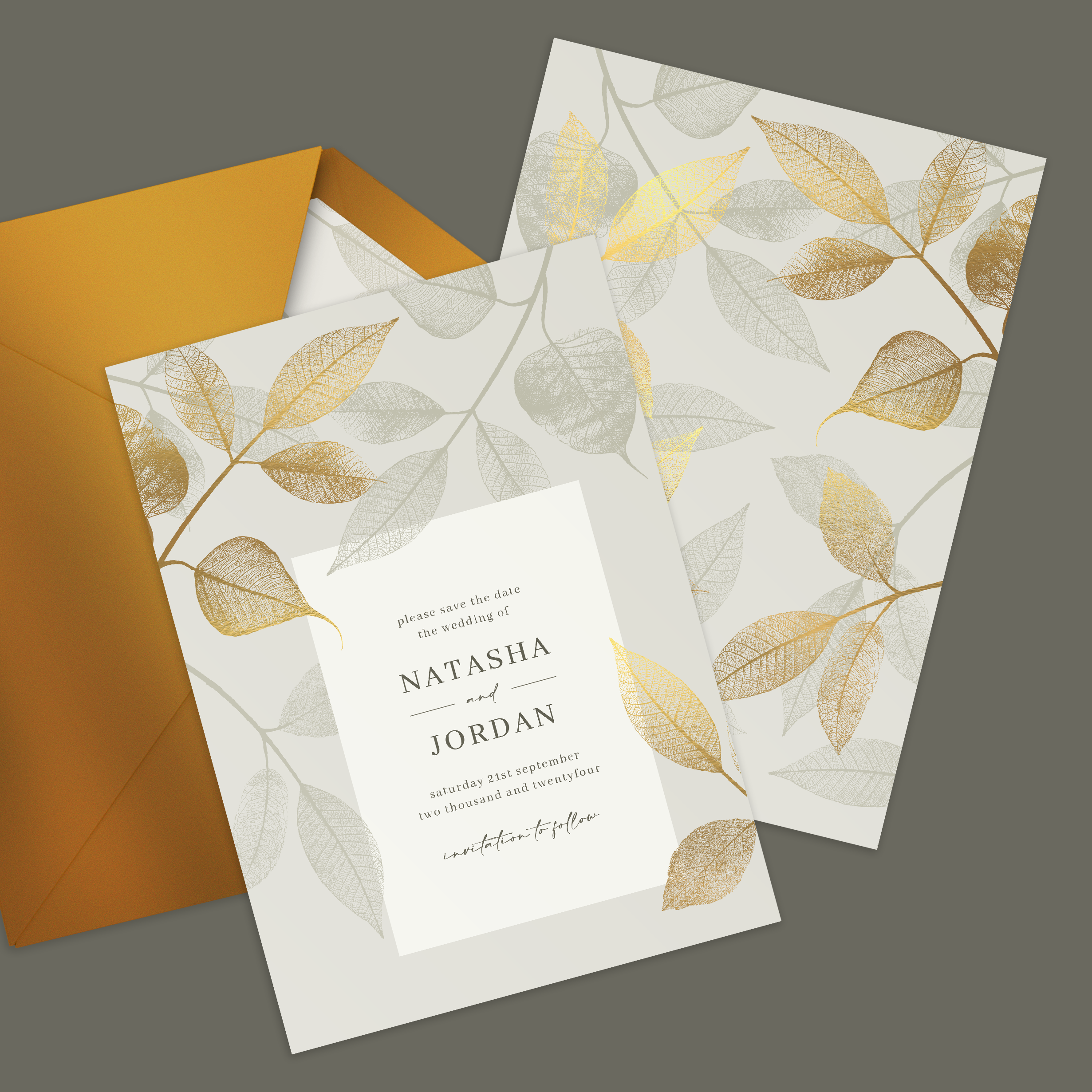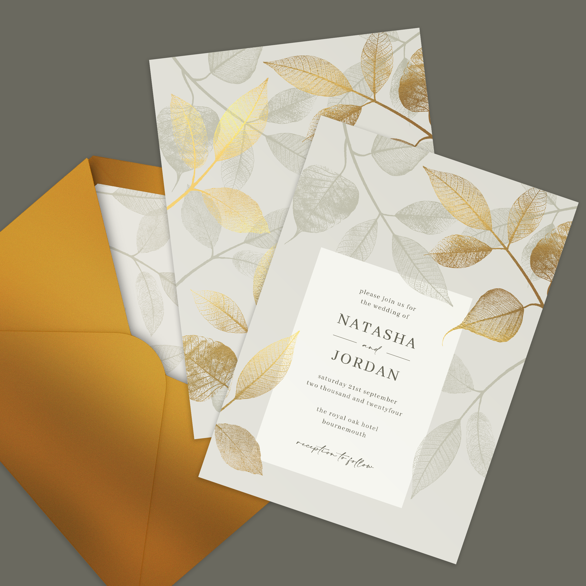 Perfect for autumn weddings, this design features a real foil leaf skeleton design. This earthy, nature inspired wedding suite is both elegant and modern and available in a multitude of colours to match your theme.