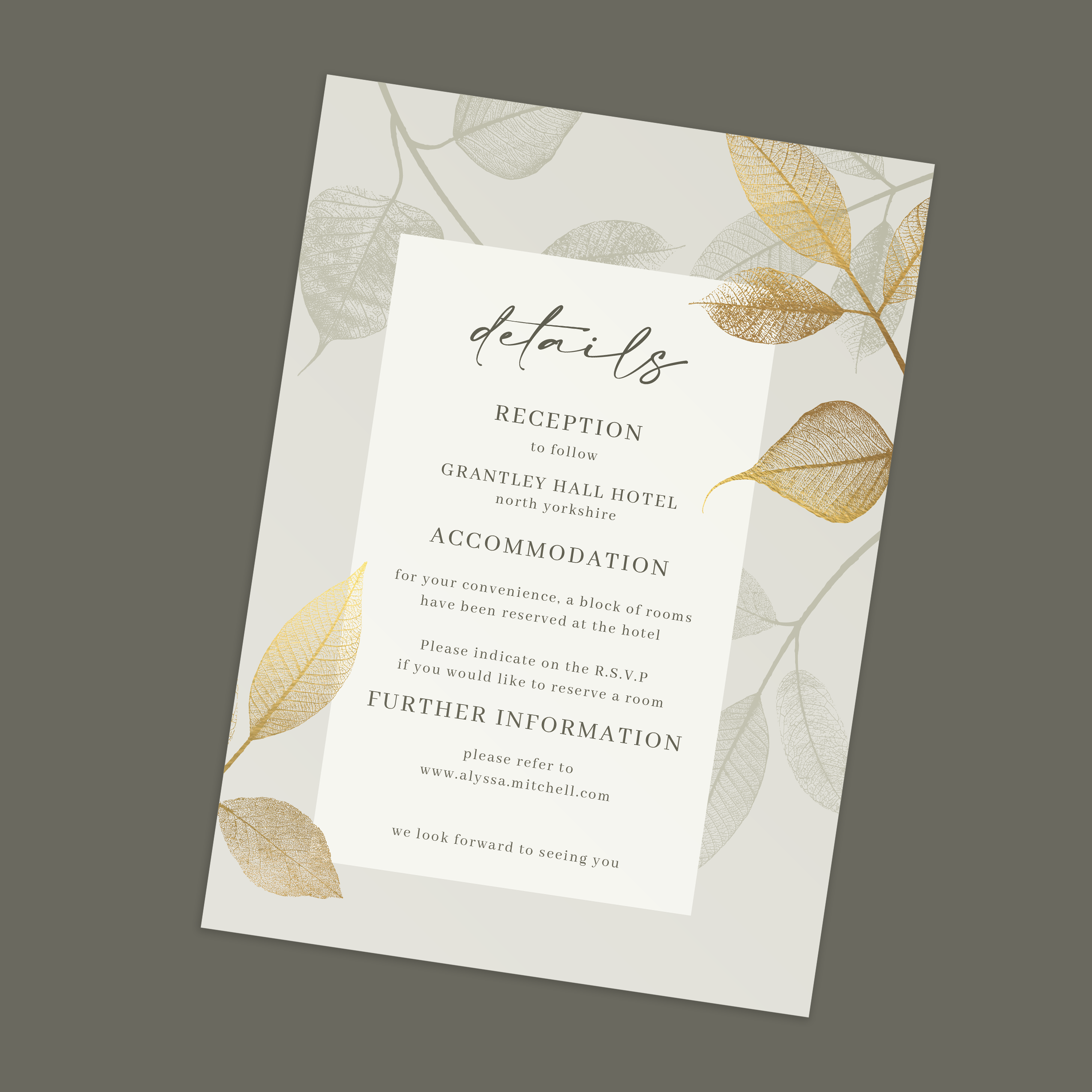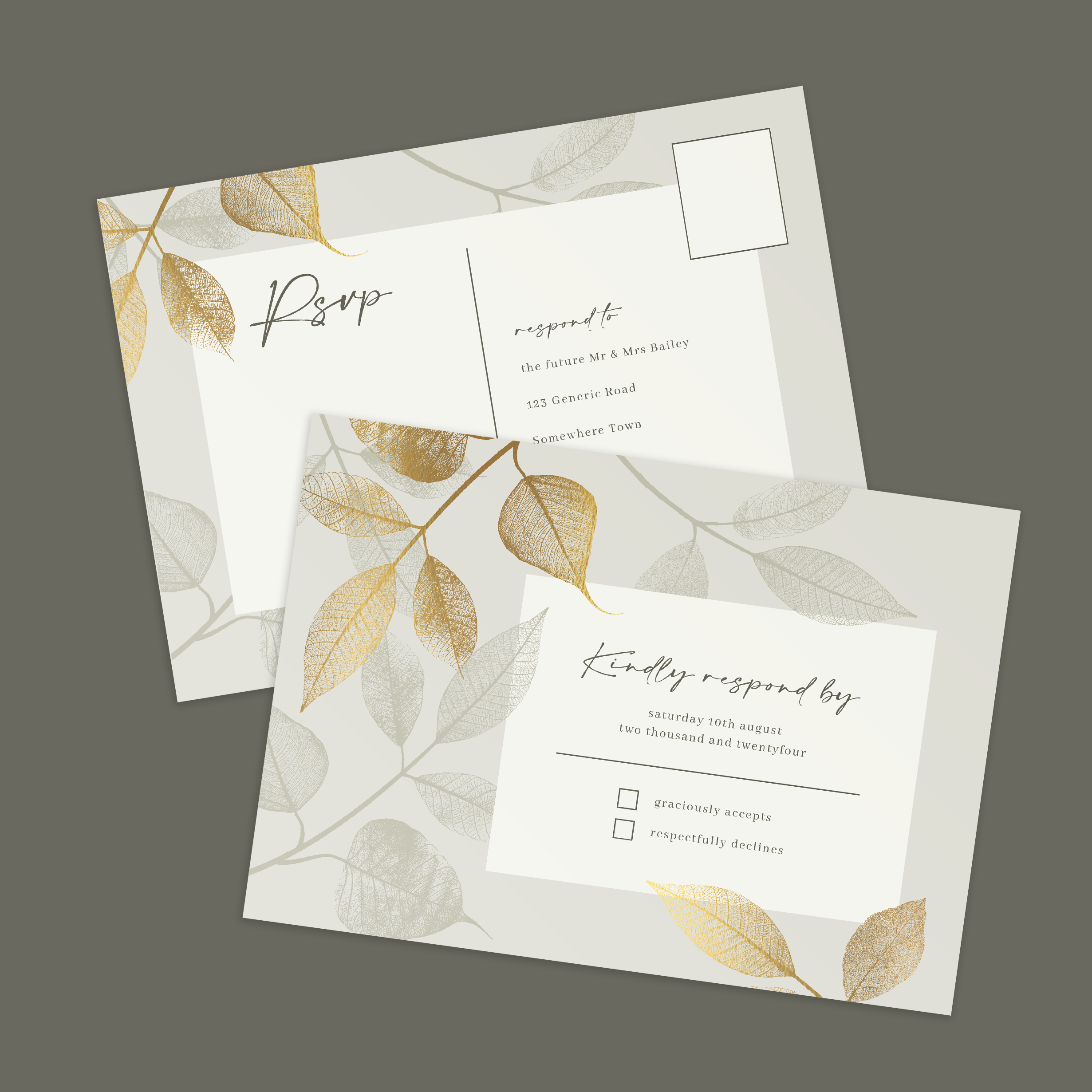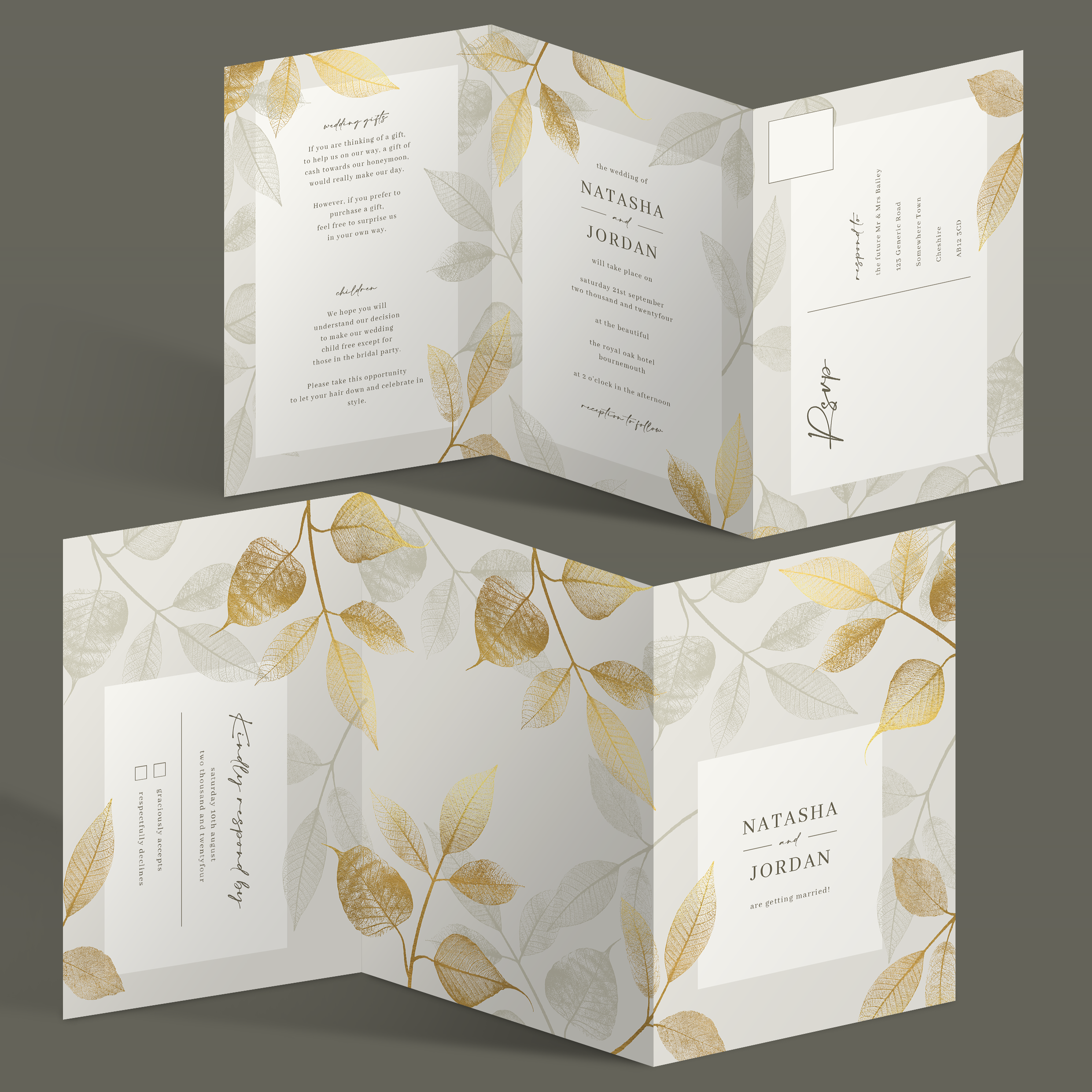Perfect for autumn weddings, this design features a real foil leaf skeleton design. This earthy, nature inspired wedding suite is both elegant and modern and available in a multitude of colours to match your theme.