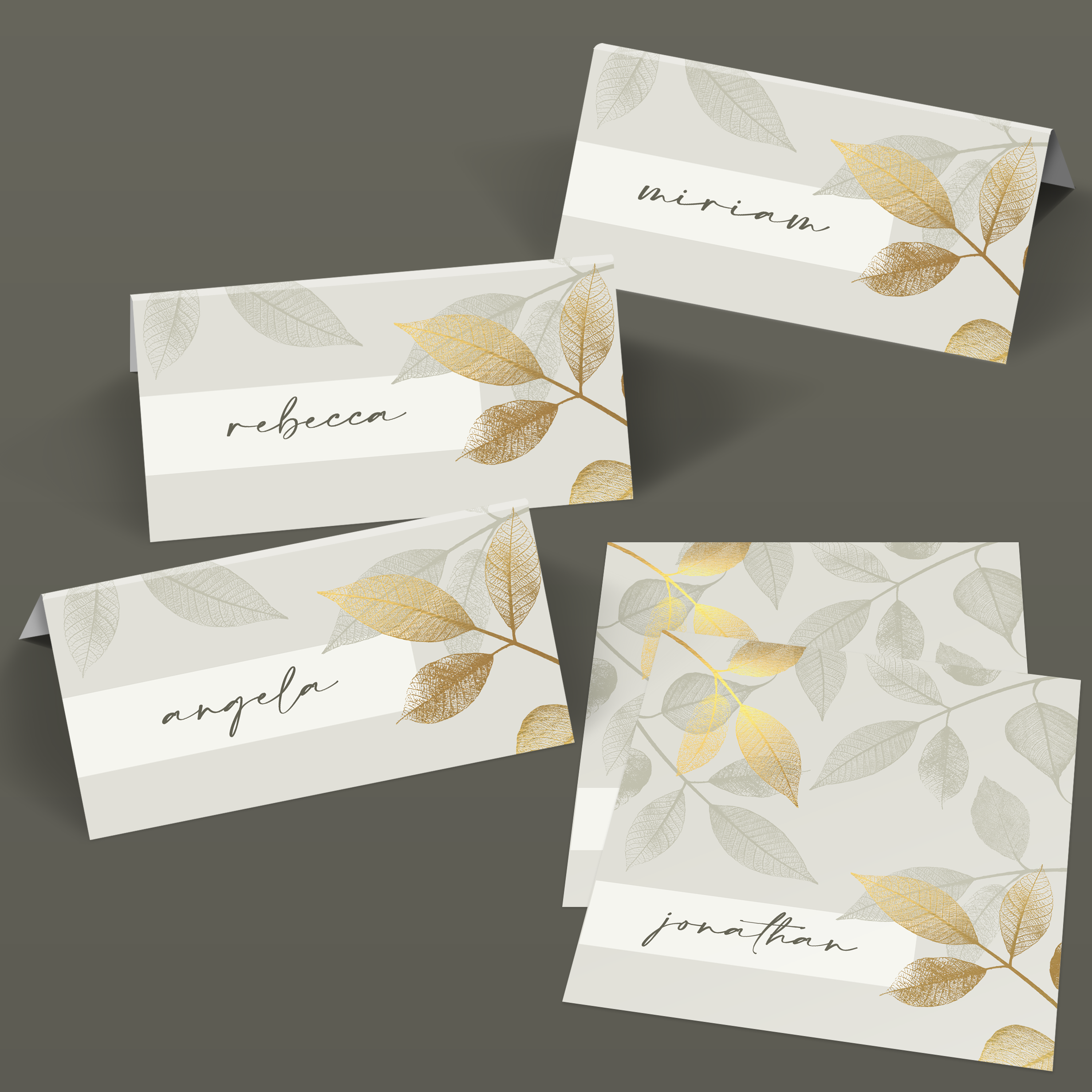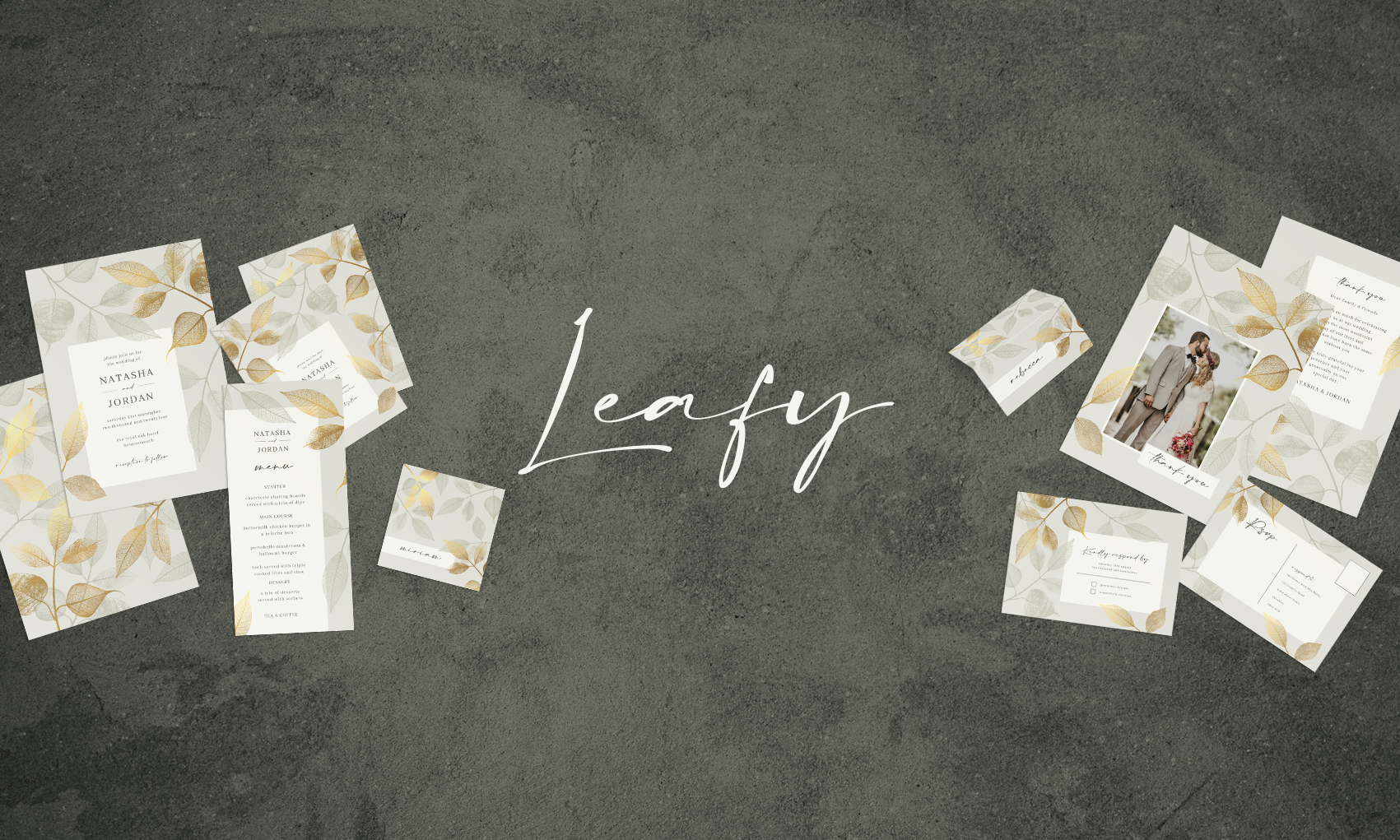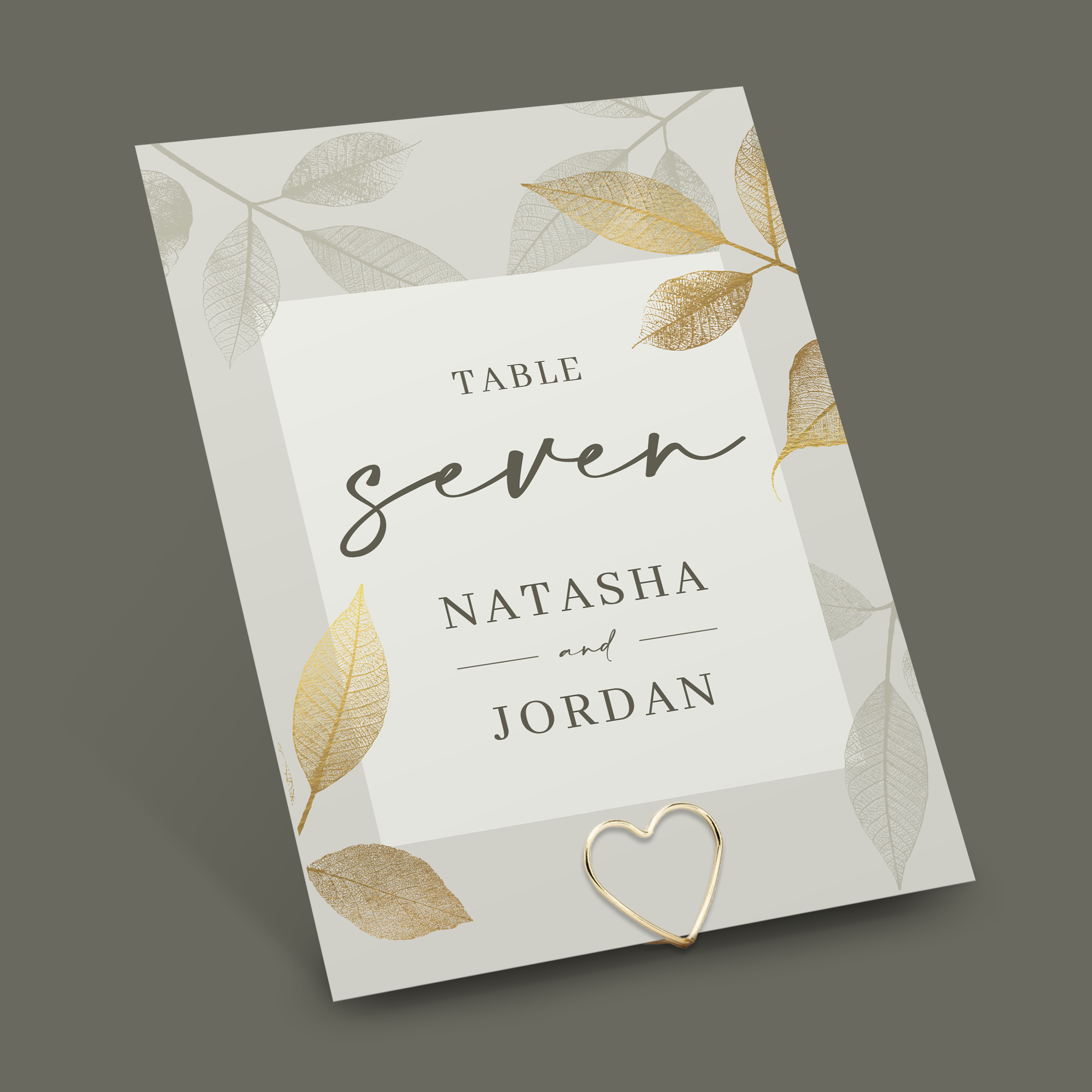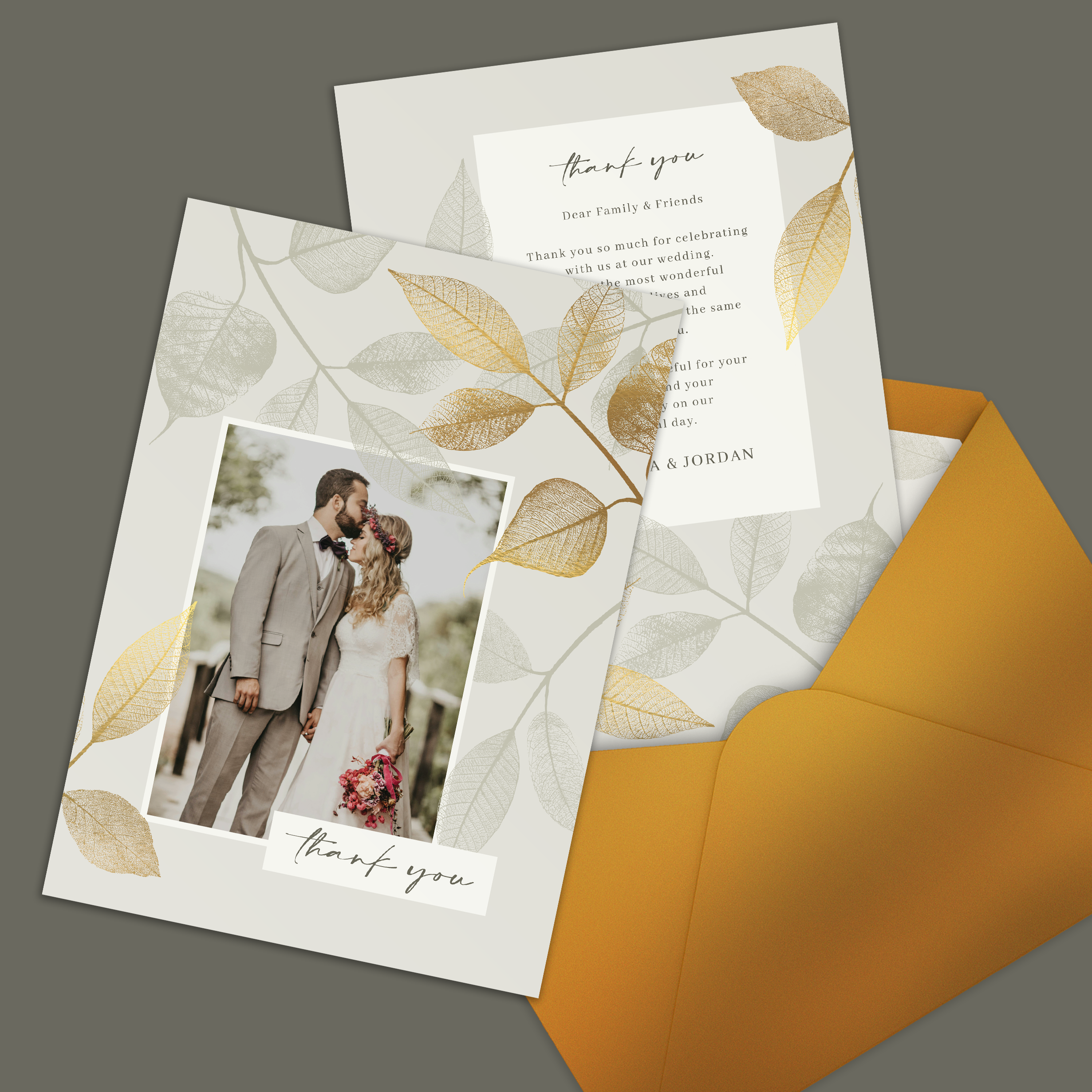 Perfect for autumn weddings, this design features a real foil leaf skeleton design. This earthy, nature inspired wedding suite is both elegant and modern and available in a multitude of colours to match your theme.