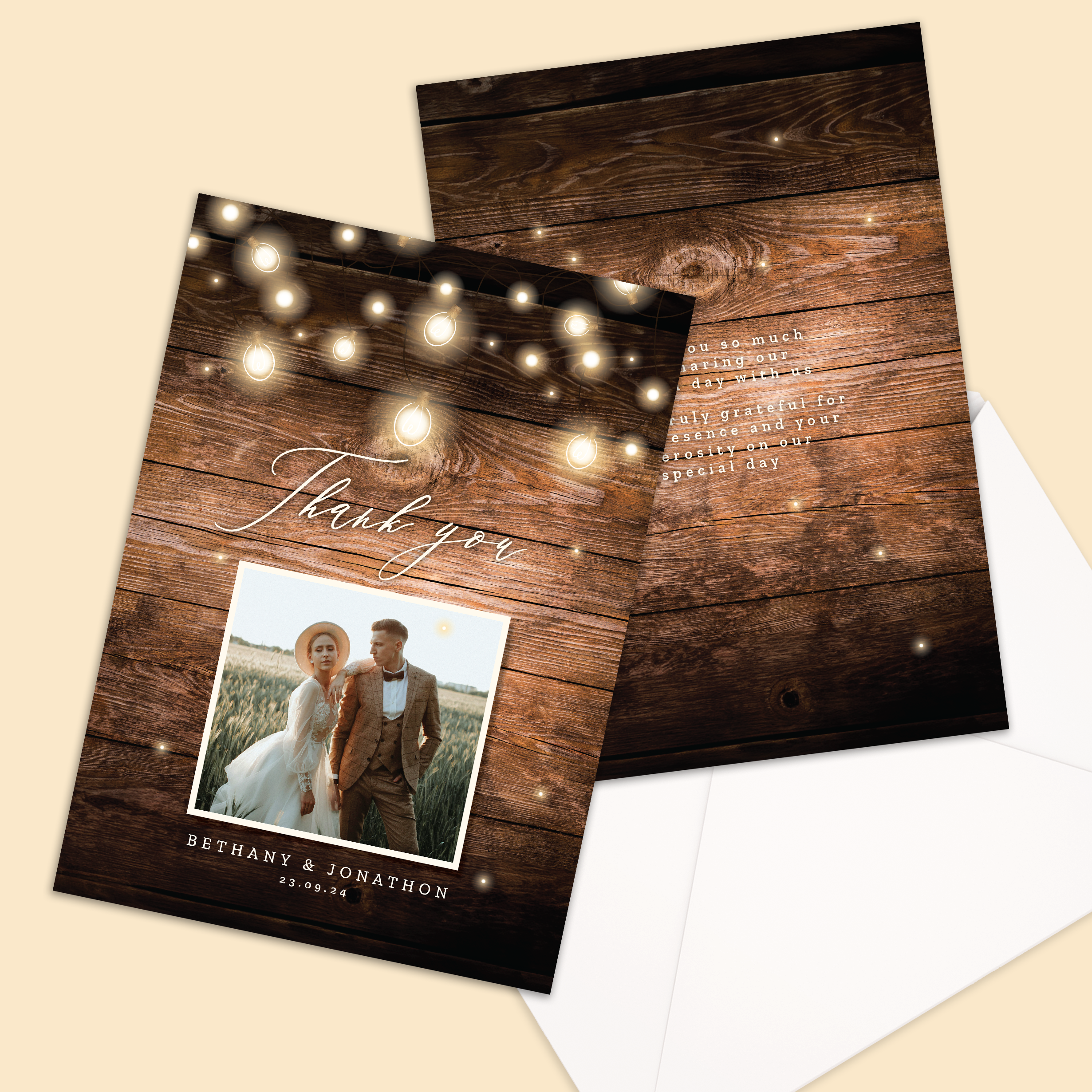 Send a heartfelt message of thanks with my thank you cards that feature a treasured memory from your special day. Available in any size, with a choice of flat or folded designs and will arrive with envelopes in a complimentary colour.