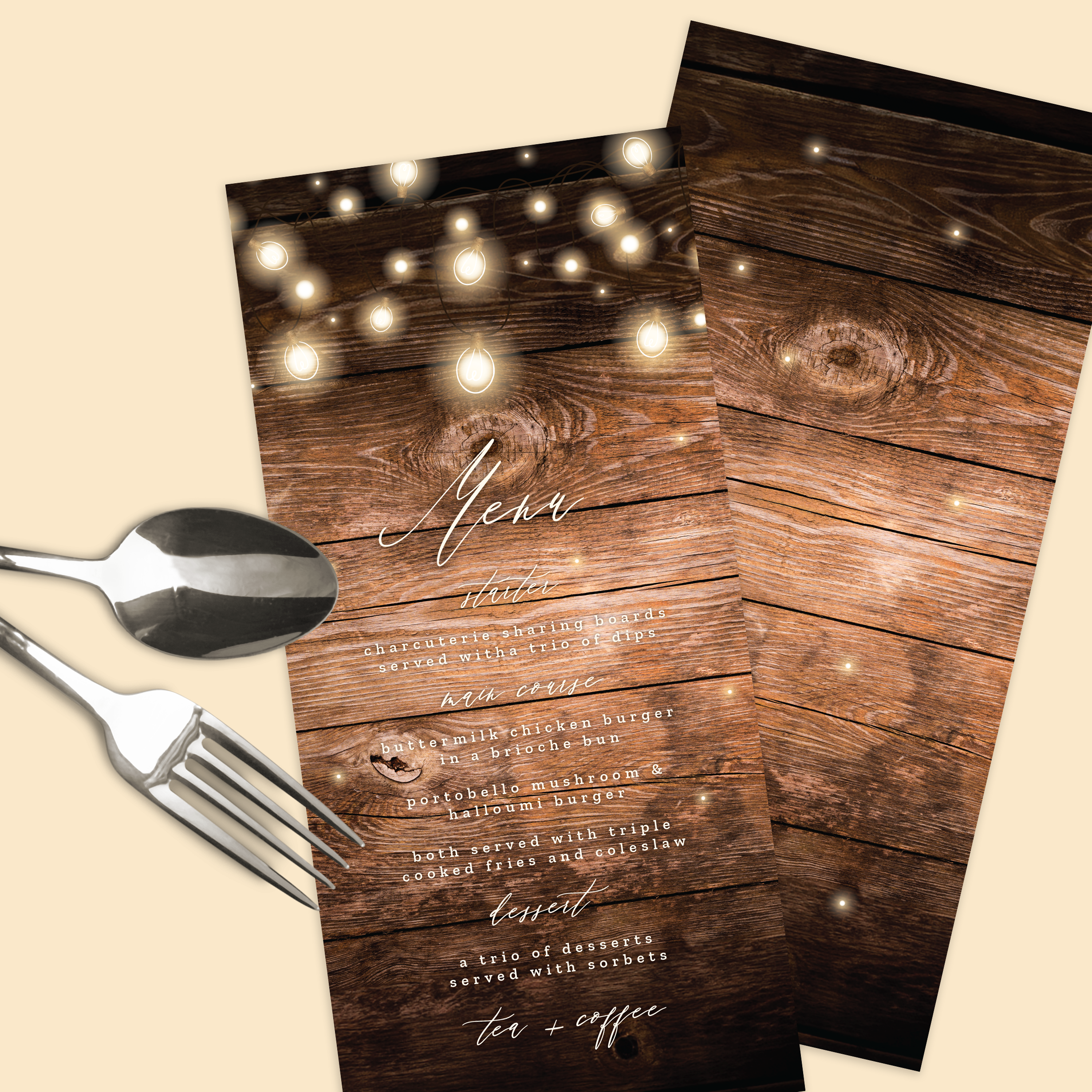 Perfectly in line with the rest of the suite, this menu can have text on both sides if your menu has more text, such as a drinks menu or further options. I can also provide separate menu's for vegan or children's menus.