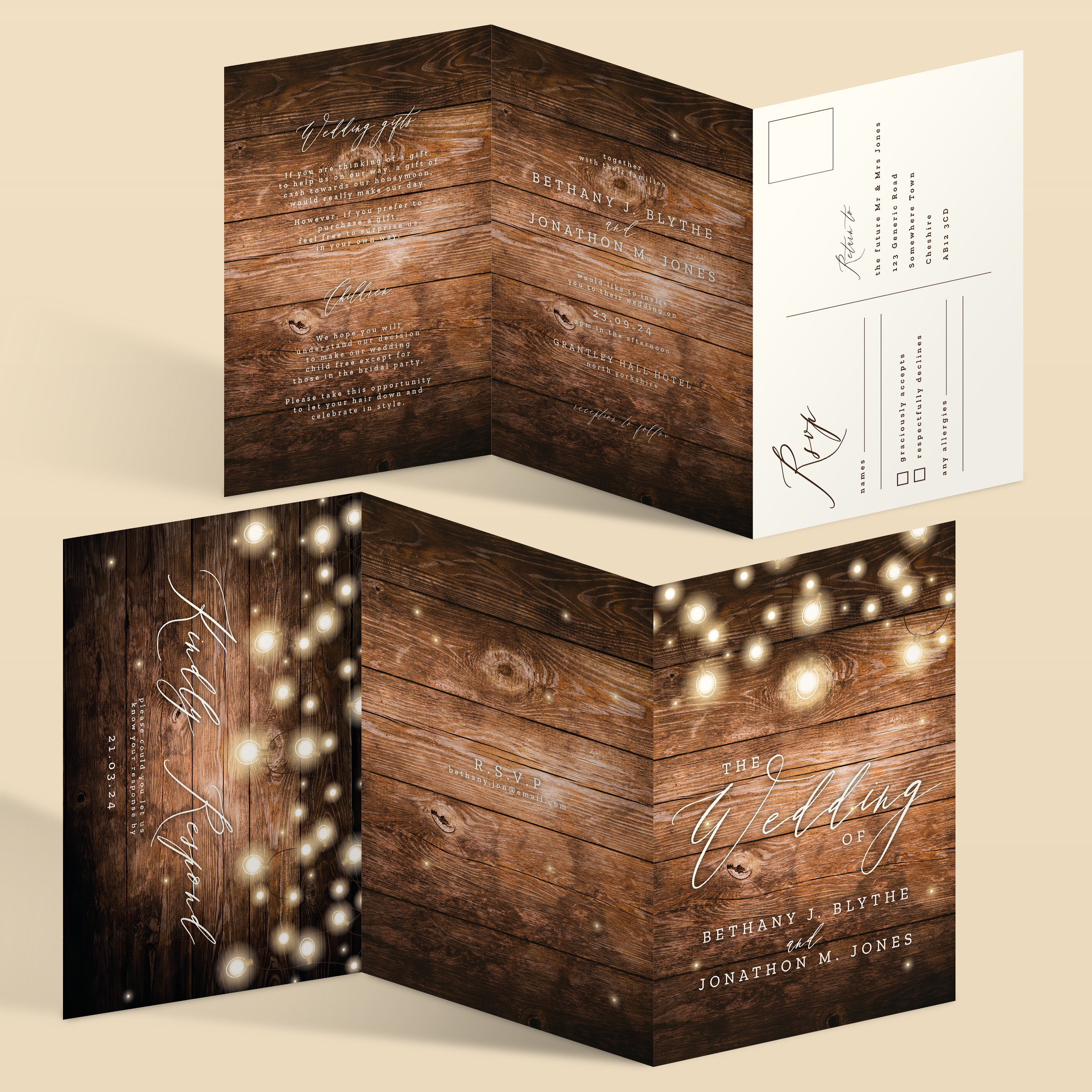 This elegant, z-fold invite also includes and tear off R.S.V.P postcard for your guests to return easily. Also available are gate fold and concertina fold alongside all the expected standard options.