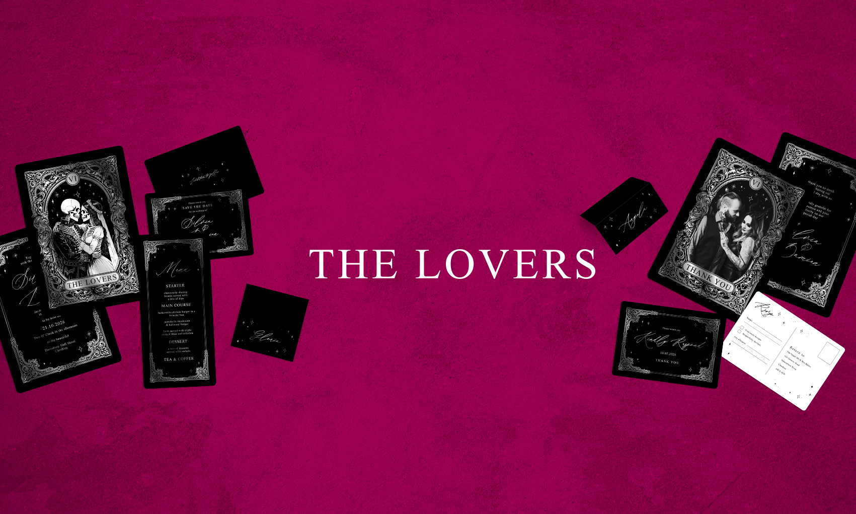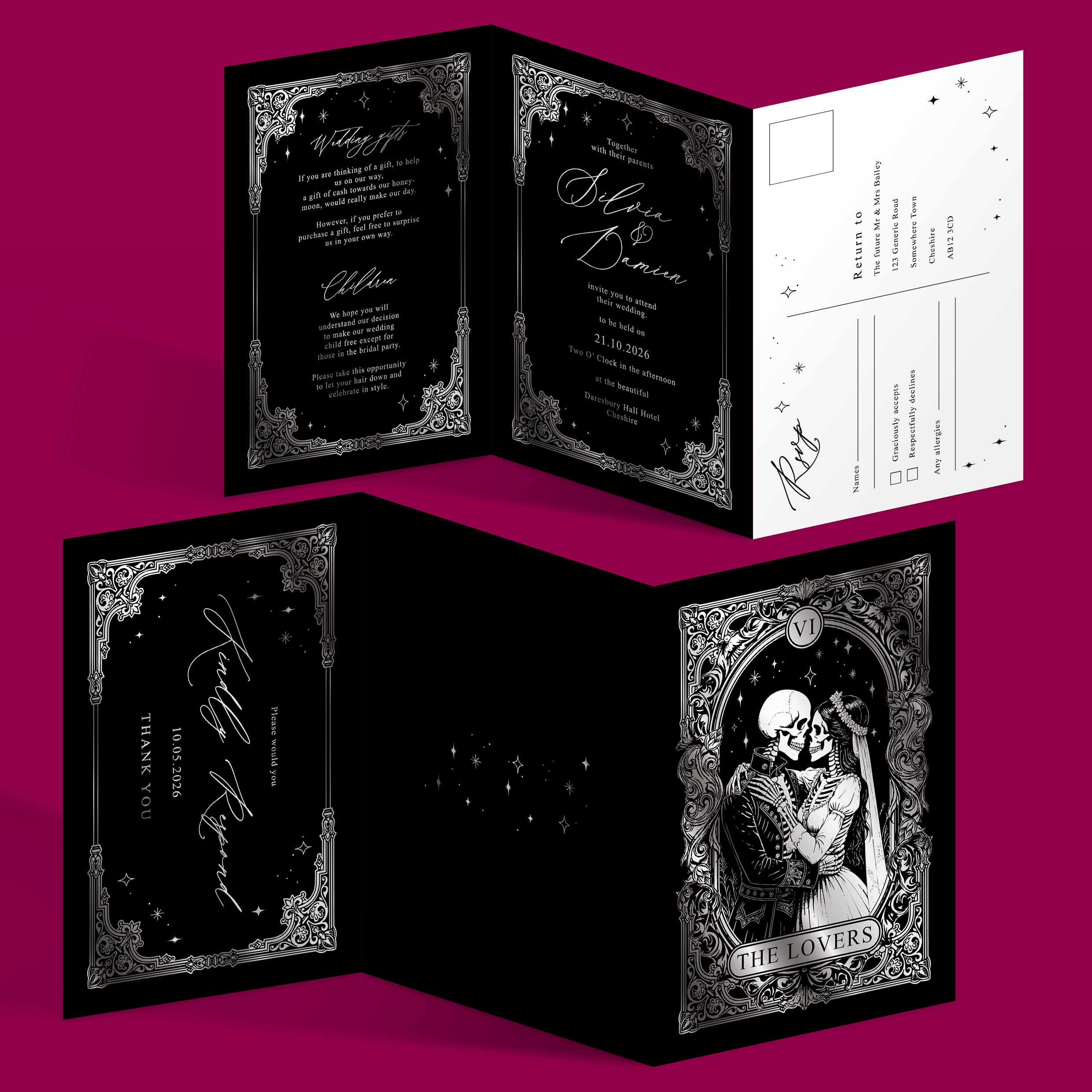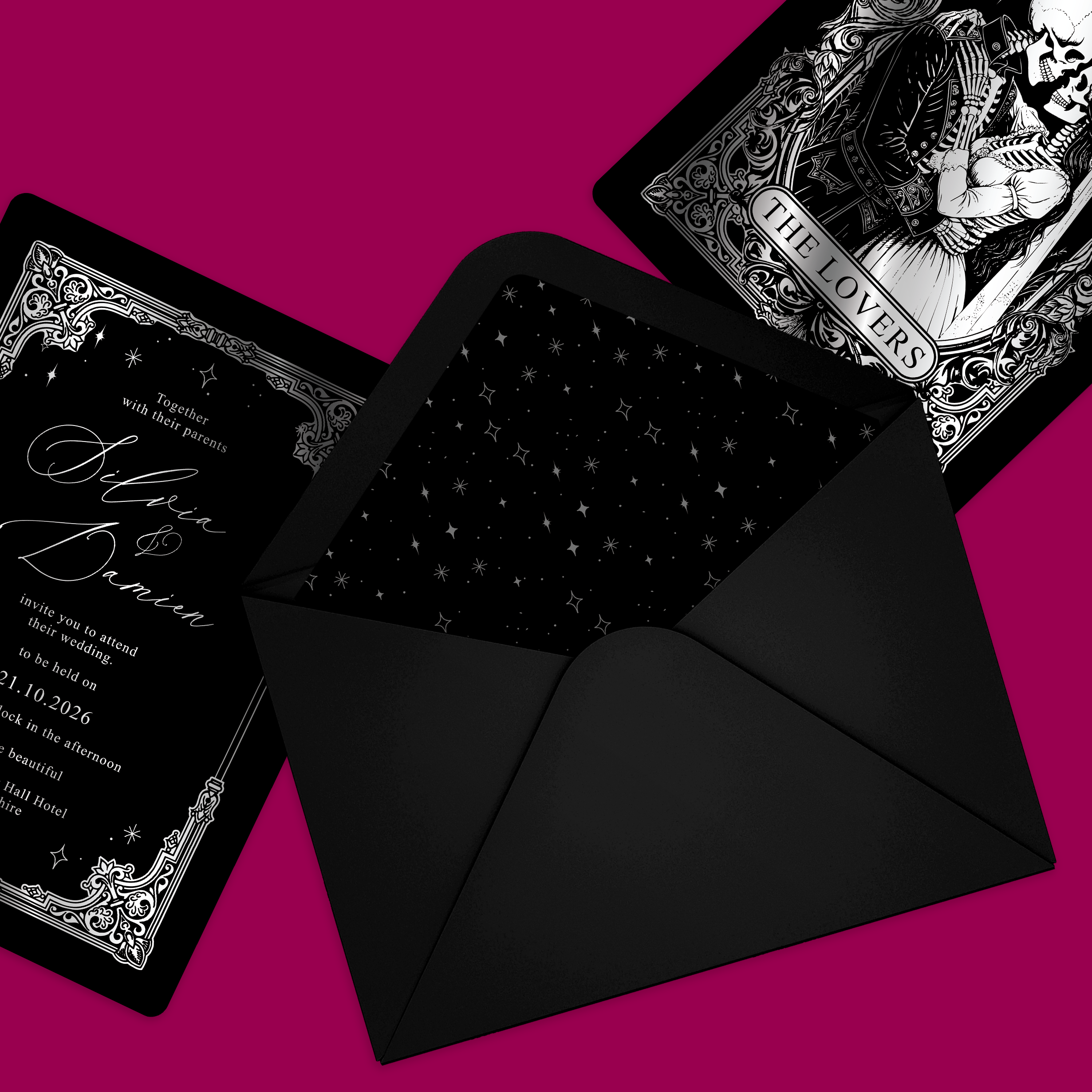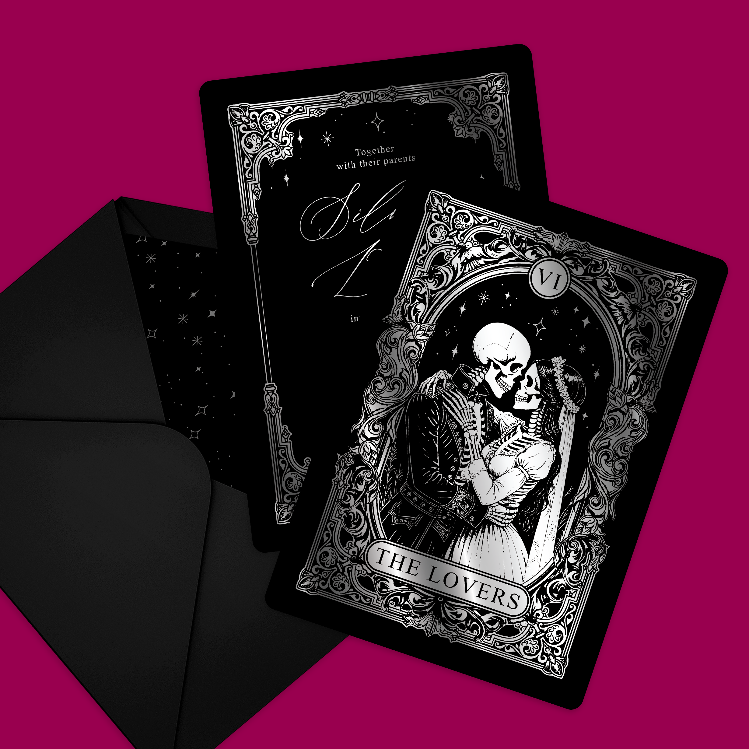 Elevate your wedding with this Gothic Wedding Stationery Suite, inspired by The Lovers tarot card. Featuring striking artwork each piece captures dark romance and timeless symbolism. The design showcases entwined figures beneath celestial details and framed with ornate borders.