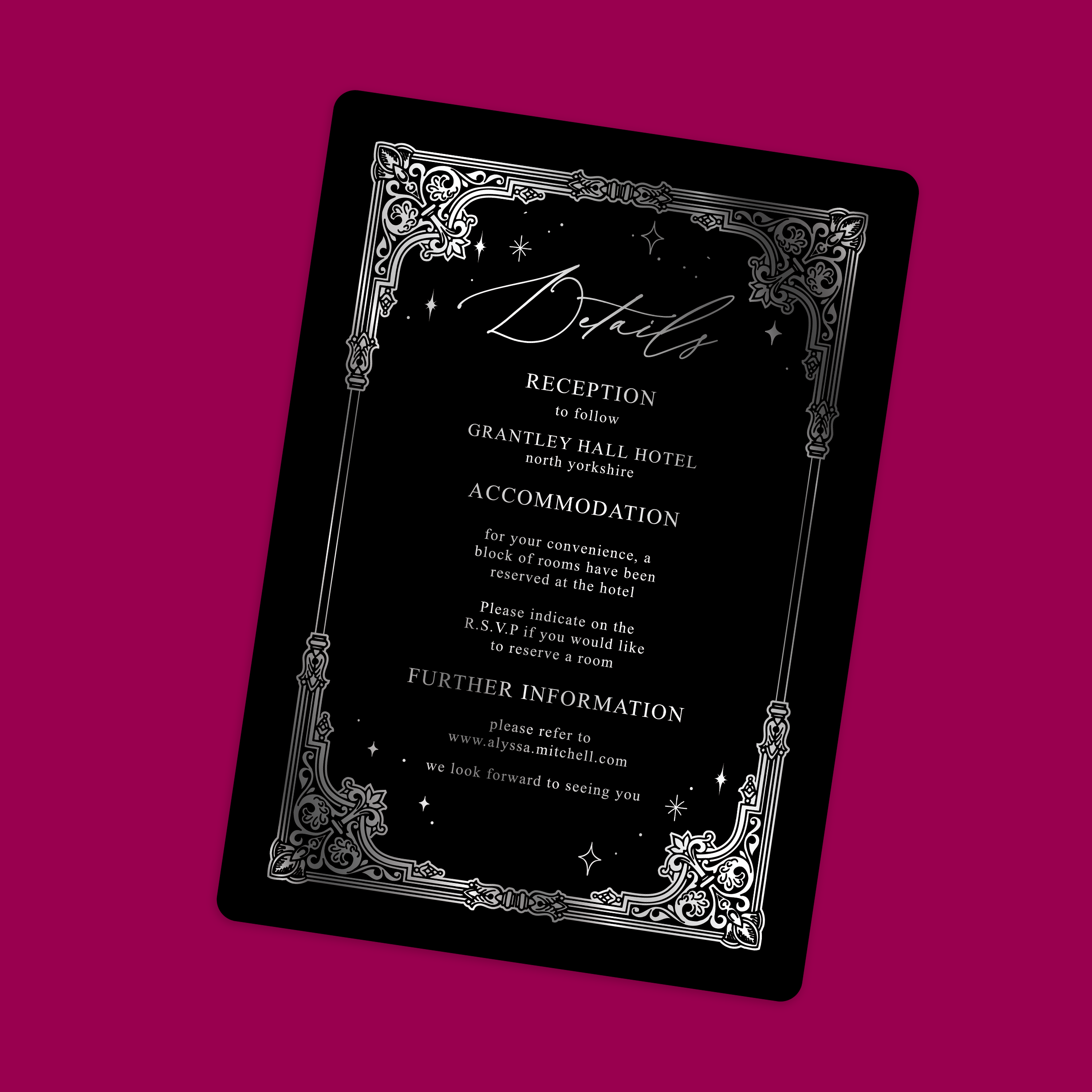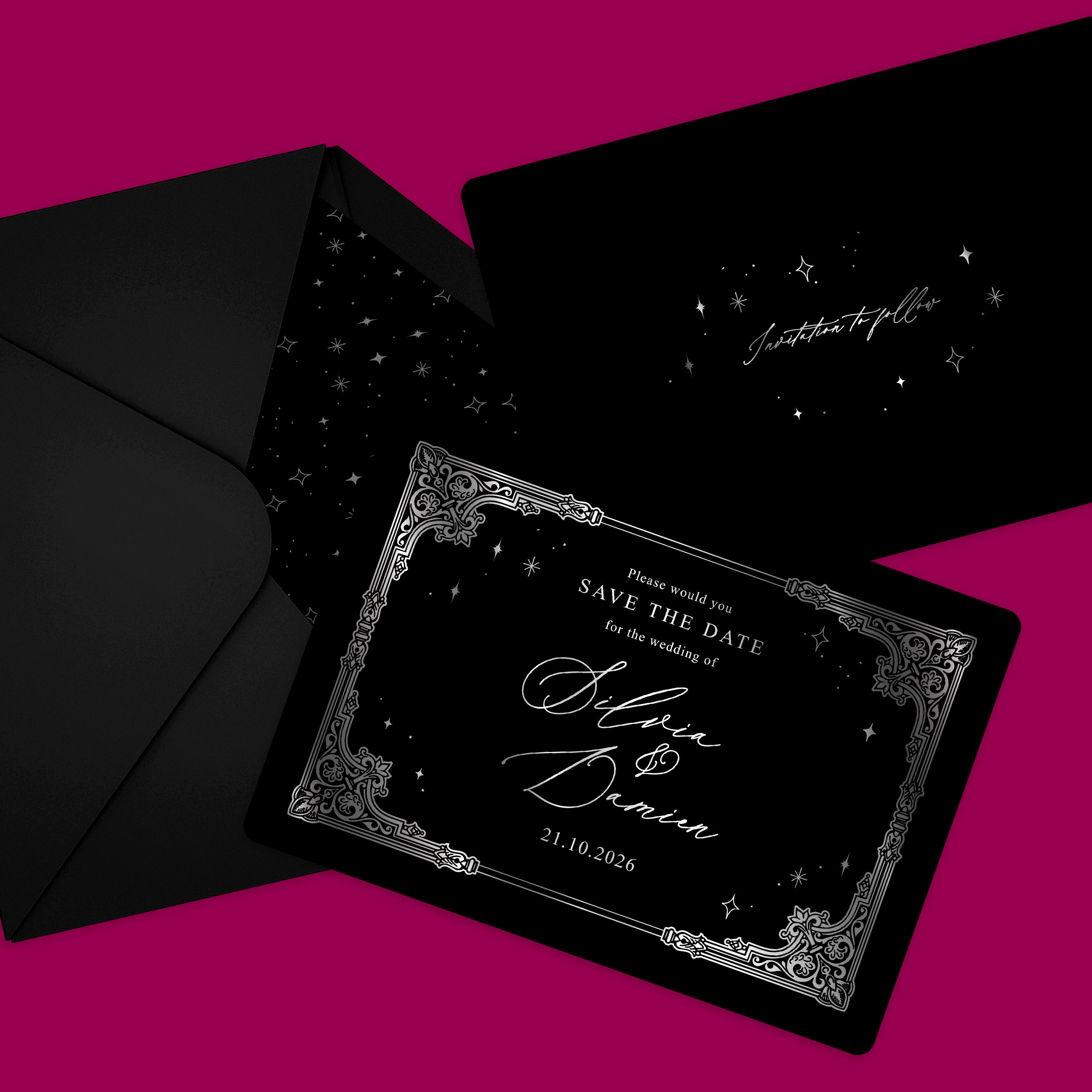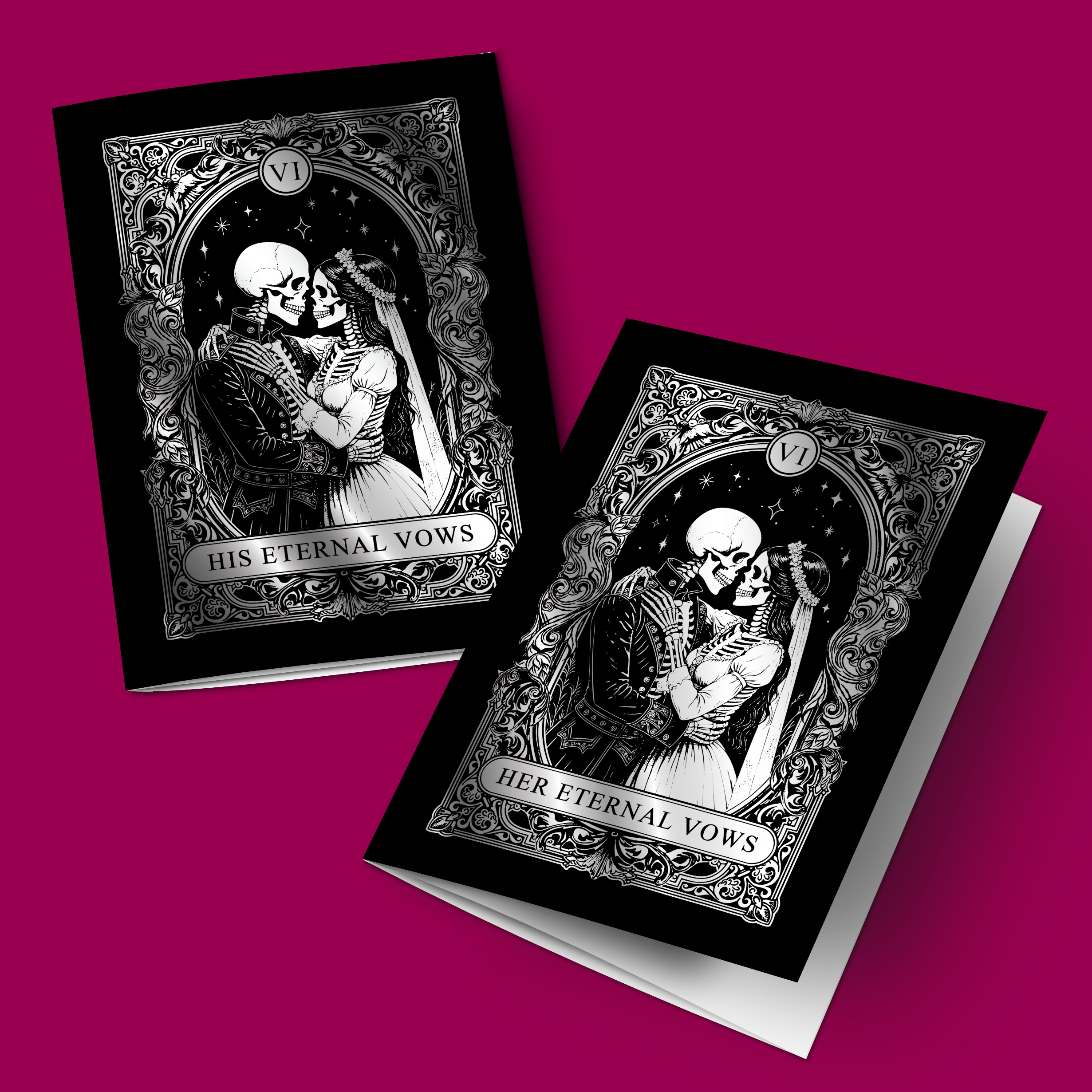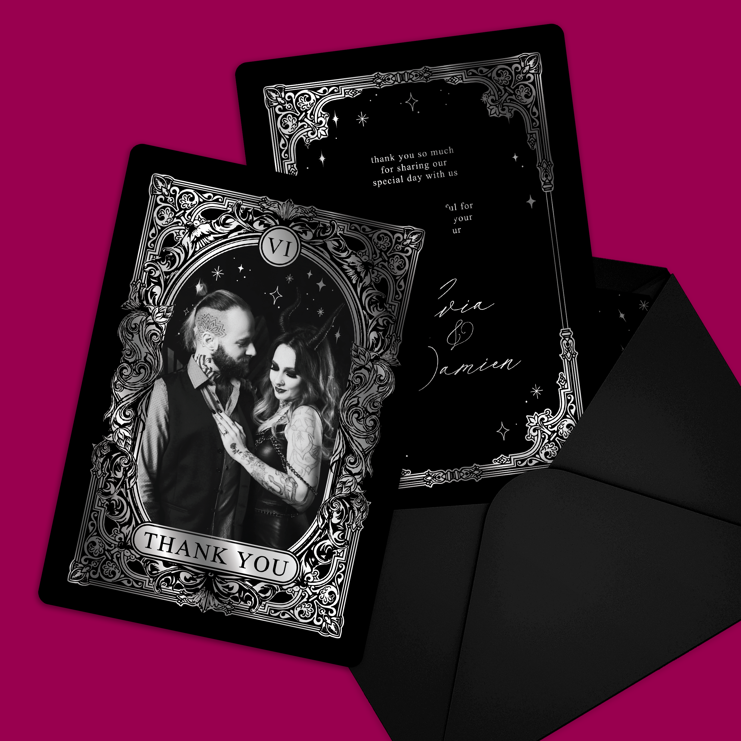 Elevate your wedding with this Gothic Wedding Stationery Suite, inspired by The Lovers tarot card. Featuring striking artwork each piece captures dark romance and timeless symbolism. The design showcases entwined figures beneath celestial details and framed with ornate borders.