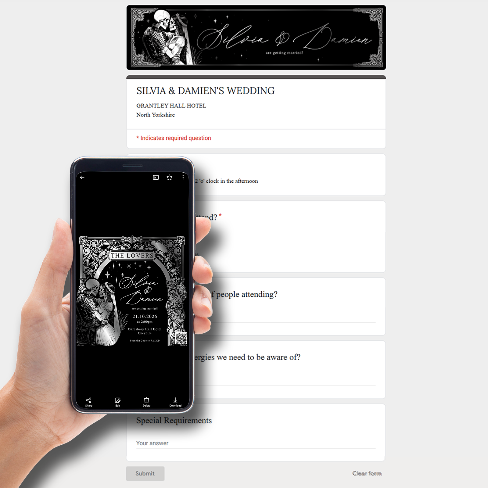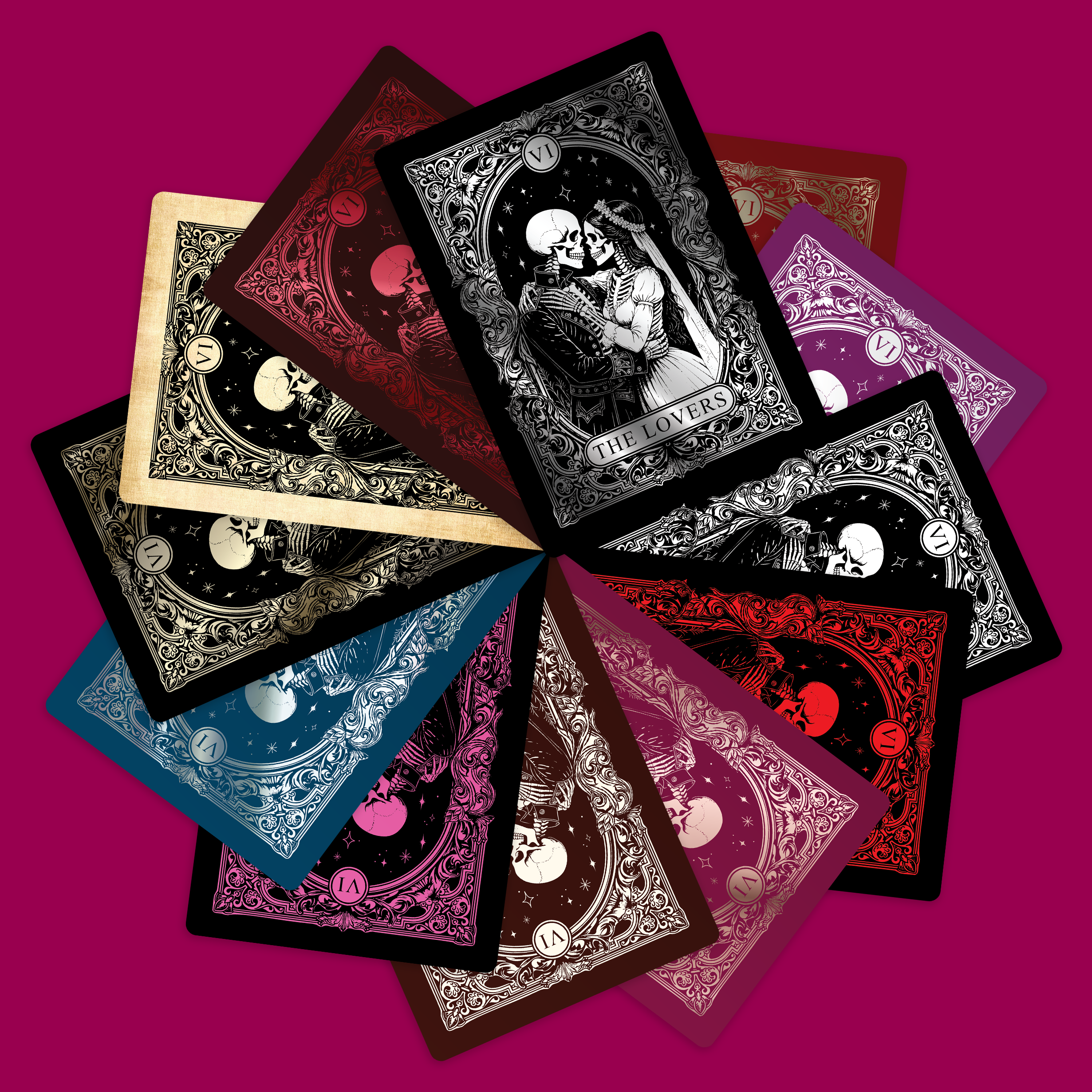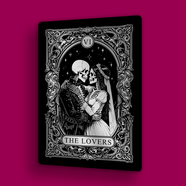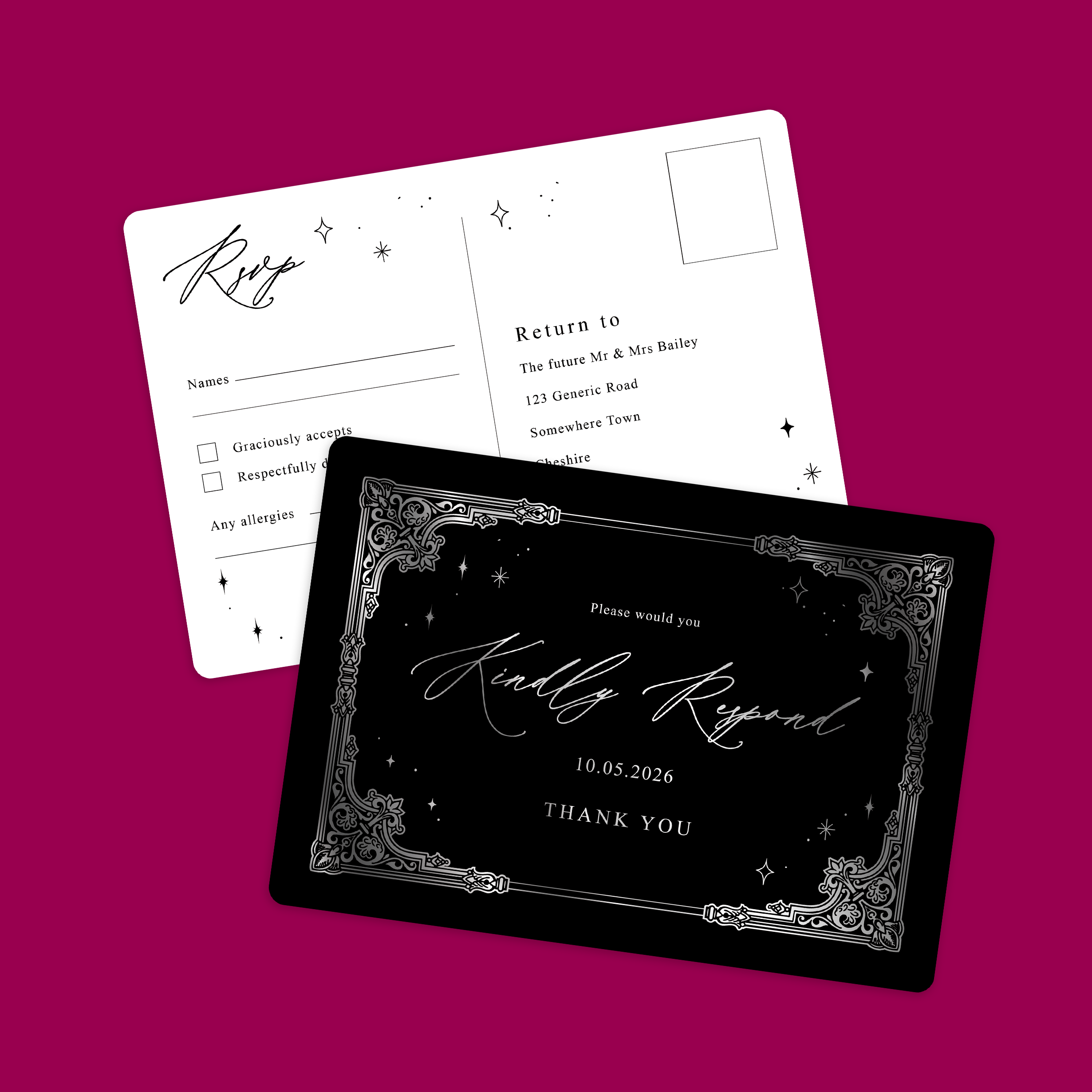 Elevate your wedding with this Gothic Wedding Stationery Suite, inspired by The Lovers tarot card. Featuring striking artwork each piece captures dark romance and timeless symbolism. The design showcases entwined figures beneath celestial details and framed with ornate borders.