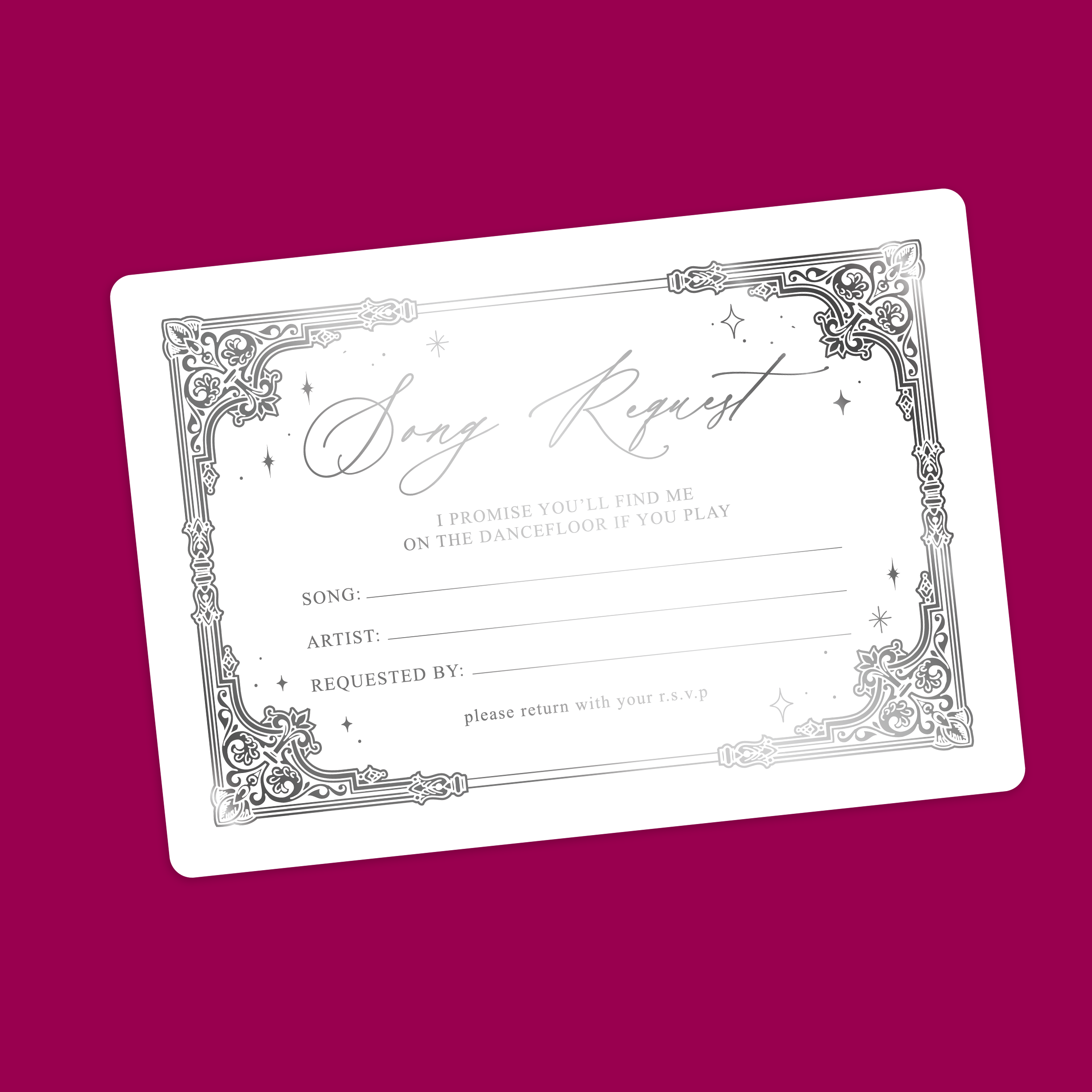 Song request cards allow guests to contribute to the celebration by requesting their favourite music and will add a personal touch to the playlist. These cards ensure the dance floor stays lively and full of memorable moments.