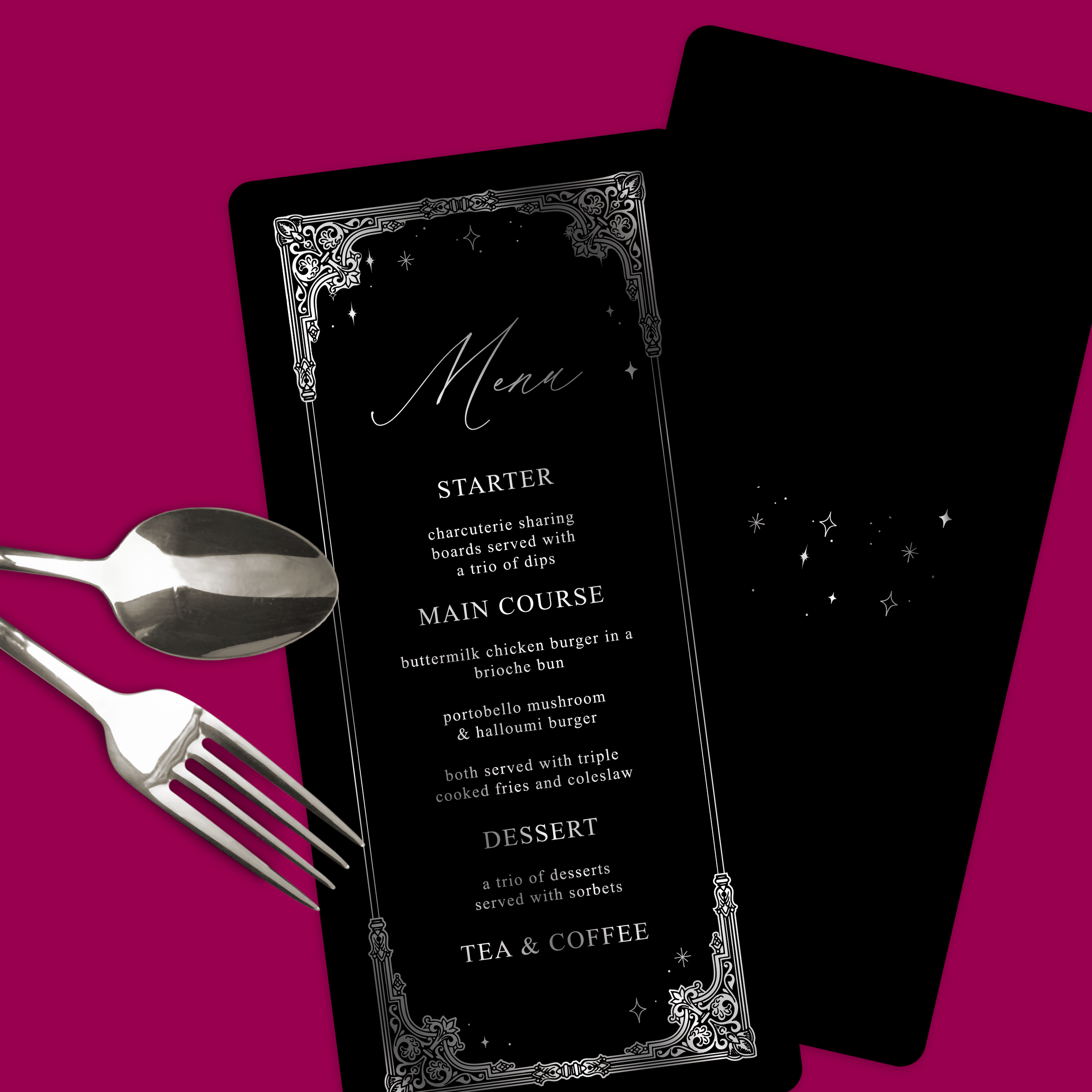 Perfectly in line with the rest of the suite, this menu can have text on both sides if your menu has more text, such as a drinks menu or further options. I can also provide separate menu's for vegan or children's menus.