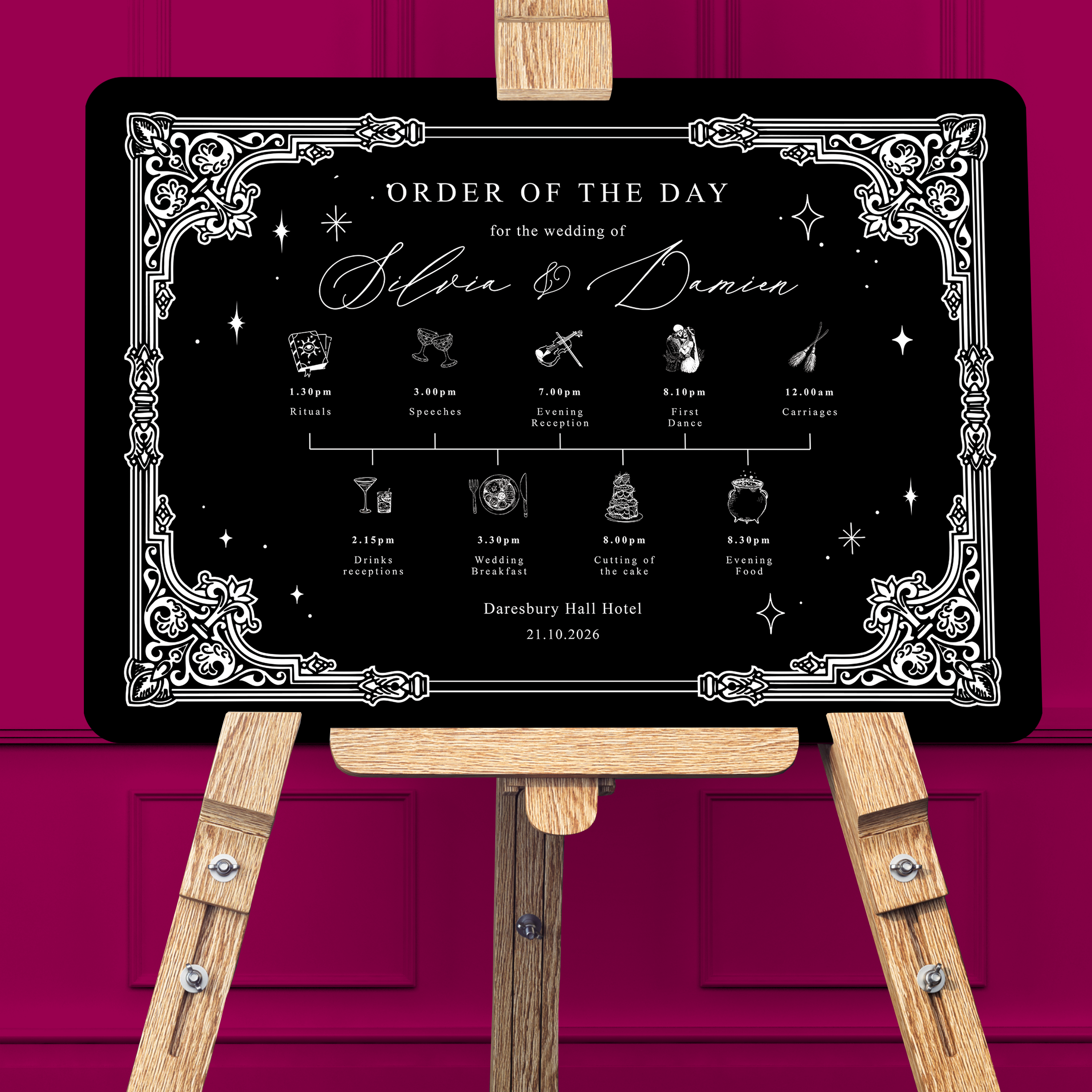 Help everyone stay informed and ensure your day flows smoothly with an Order-of-the-Day sign board. Your Order-of-the-Day will guide guests through the wedding schedule, ensuring they're informed of the sequence of events from ceremony to celebration.