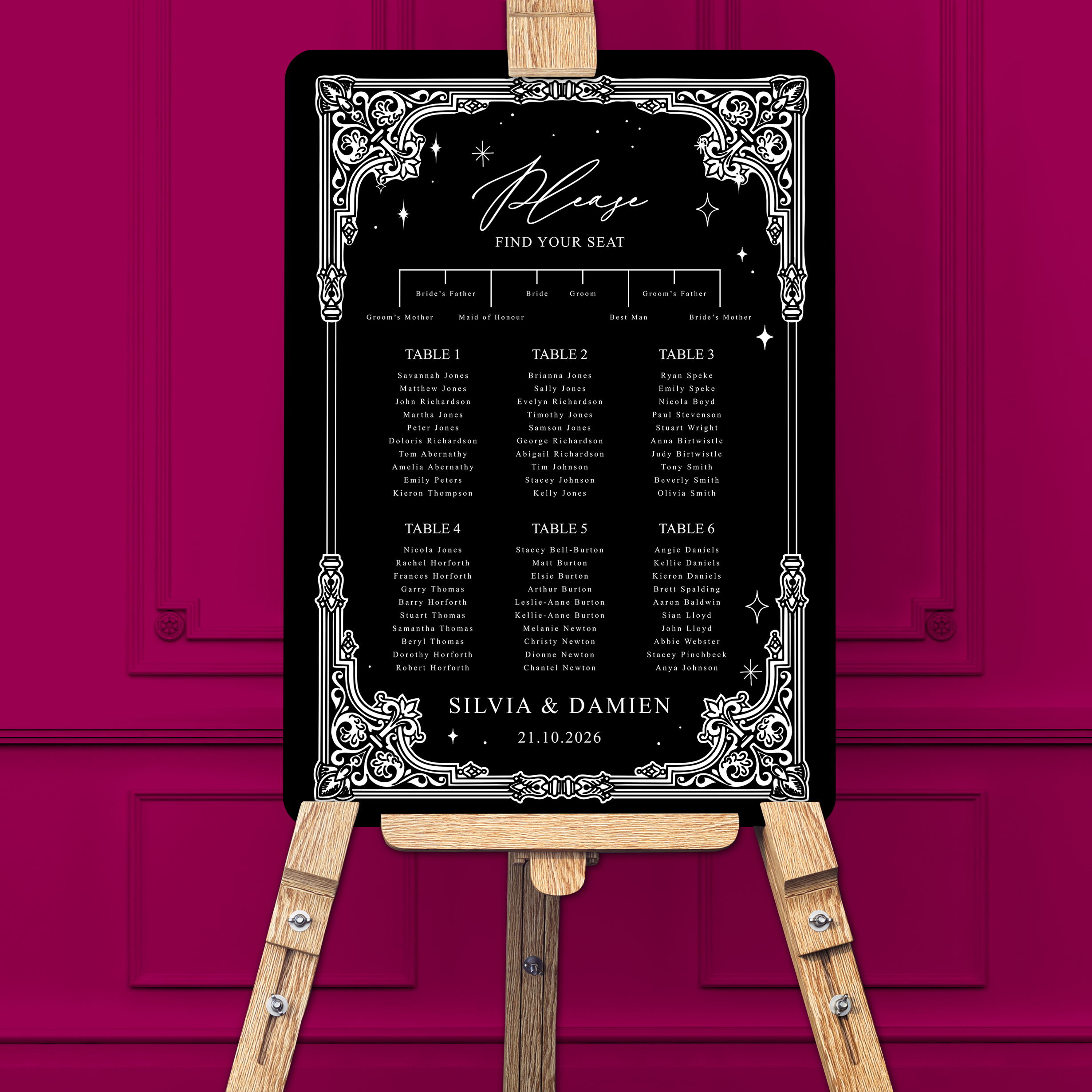 Printed on a choice of boards and sizes, your theme continues on a beautiful seating plan so your guests know where to go. Please note, foil elements on my signboards will be a faux foil effect unless otherwise requested.