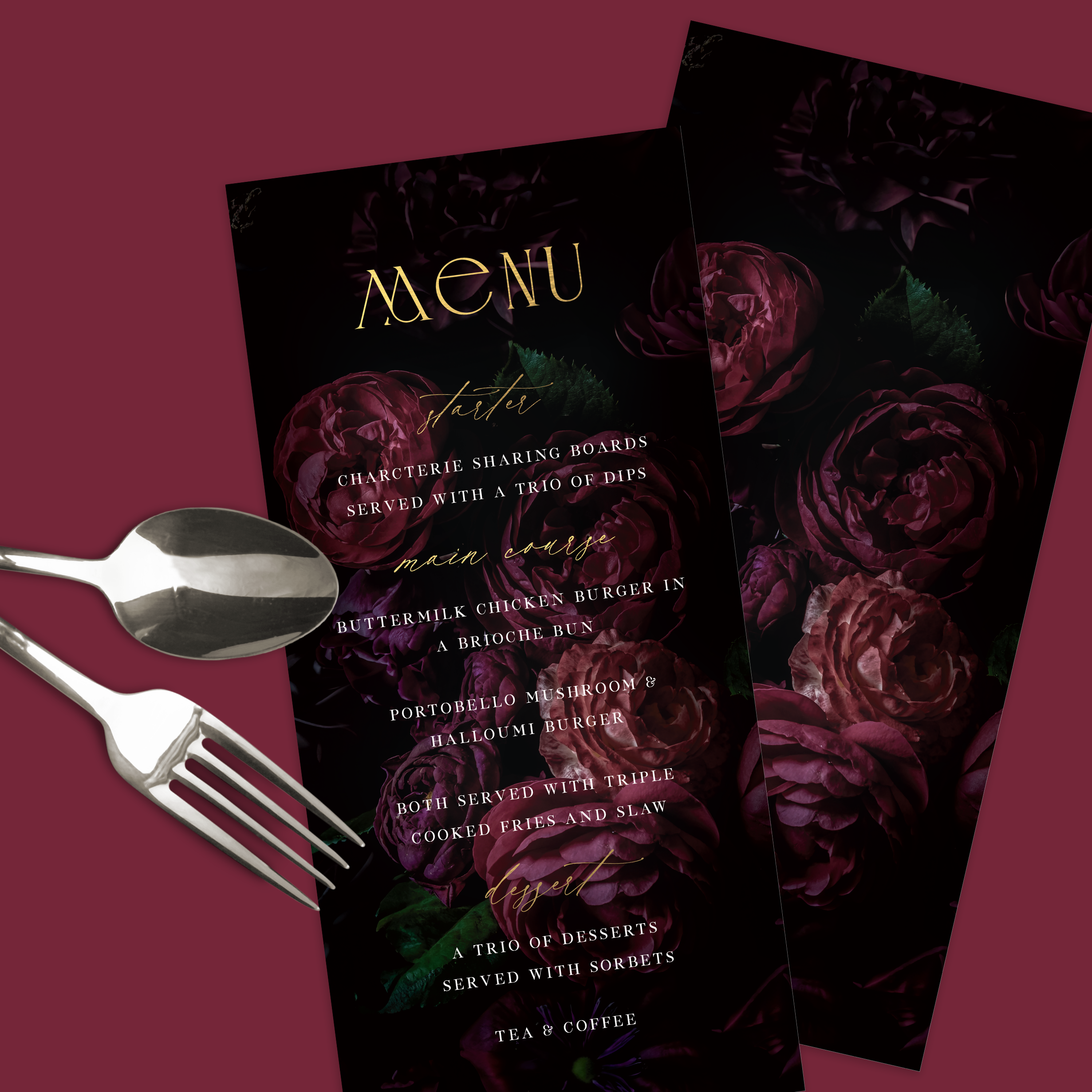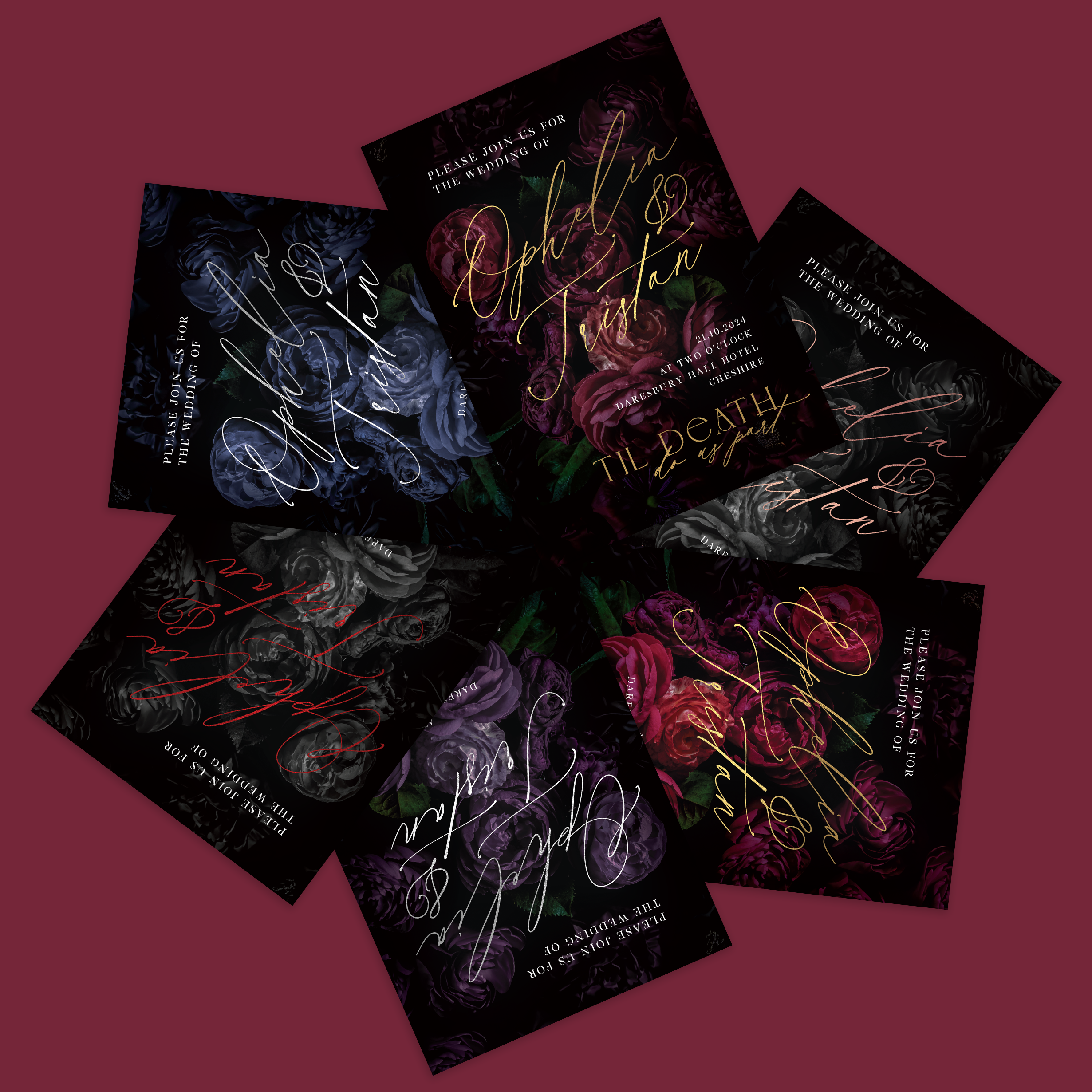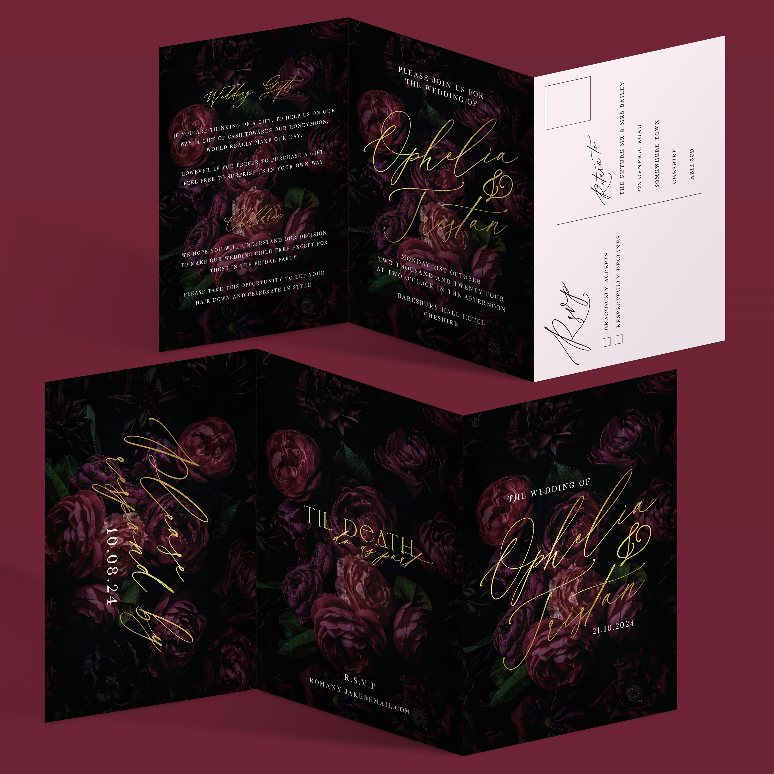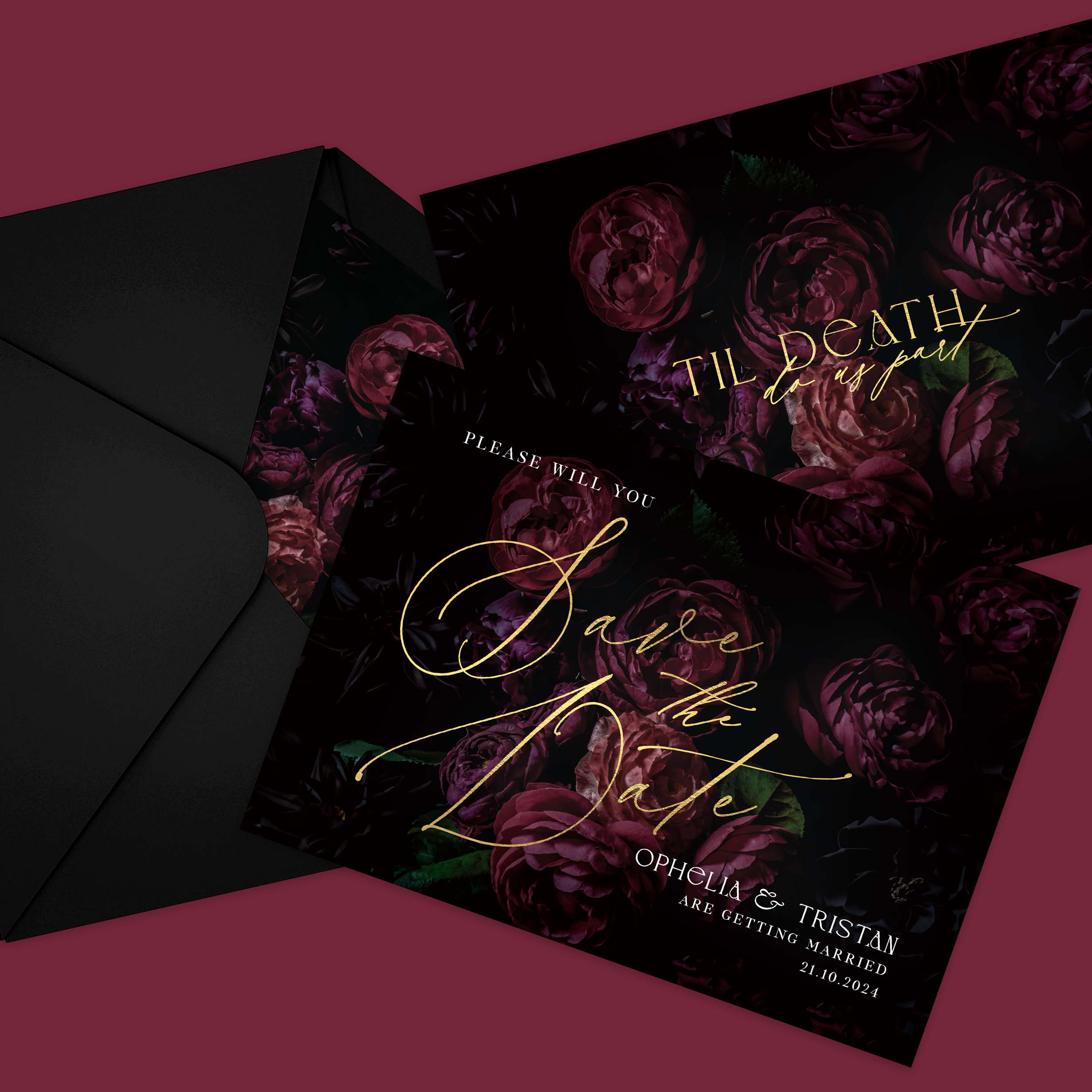This luxurious wedding suite, adorned with velvety dark roses, creates a dramatic contrast that highlights the elegant text, which is printed in shimmering metallic foil. This wedding suite is perfect for a romantic, yet dark and dramatic wedding vibe, full of elegance, luxury, and an air of mystique.