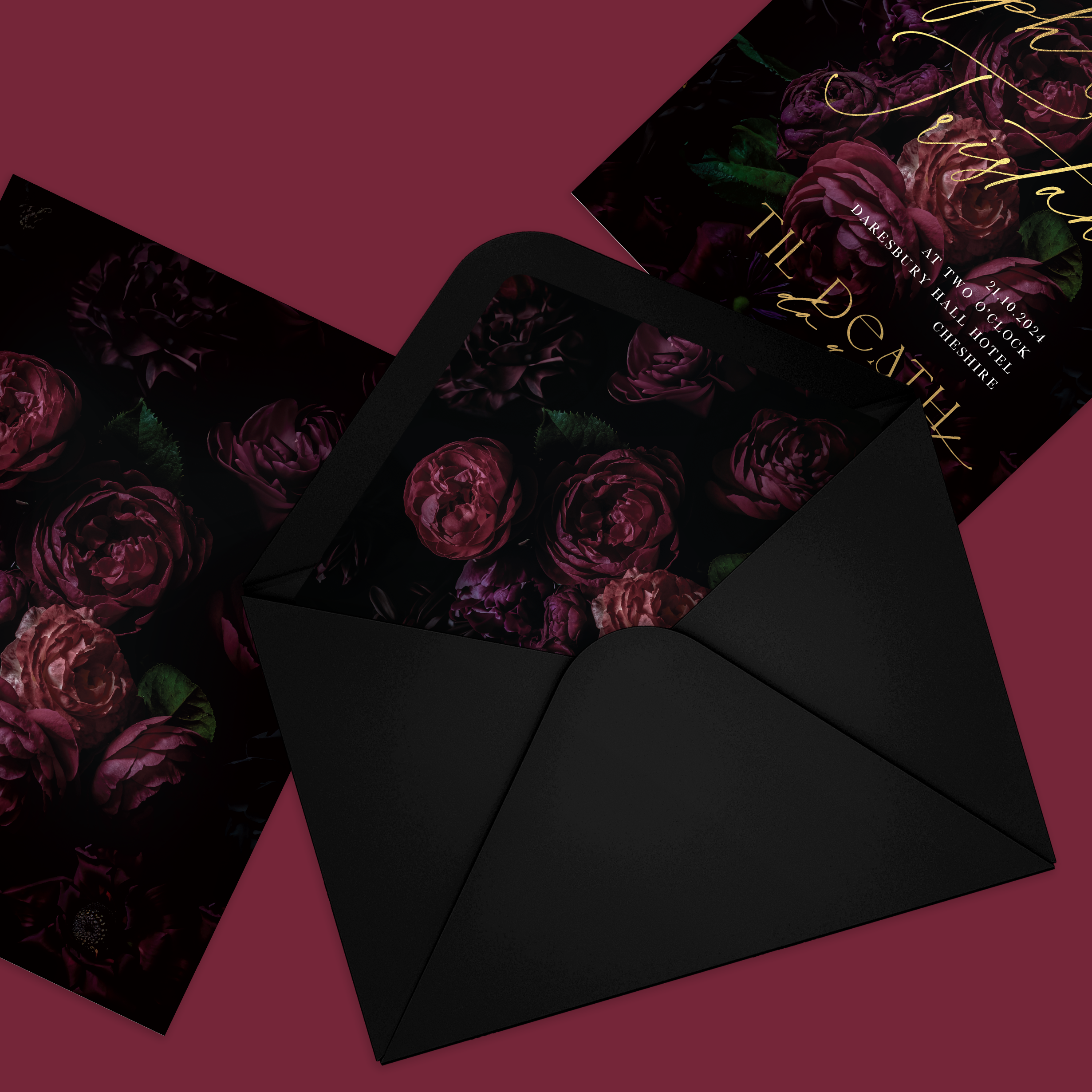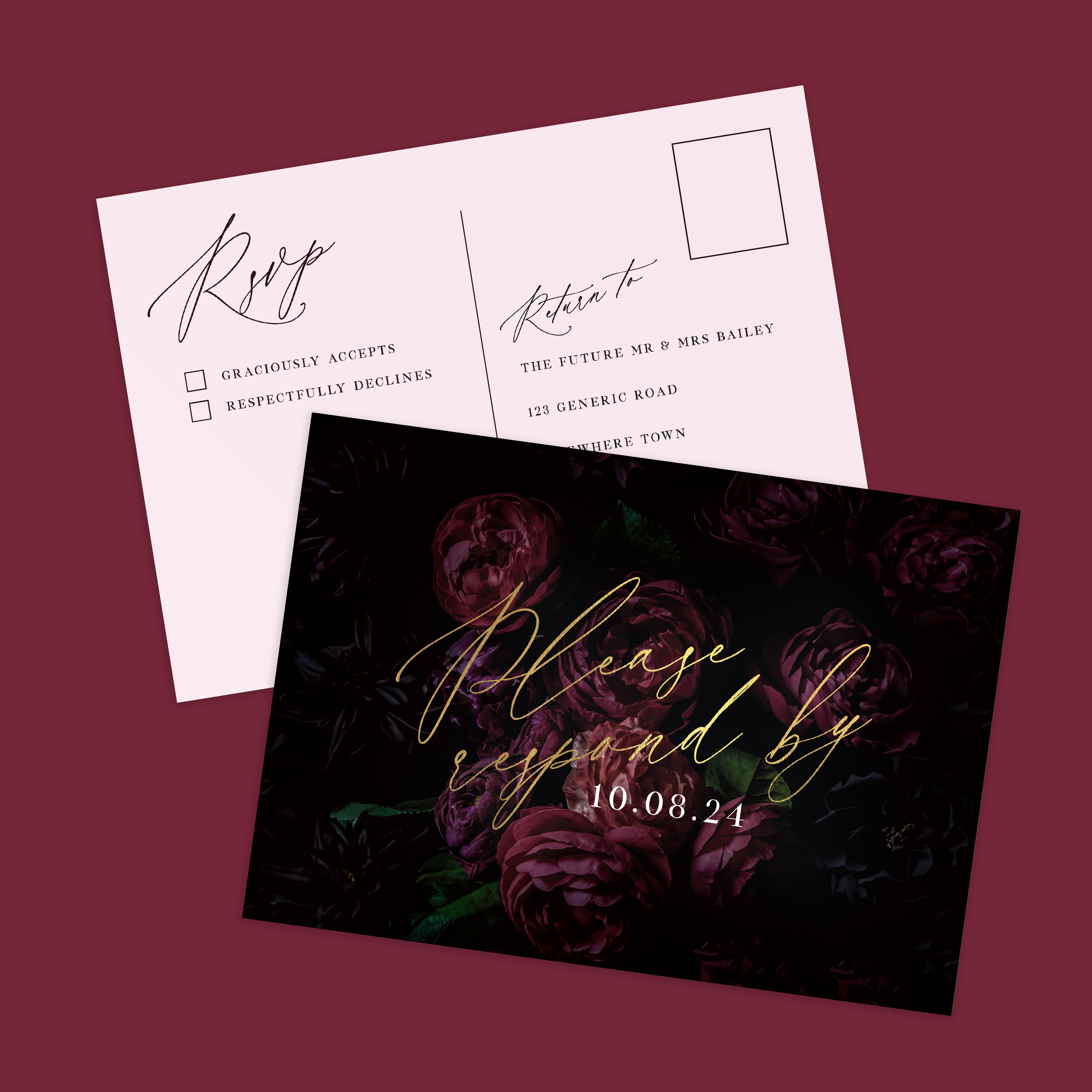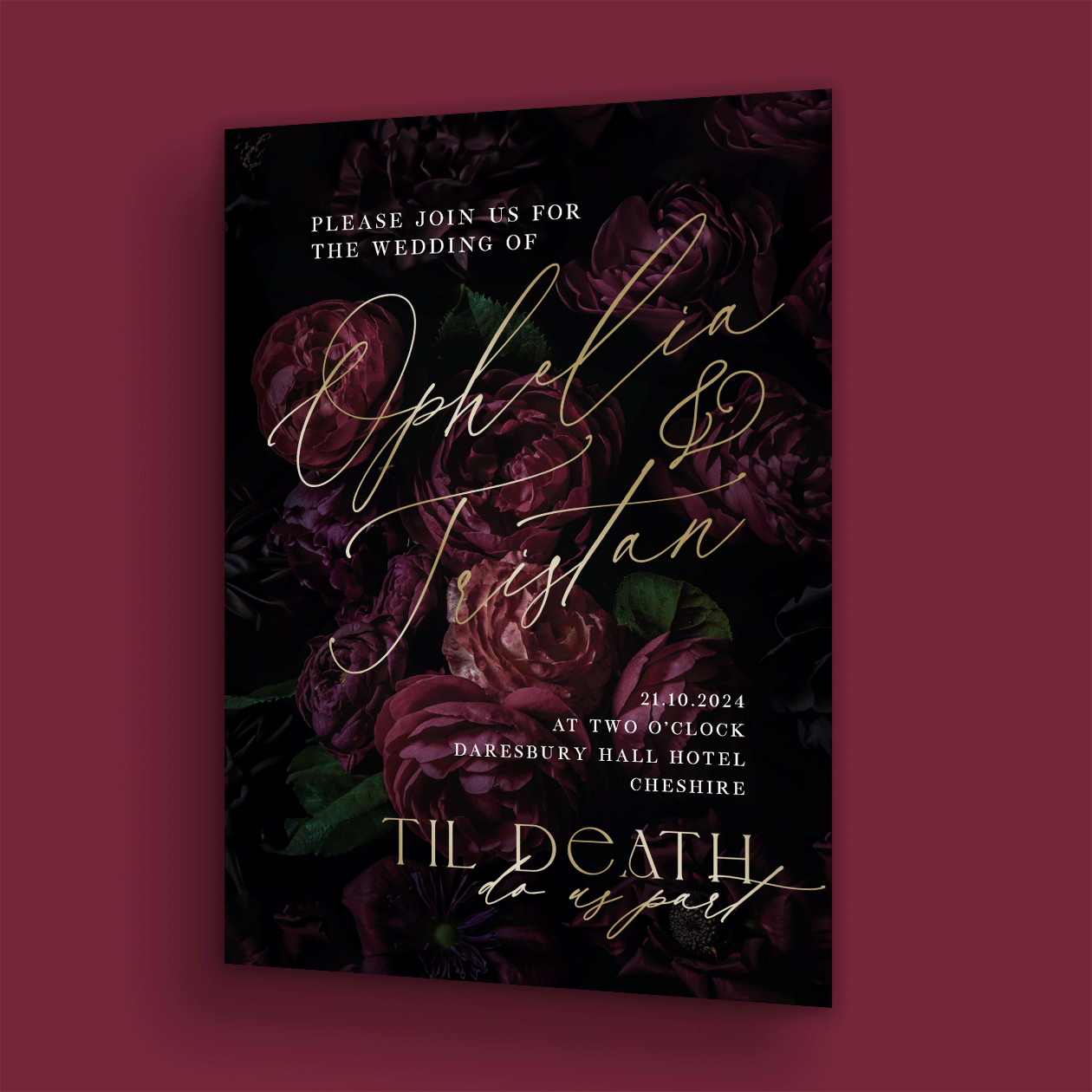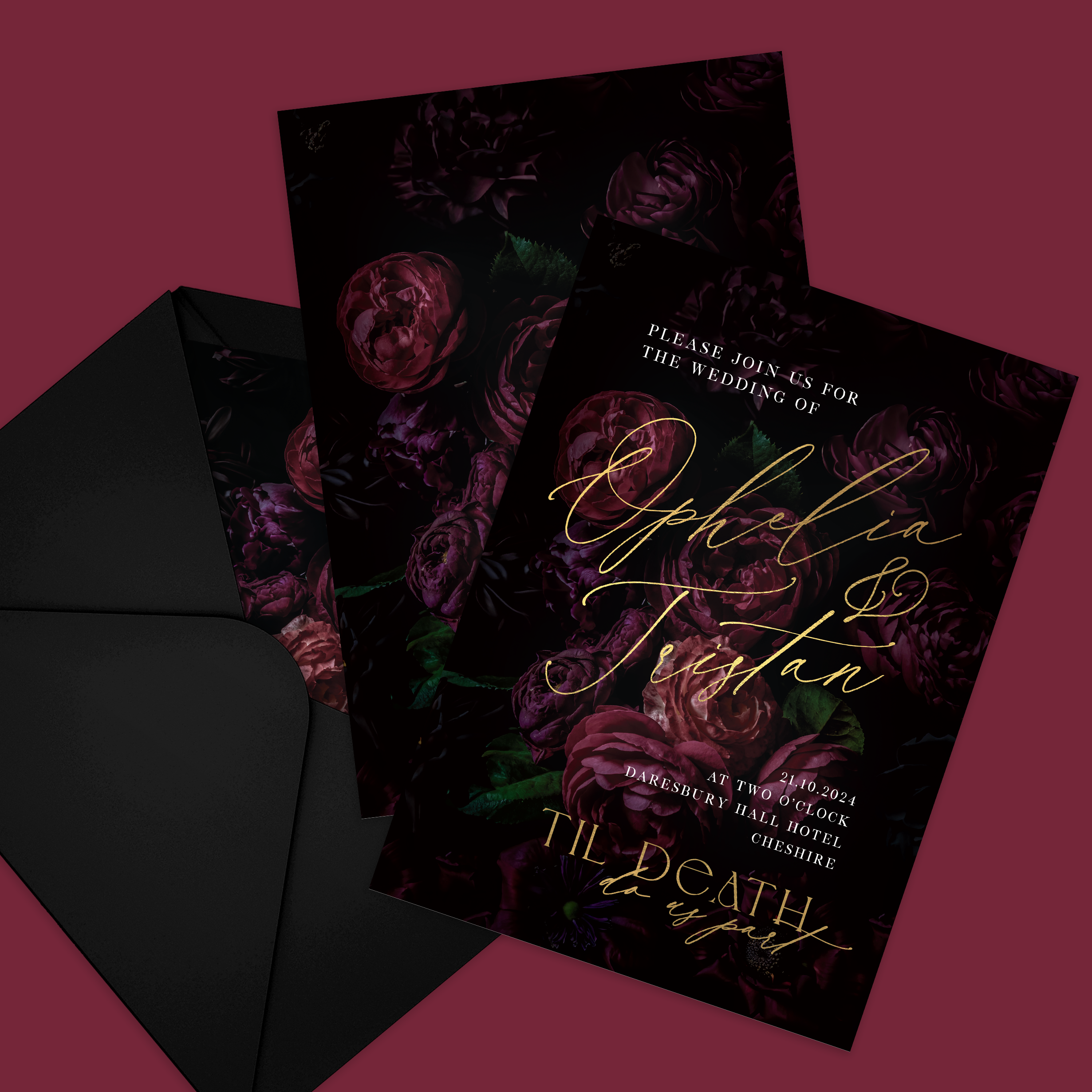 This luxurious wedding suite, adorned with velvety dark roses, creates a dramatic contrast that highlights the elegant text, which is printed in shimmering metallic foil. This wedding suite is perfect for a romantic, yet dark and dramatic wedding vibe, full of elegance, luxury, and an air of mystique.
