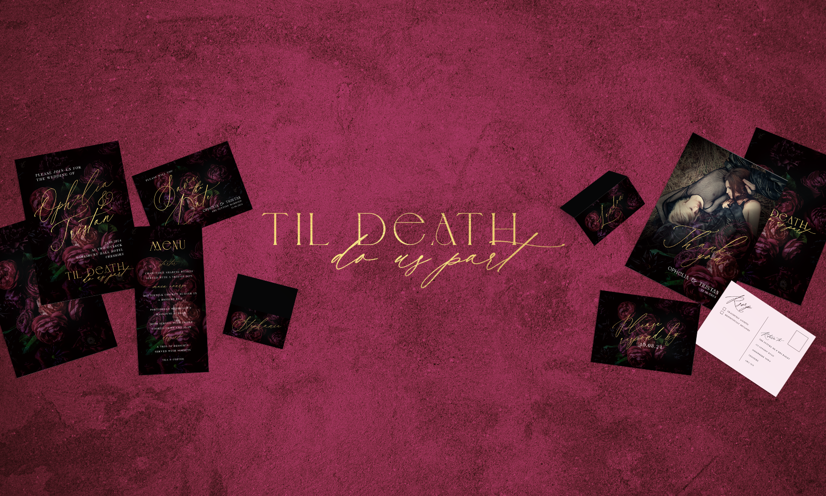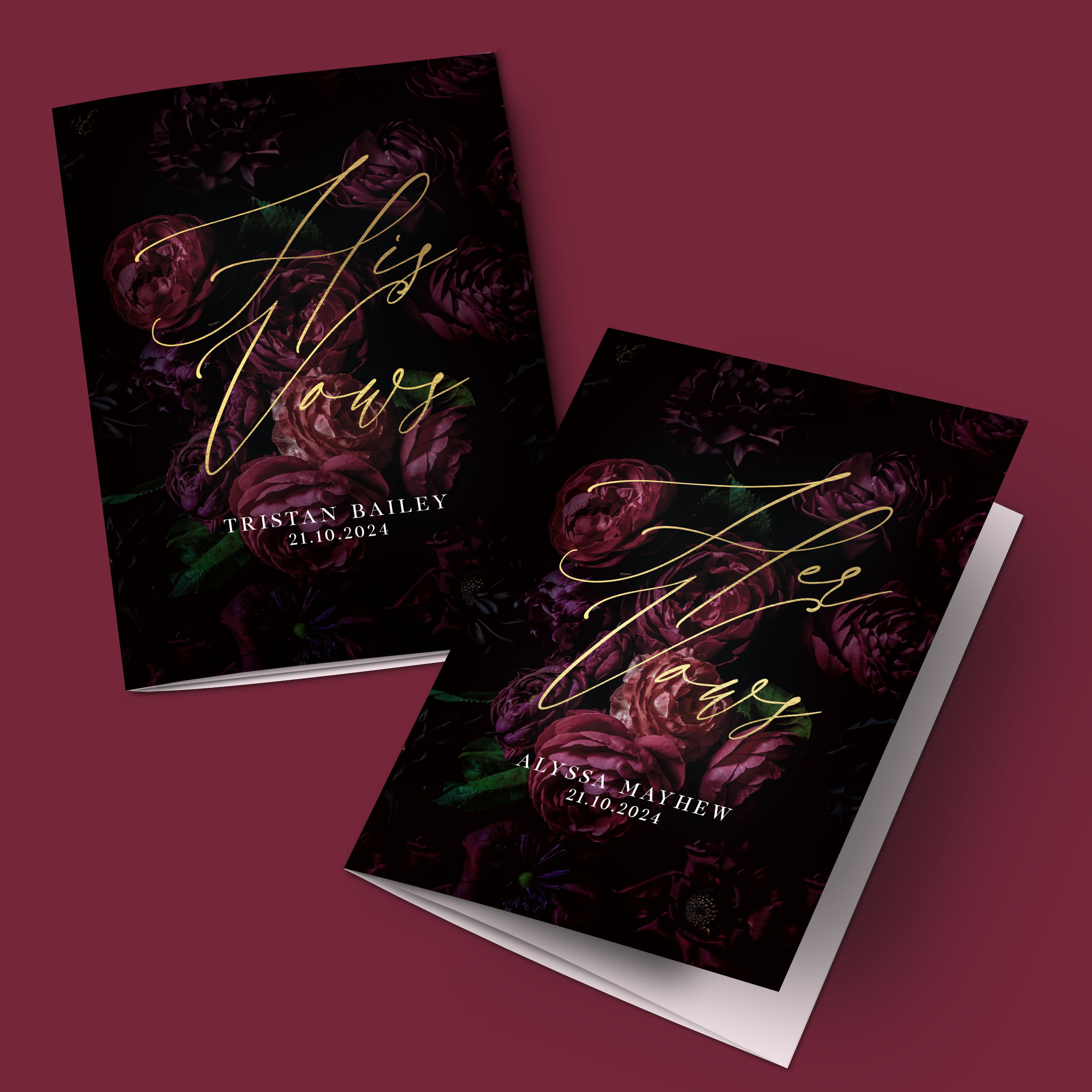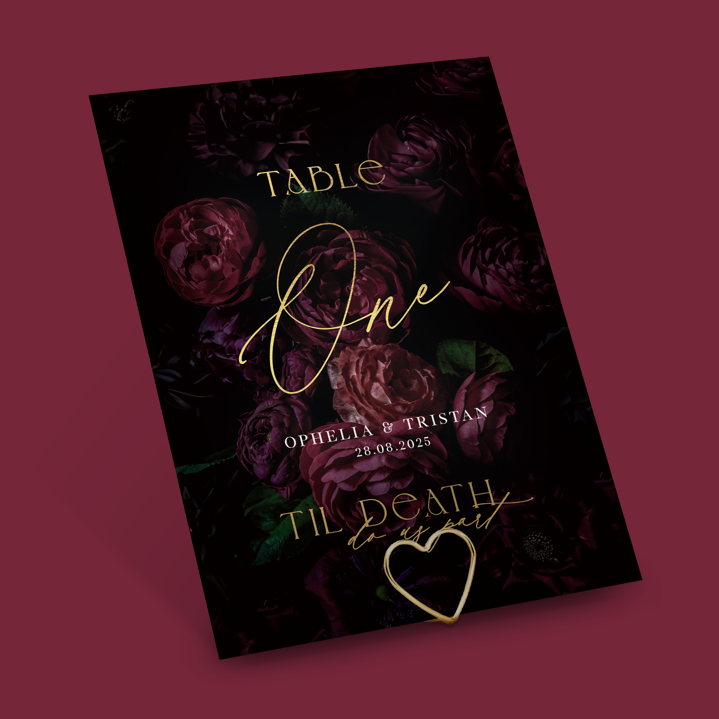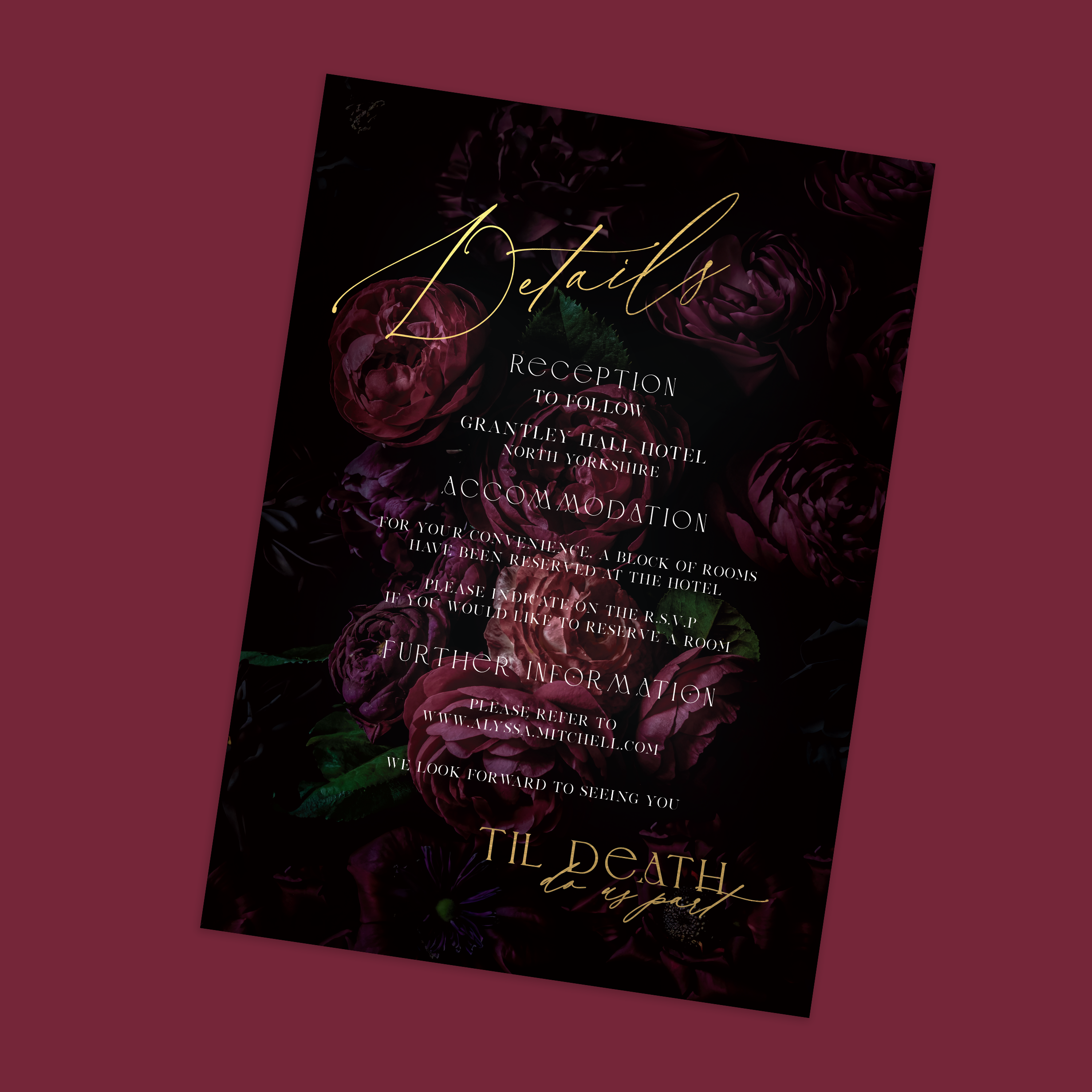This luxurious wedding suite, adorned with velvety dark roses, creates a dramatic contrast that highlights the elegant text, which is printed in shimmering metallic foil. This wedding suite is perfect for a romantic, yet dark and dramatic wedding vibe, full of elegance, luxury, and an air of mystique.