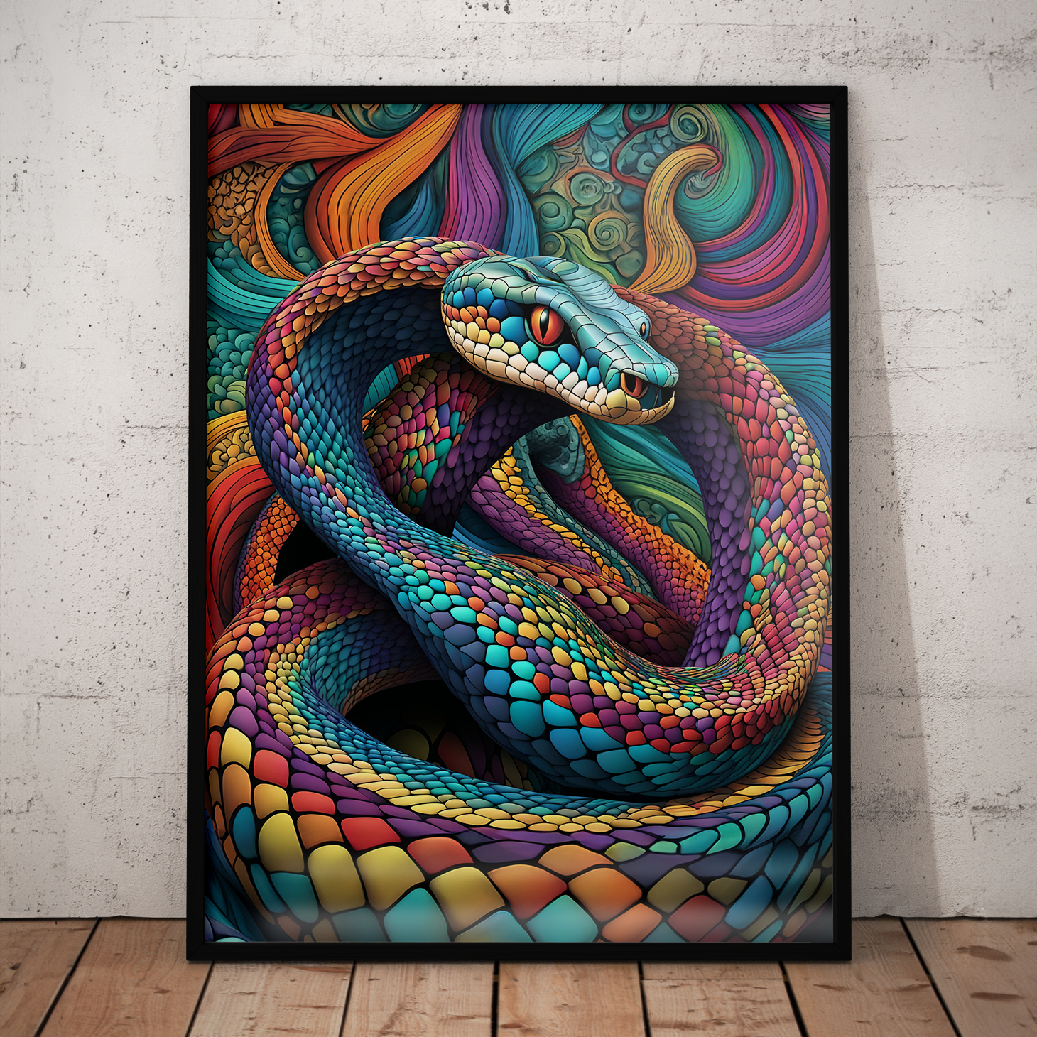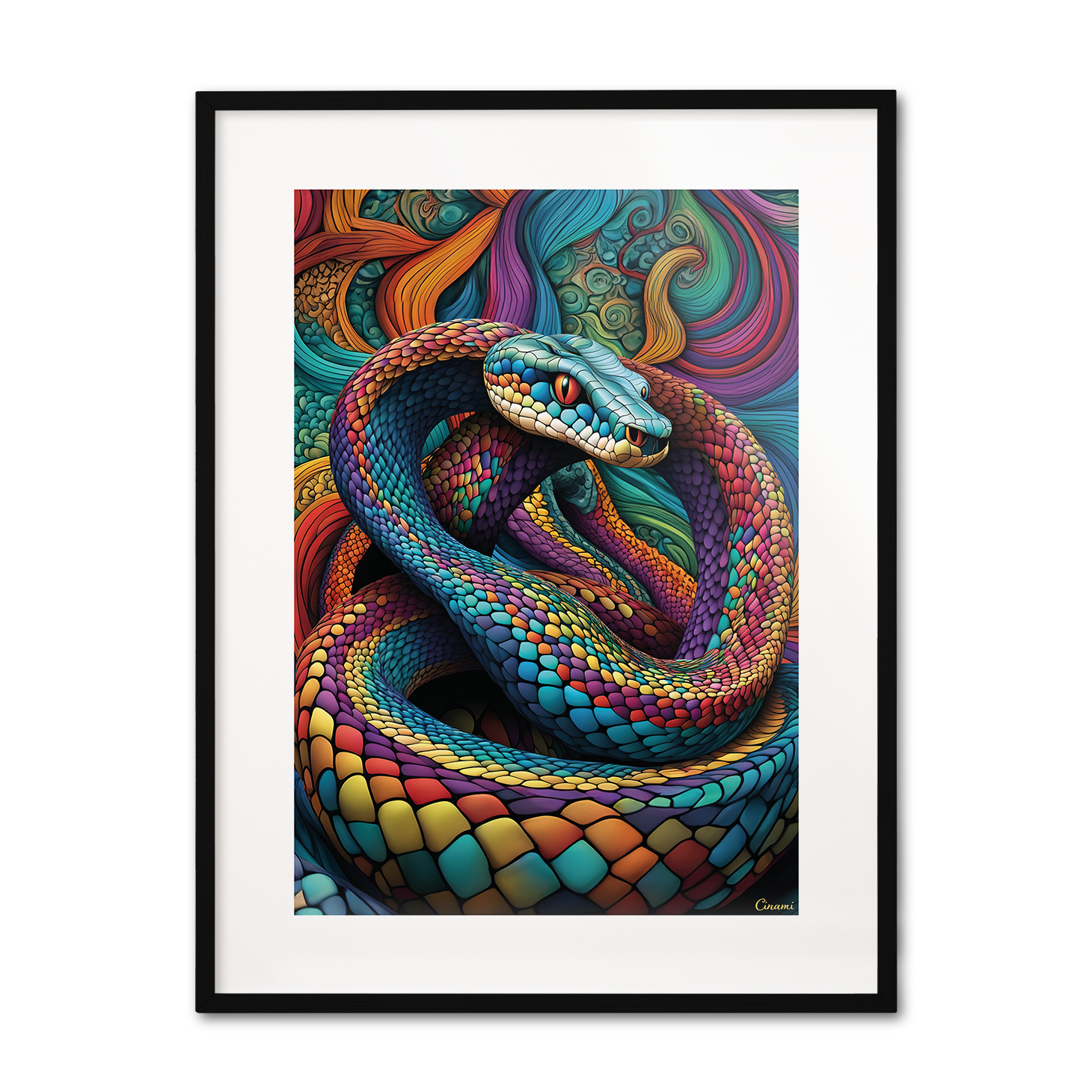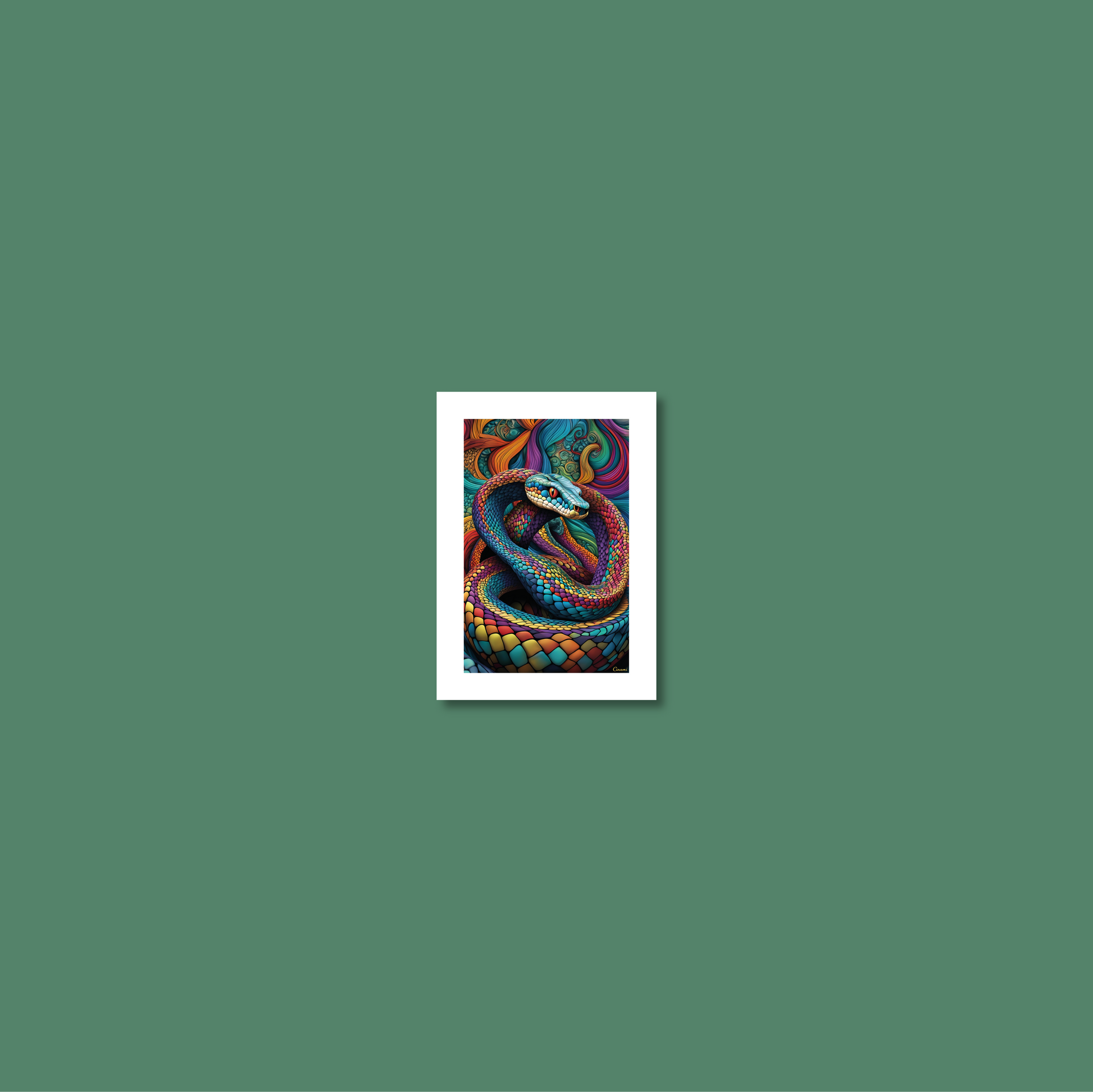 Artistic cobra art print in brightly coloured abstract lines. This design will make a bold statement in any room either alone, or combined with others in this collection to create a feature gallery wall. These posters are available full page or with a white passe-partout style border, and available full colour or black and white.