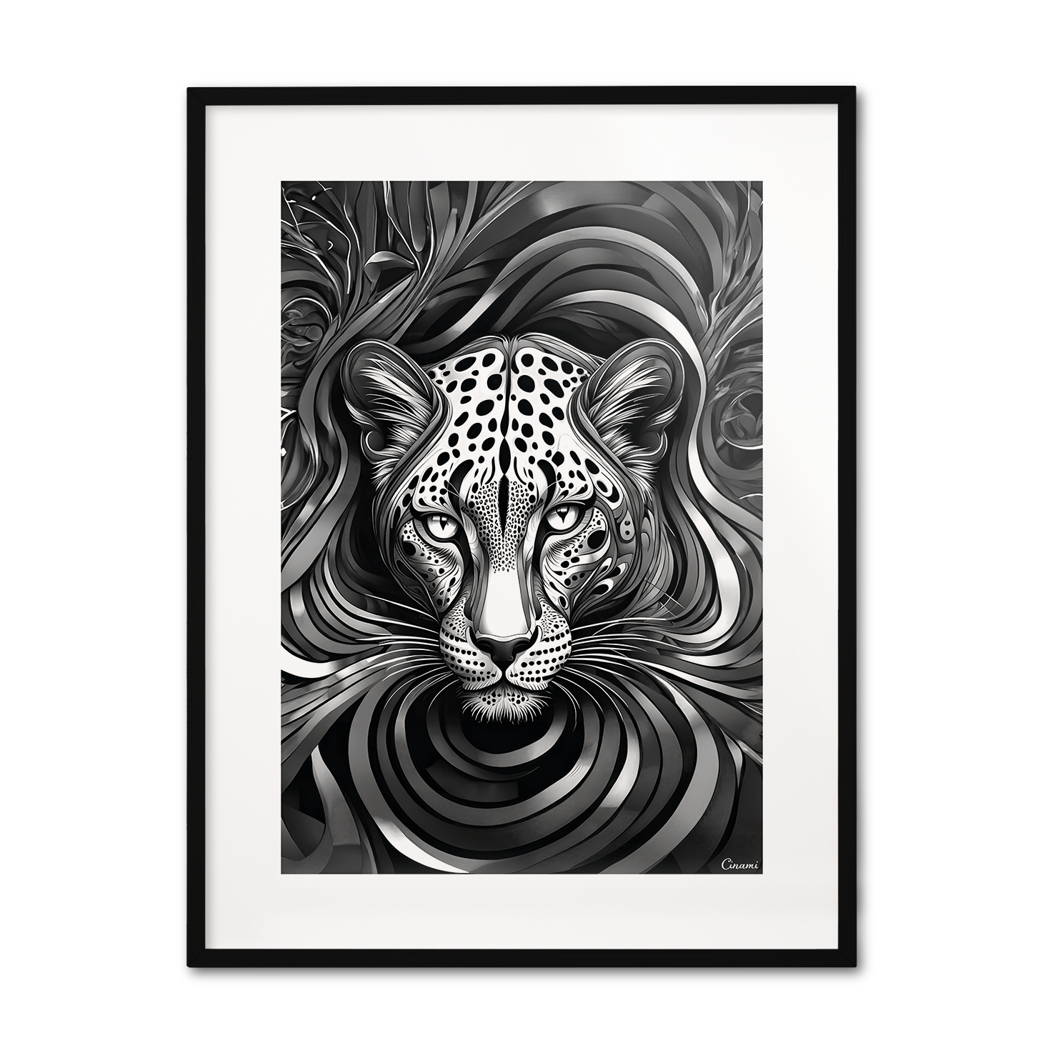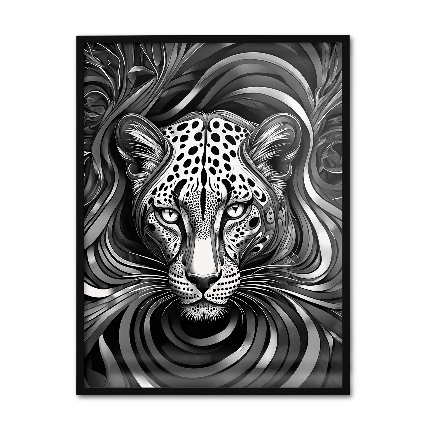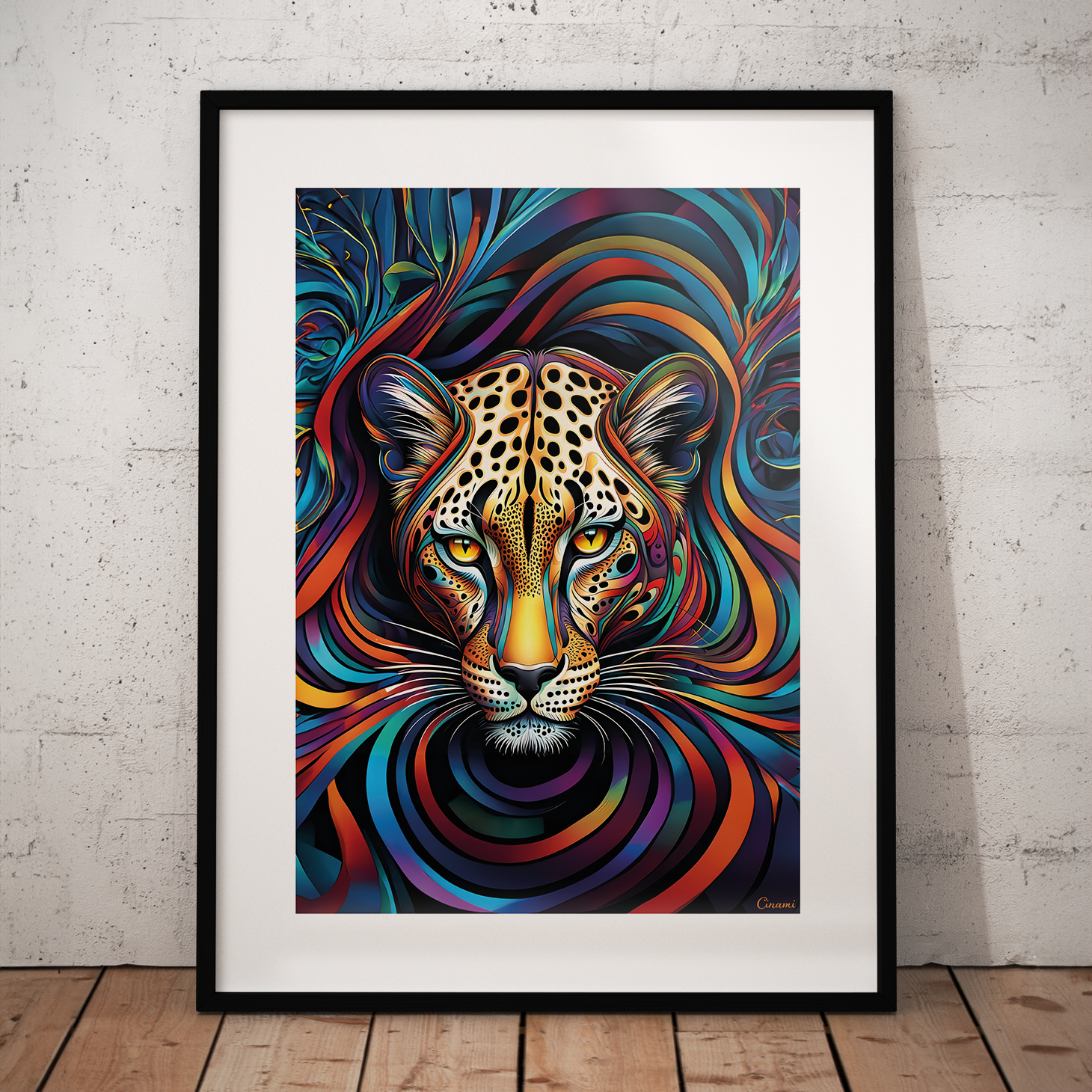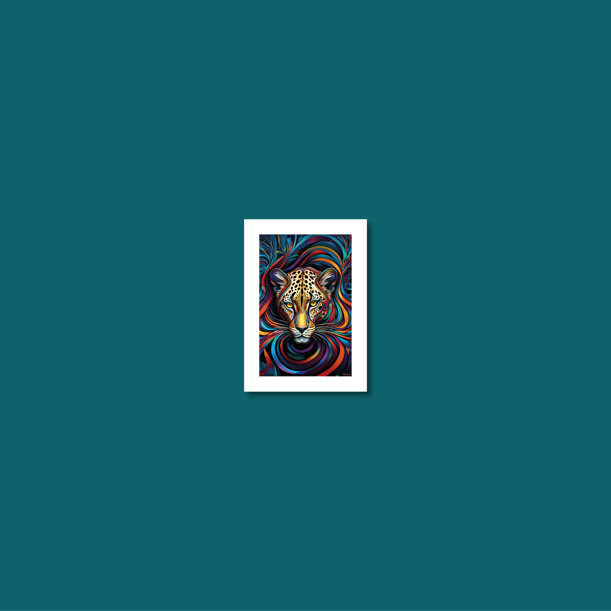 Artistic leopard art print in brightly coloured abstract lines. This design will make a bold statement in any room either alone, or combined with others in this collection to create a feature gallery wall. These posters are available full page or with a white passe-partout style border, and available full colour or black and white.