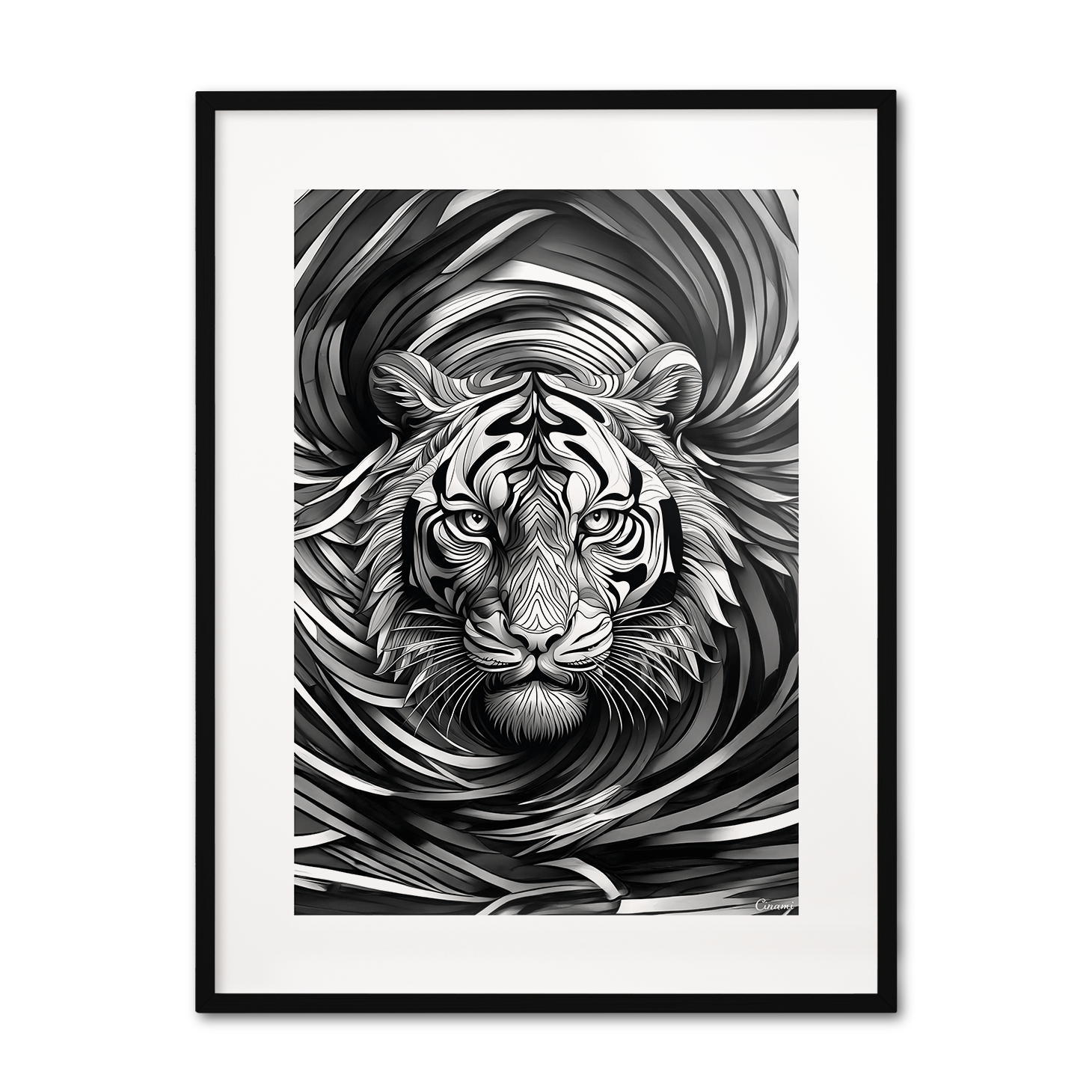 Artistic tiger art print in brightly coloured abstract lines. This design will make a bold statement in any room either alone, or combined with others in this collection to create a feature gallery wall. These posters are available full page or with a white passe-partout style border, and available full colour or black and white.