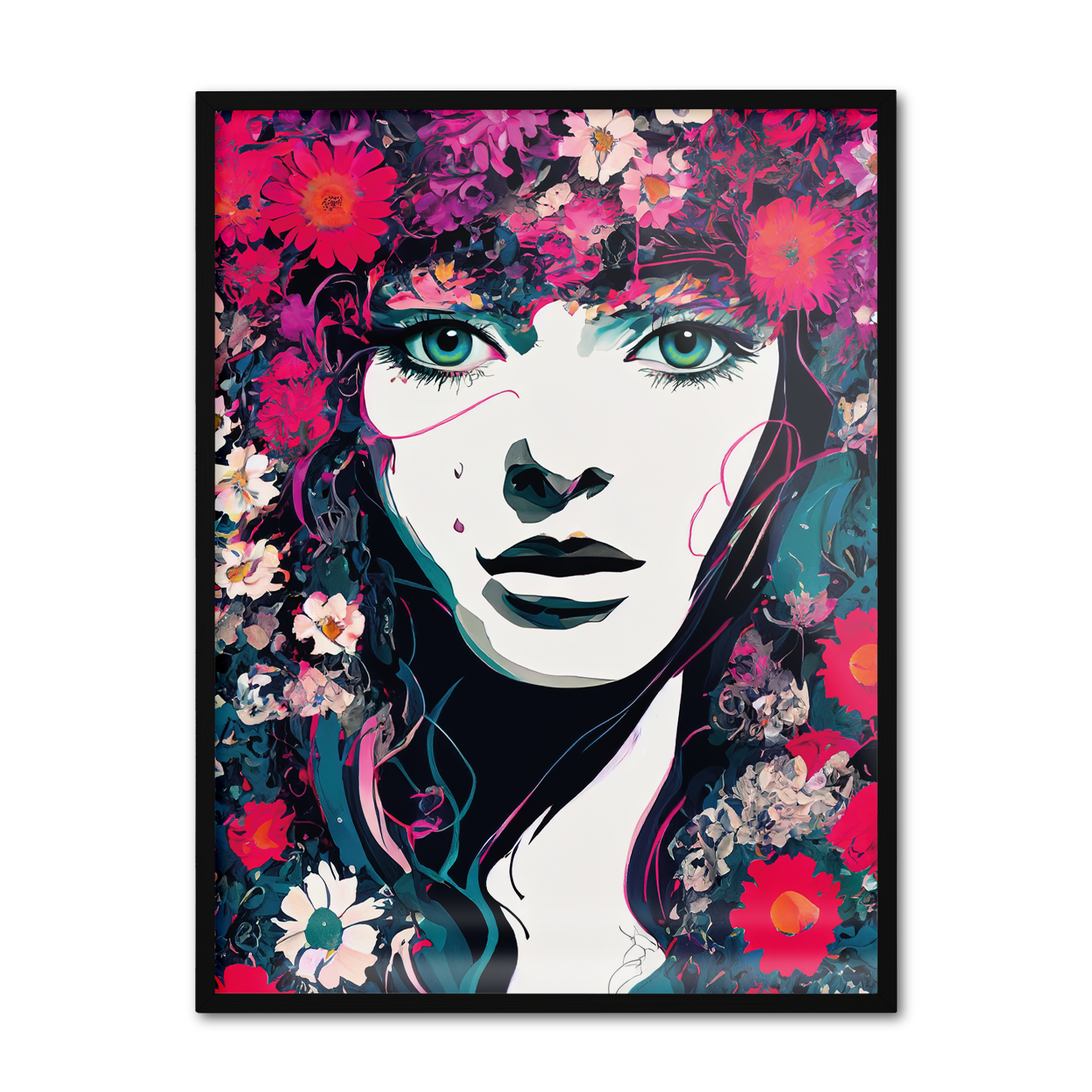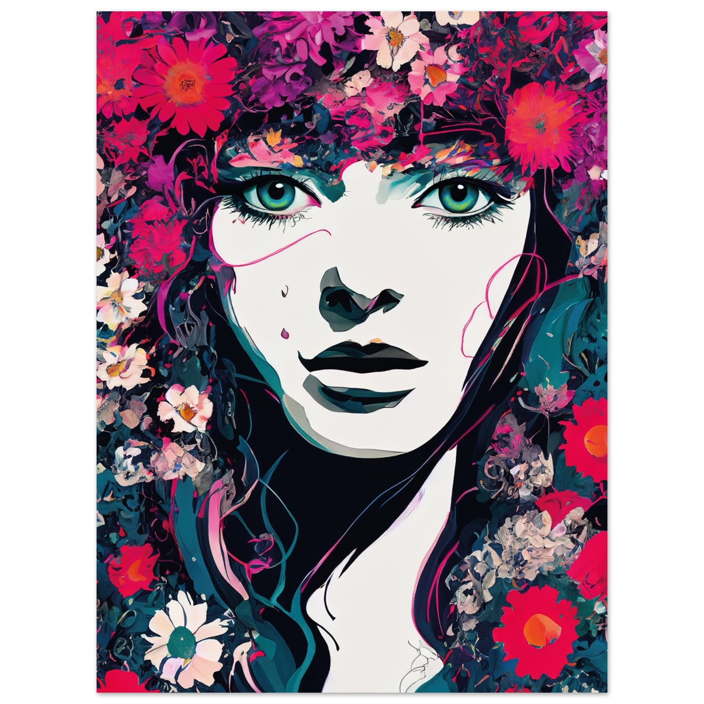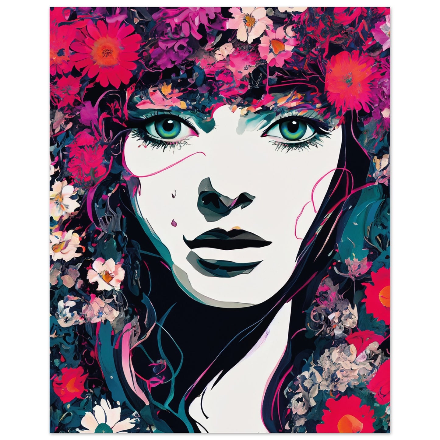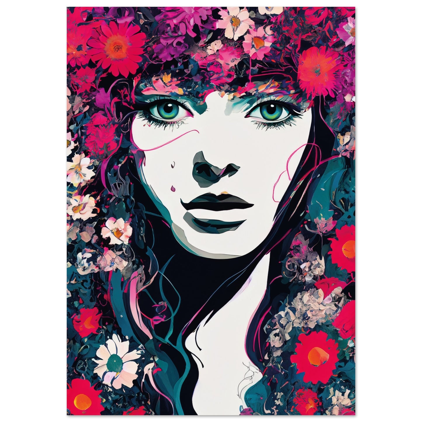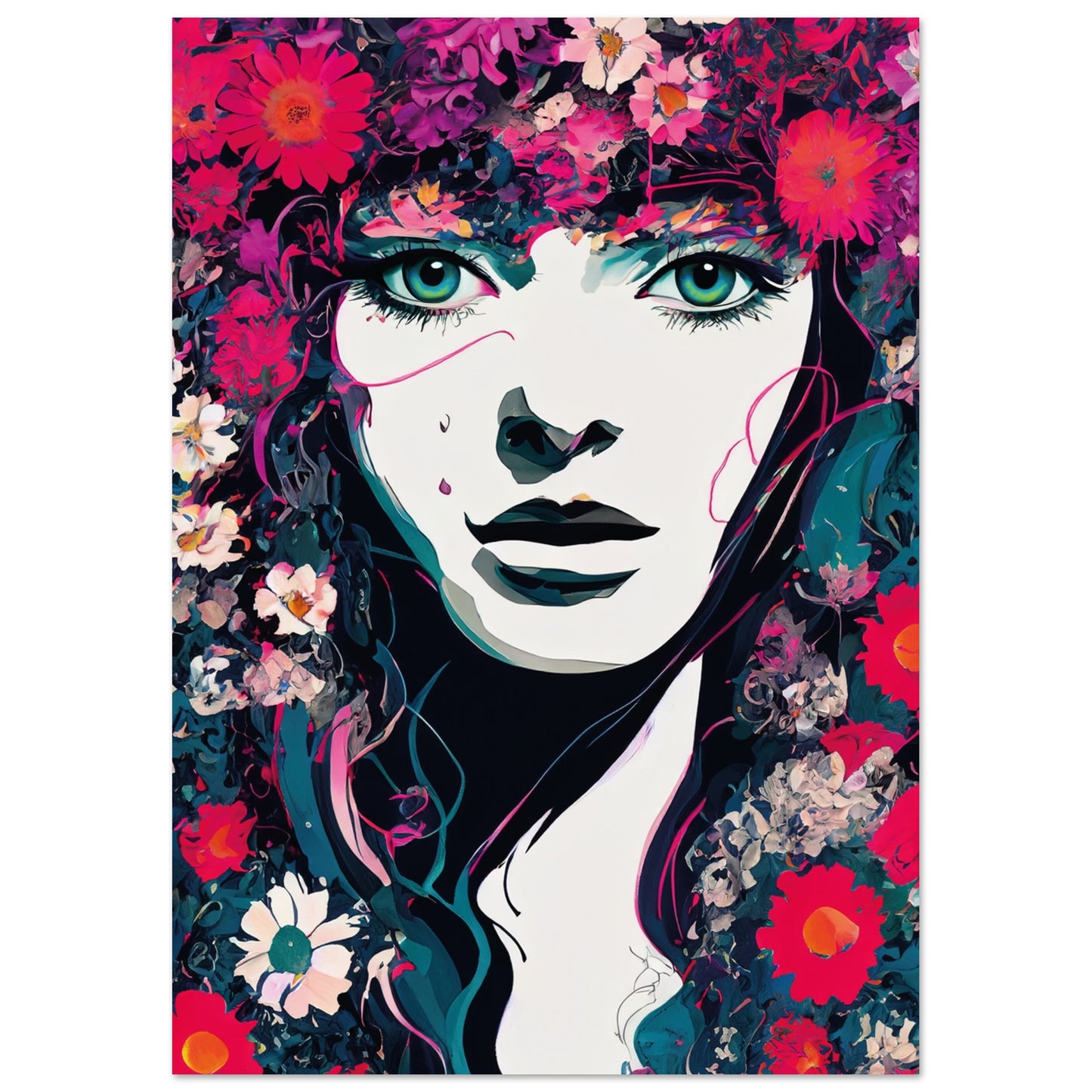 Unframed poster with an abstract illustration of a beautiful woman surrounded by flowers in bright pinks and purples with jade coloured accents.