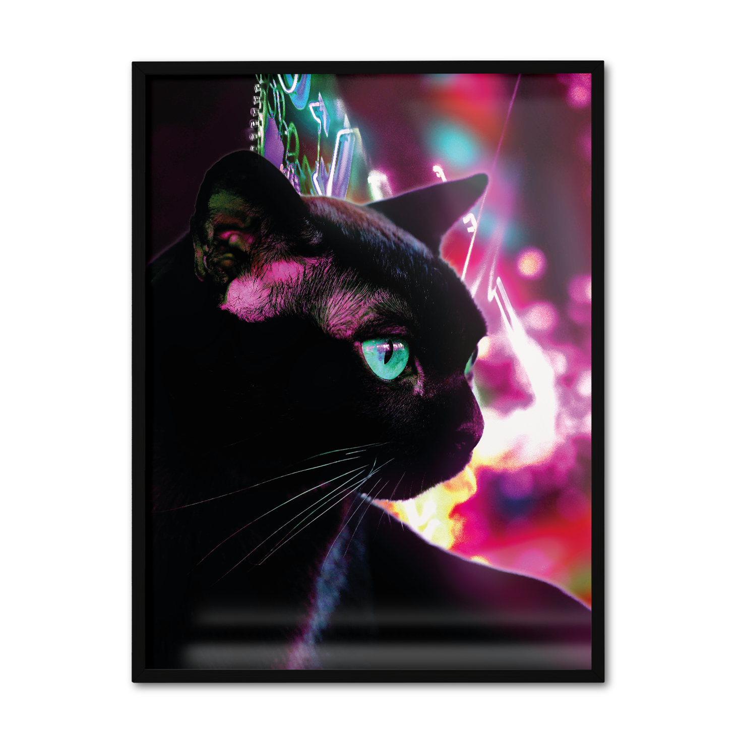 Stunning posters of beautiful black, city cats in the neon lights of a future city. These stunning cats have beautiful, brightly coloured eyes reflecting the neon city lights.