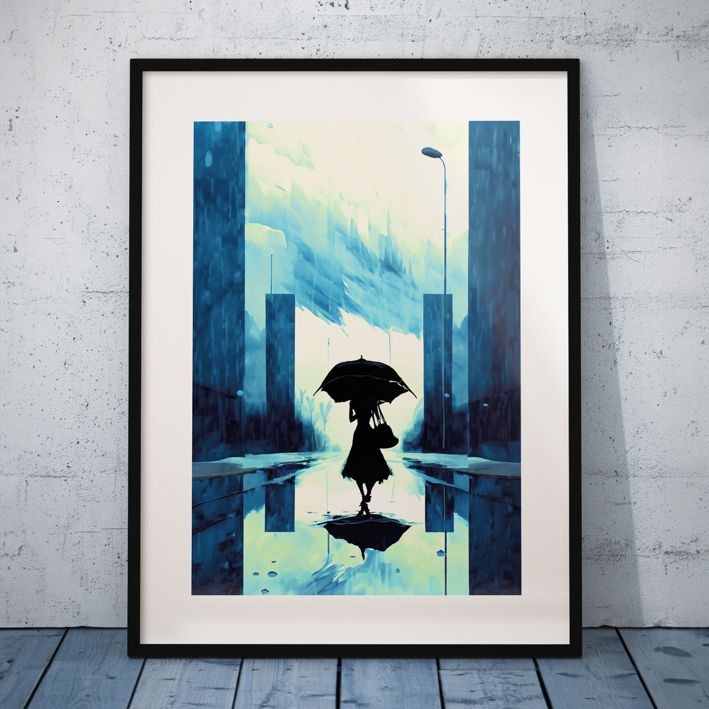 Unframed poster of a lone woman walking in the rain. Done in moody and atmospheric blues and yellows, this artwork will make a striking addition to your home.