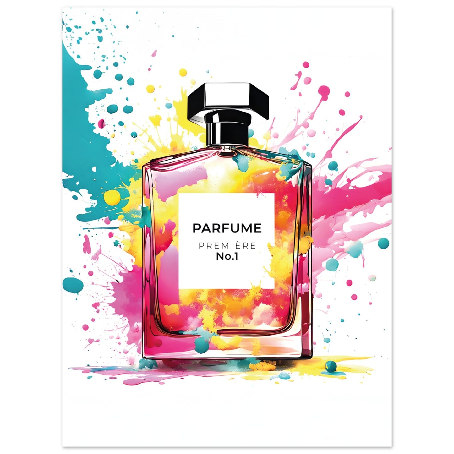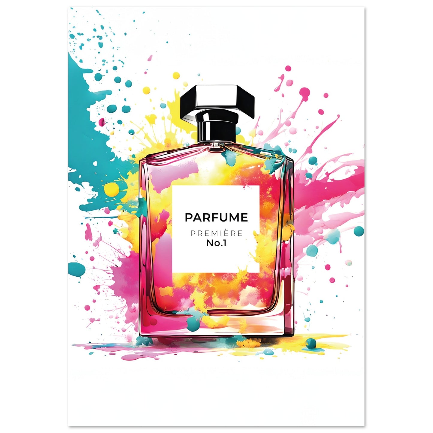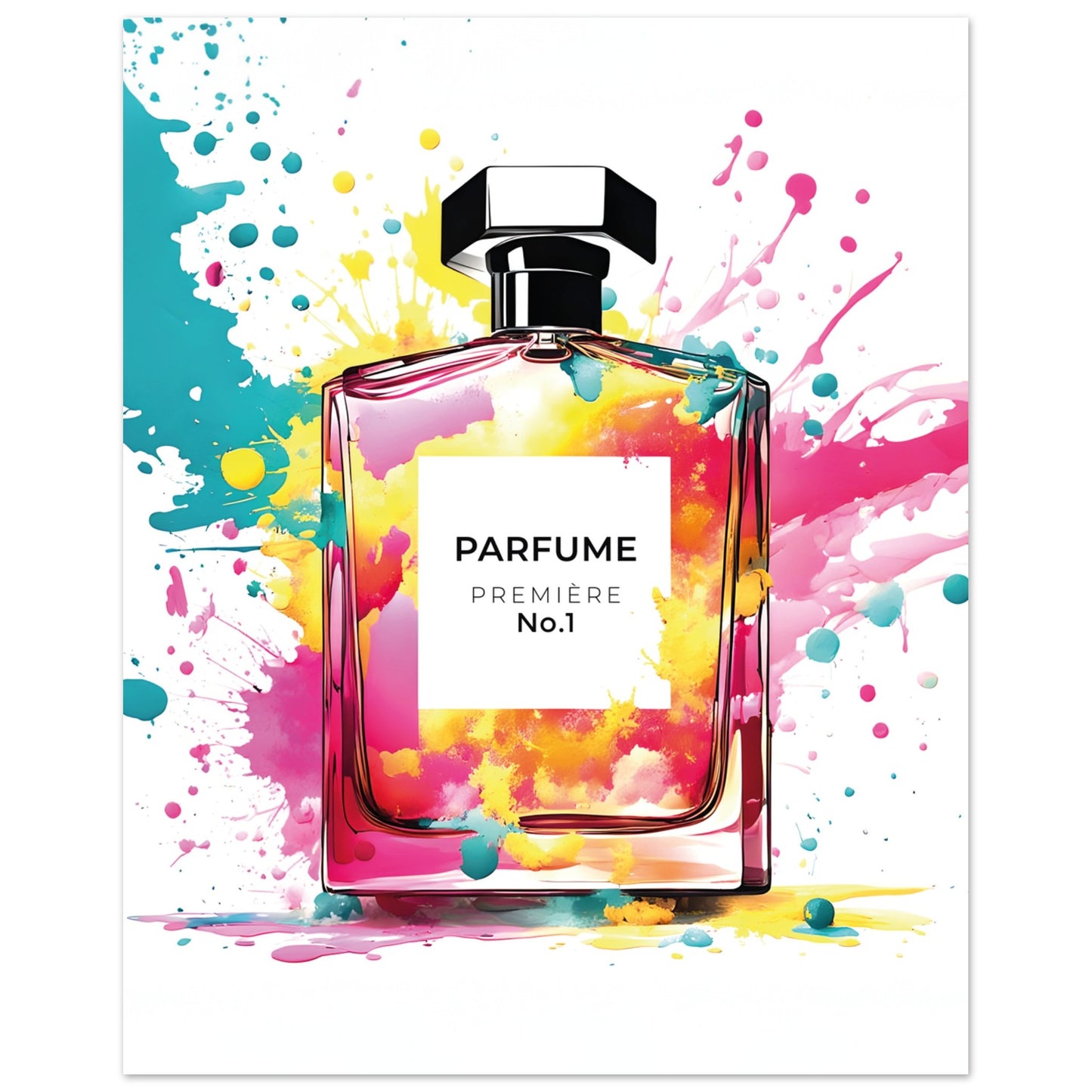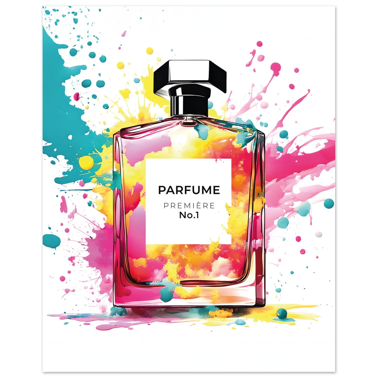Unframed poster of a glass perfume bottle with bold and bright paint spatter. Pairs beautifully with PAINT STILETTOS art print.