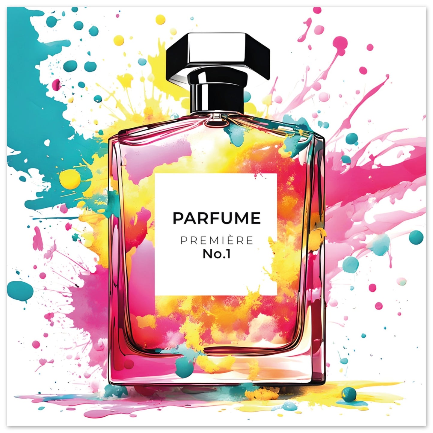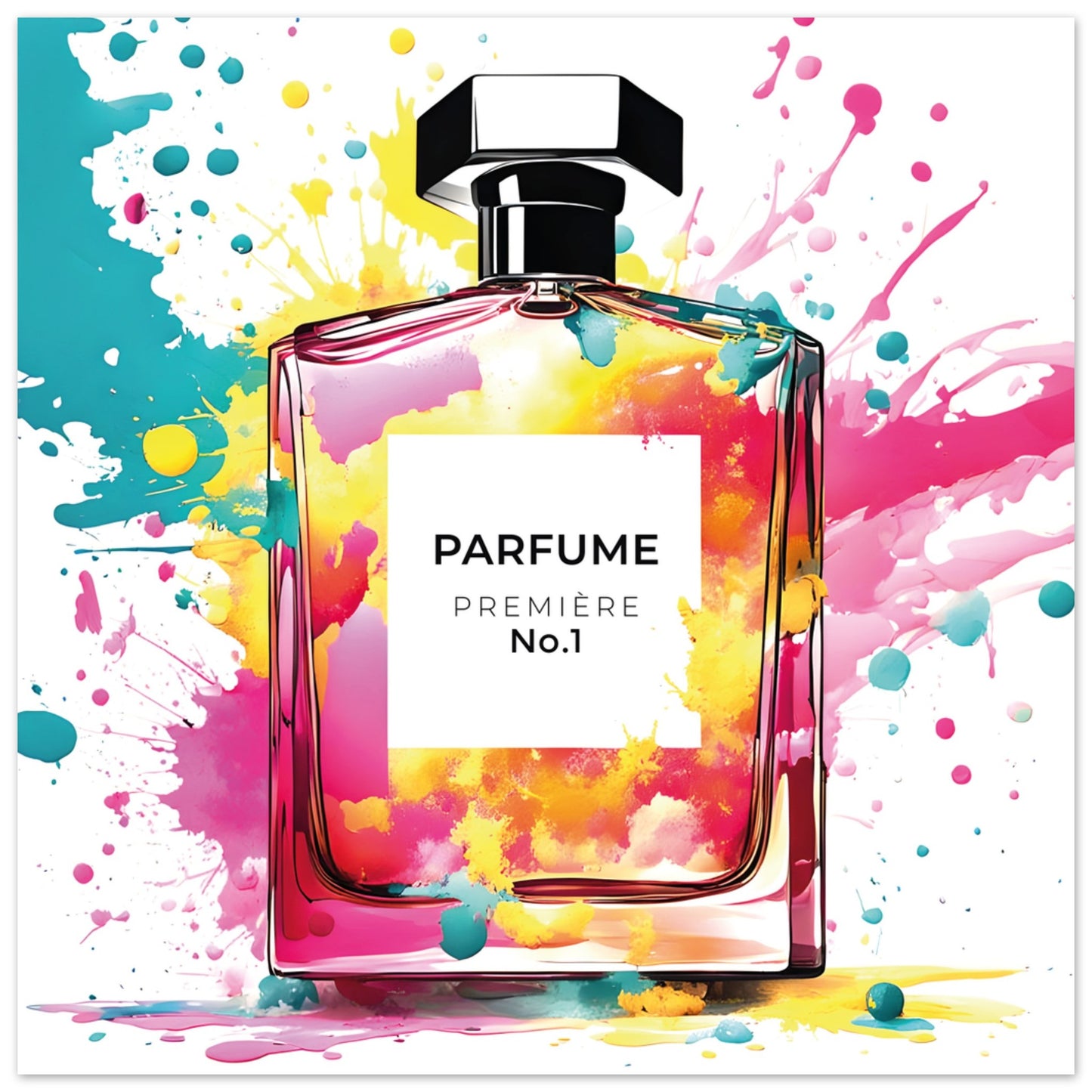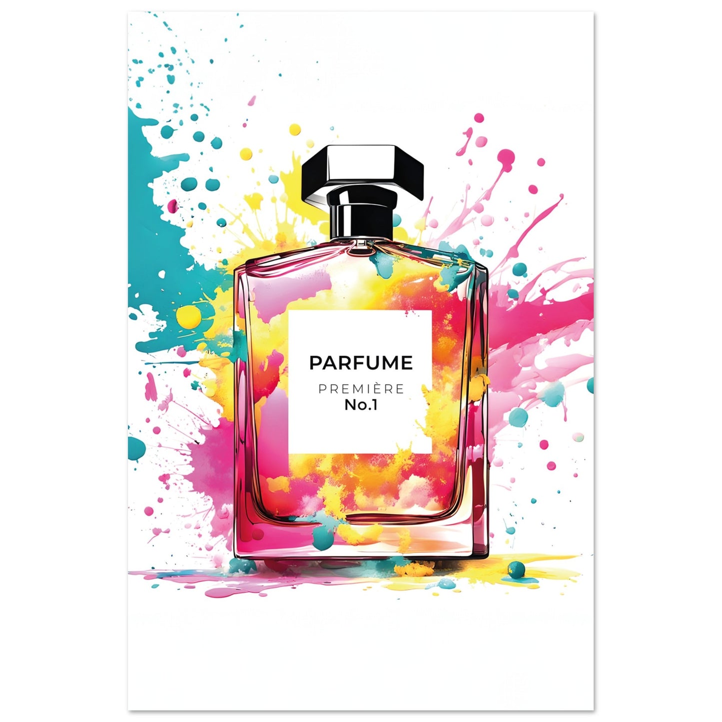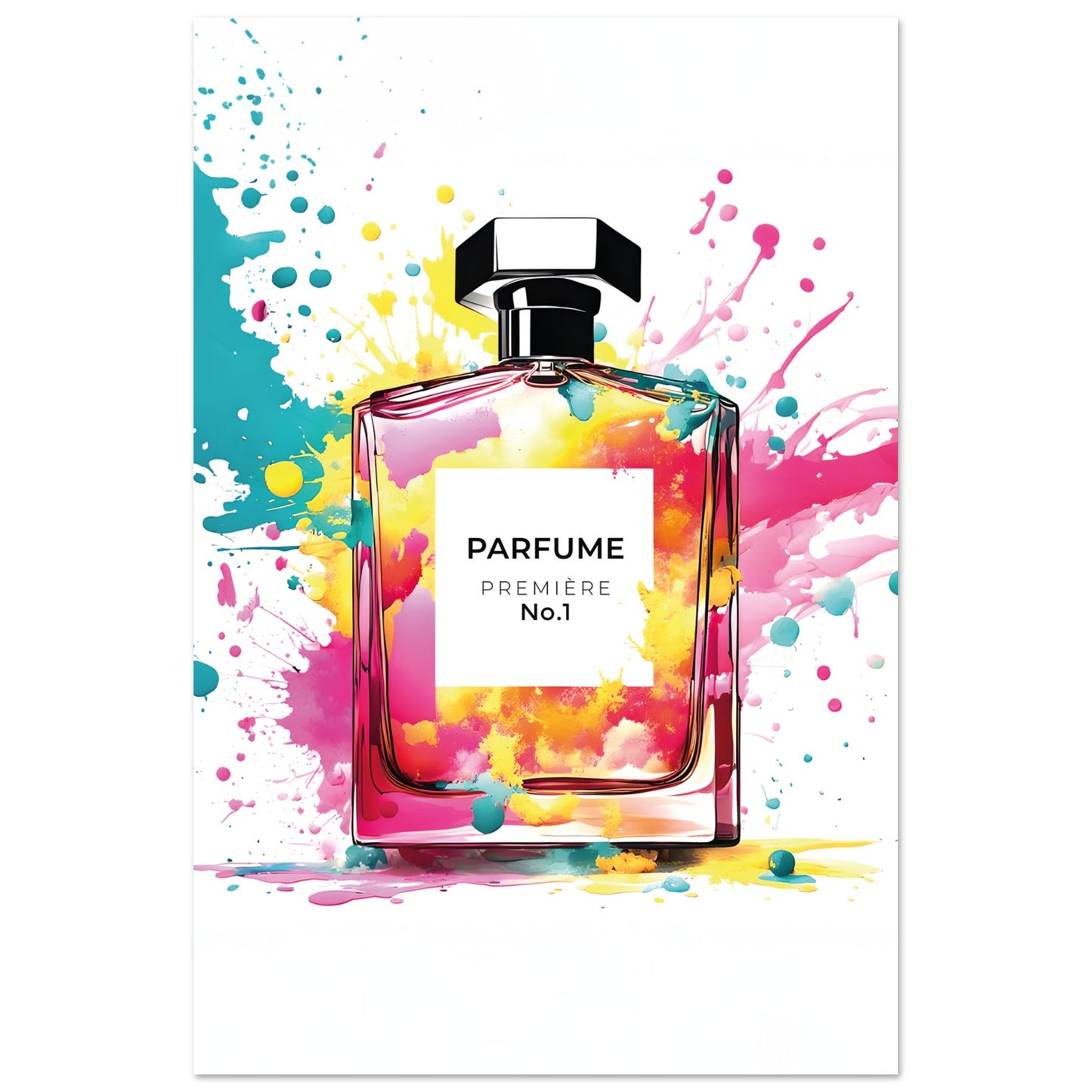 Unframed poster of a glass perfume bottle with bold and bright paint spatter. Pairs beautifully with PAINT STILETTOS art print.