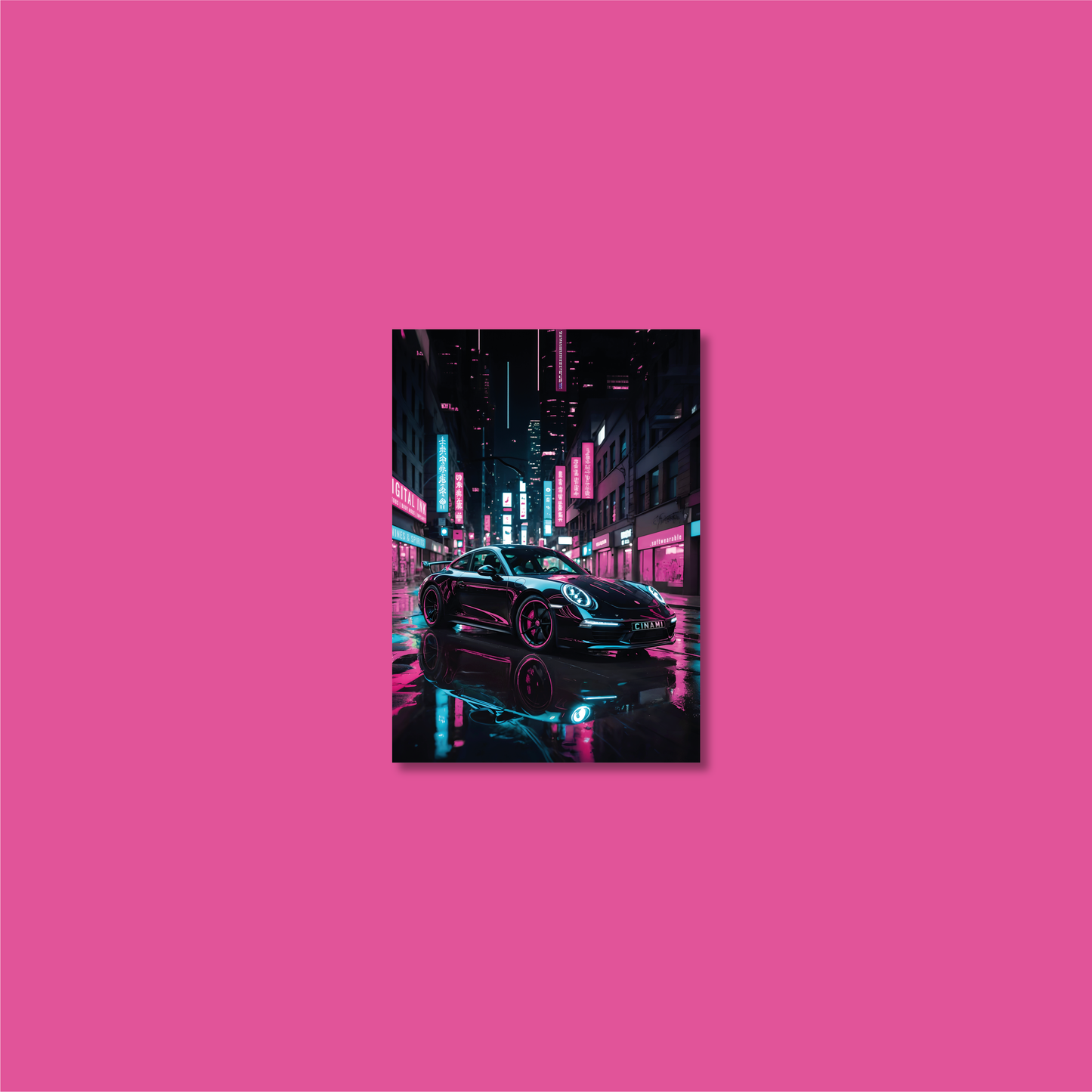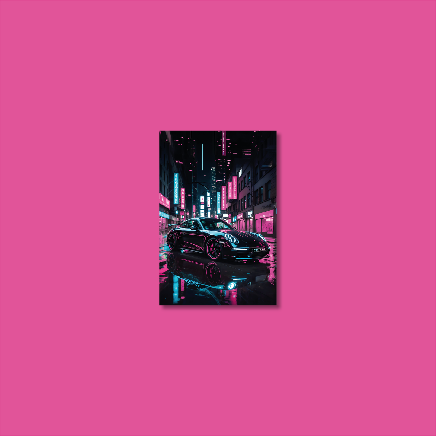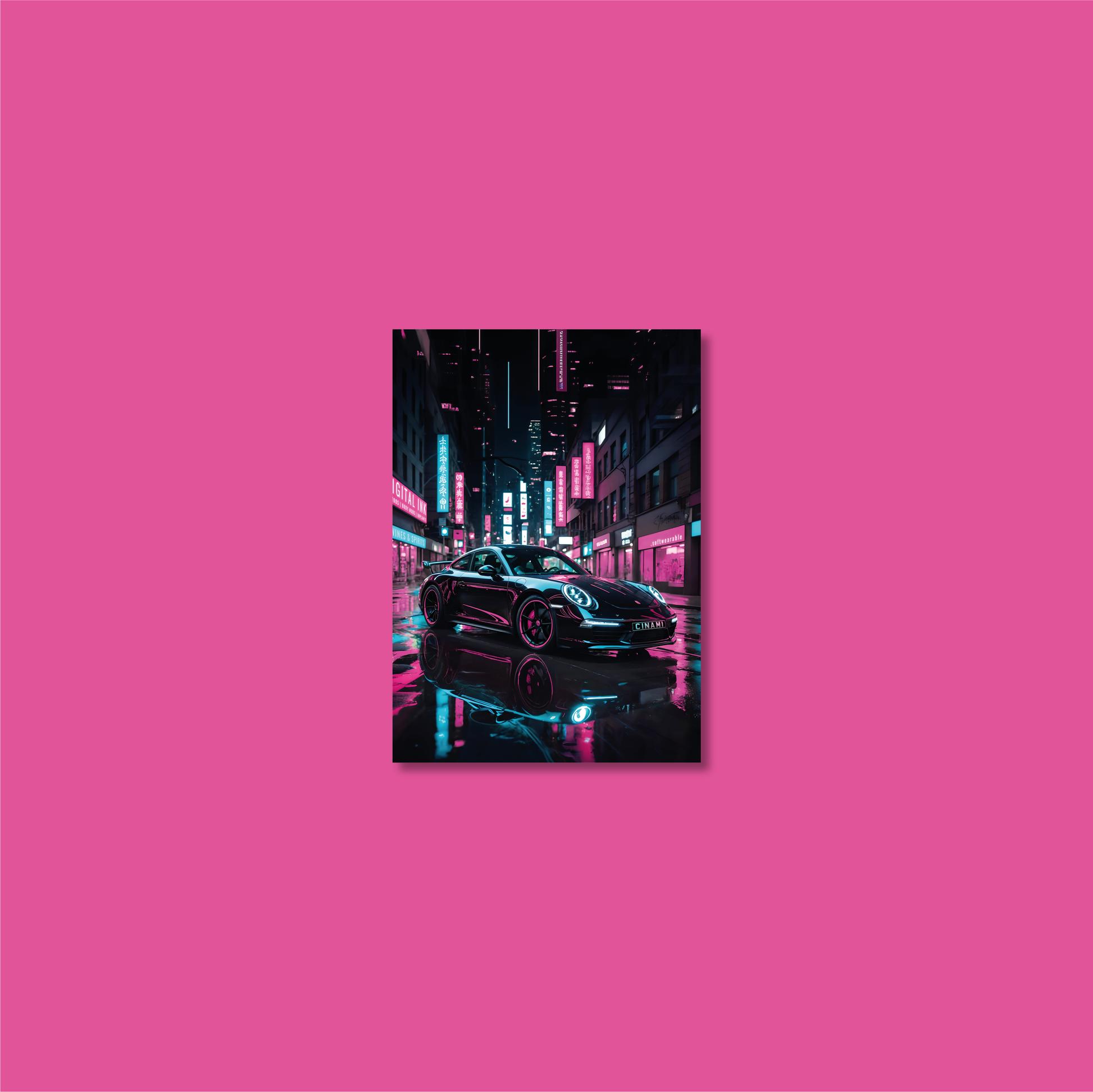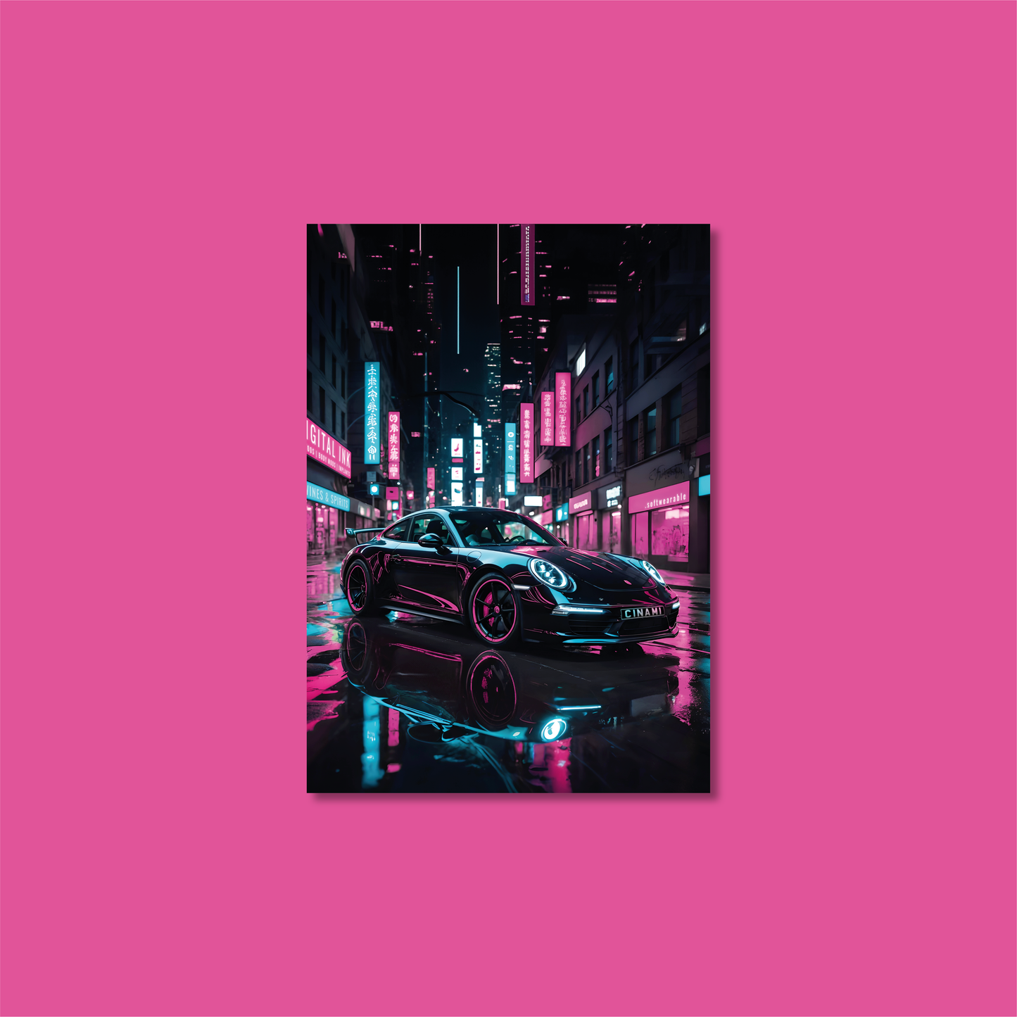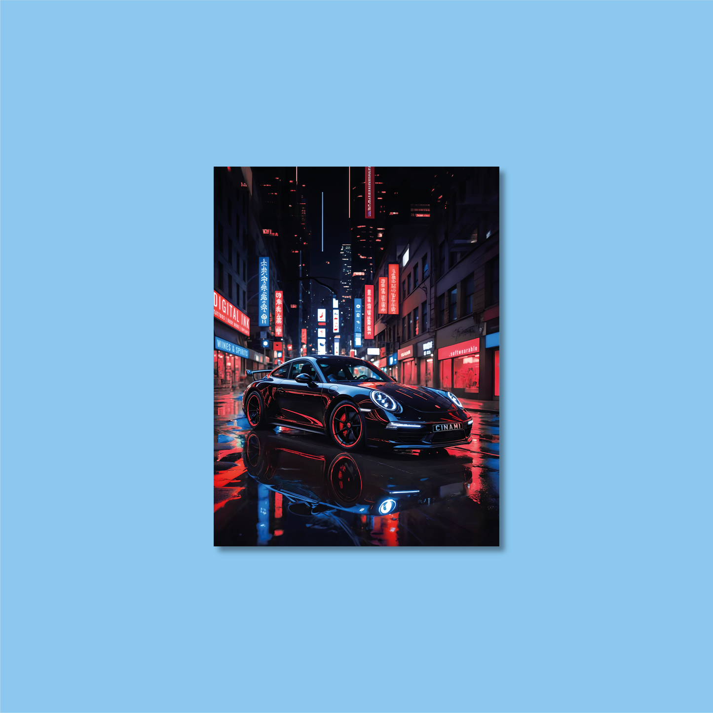 Photographic style poster of a beautiful Porsche 911. Set in the futuristic, neon lights of a cyberpunk cityscape, the watery reflections give an atmospheric feel and will make a stunning art piece to display on a feature wall. There are two designs in this collection, one showing the front of the vehicle and one showing the rear. They can be purchased alone or together to make a really impactful art display. This design is available in 5 colour options and comes with personalisation of the registration plate. Please be sure to include your chosen name within 24 hours of purchase on the personalisation information contact form, available on the product page. If no information is received within this time, the standard name of CINAMI will be used in your final print.