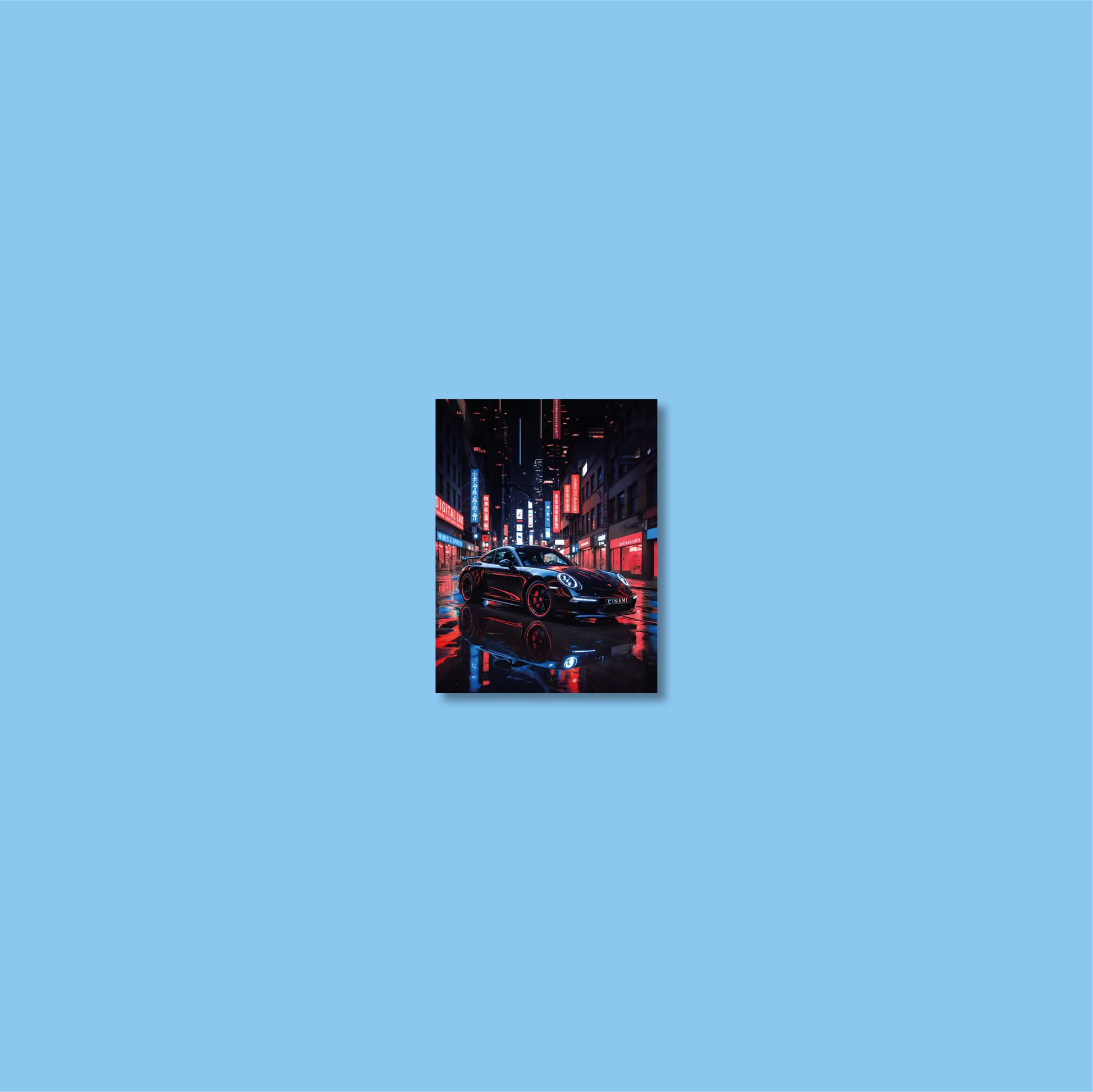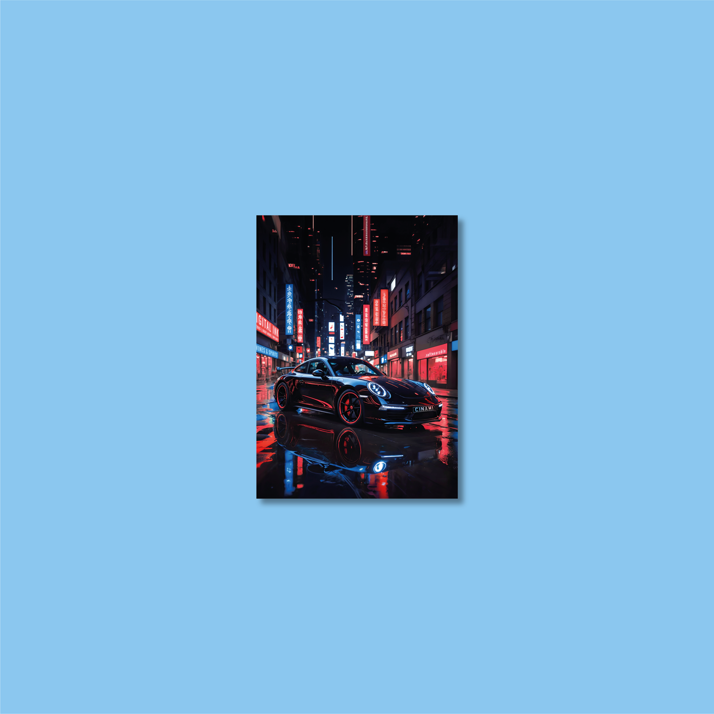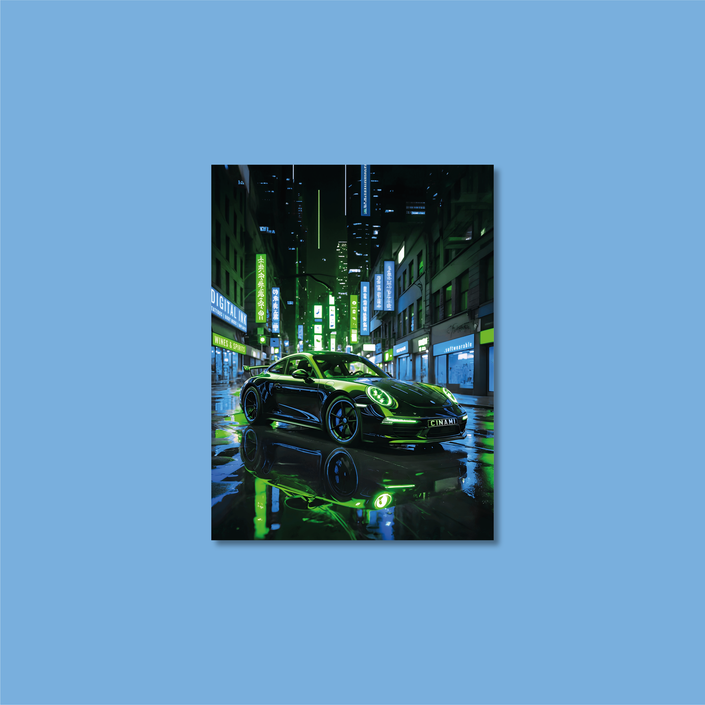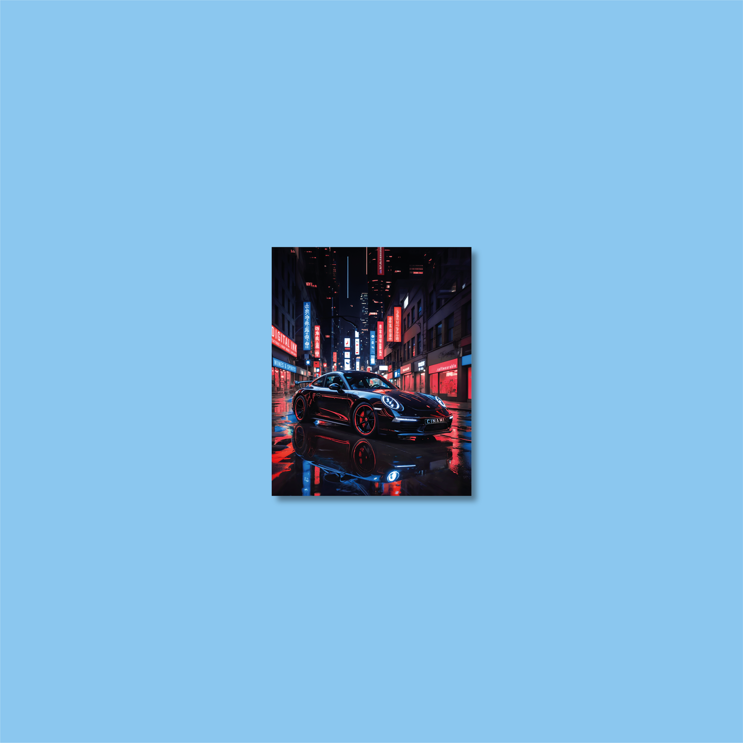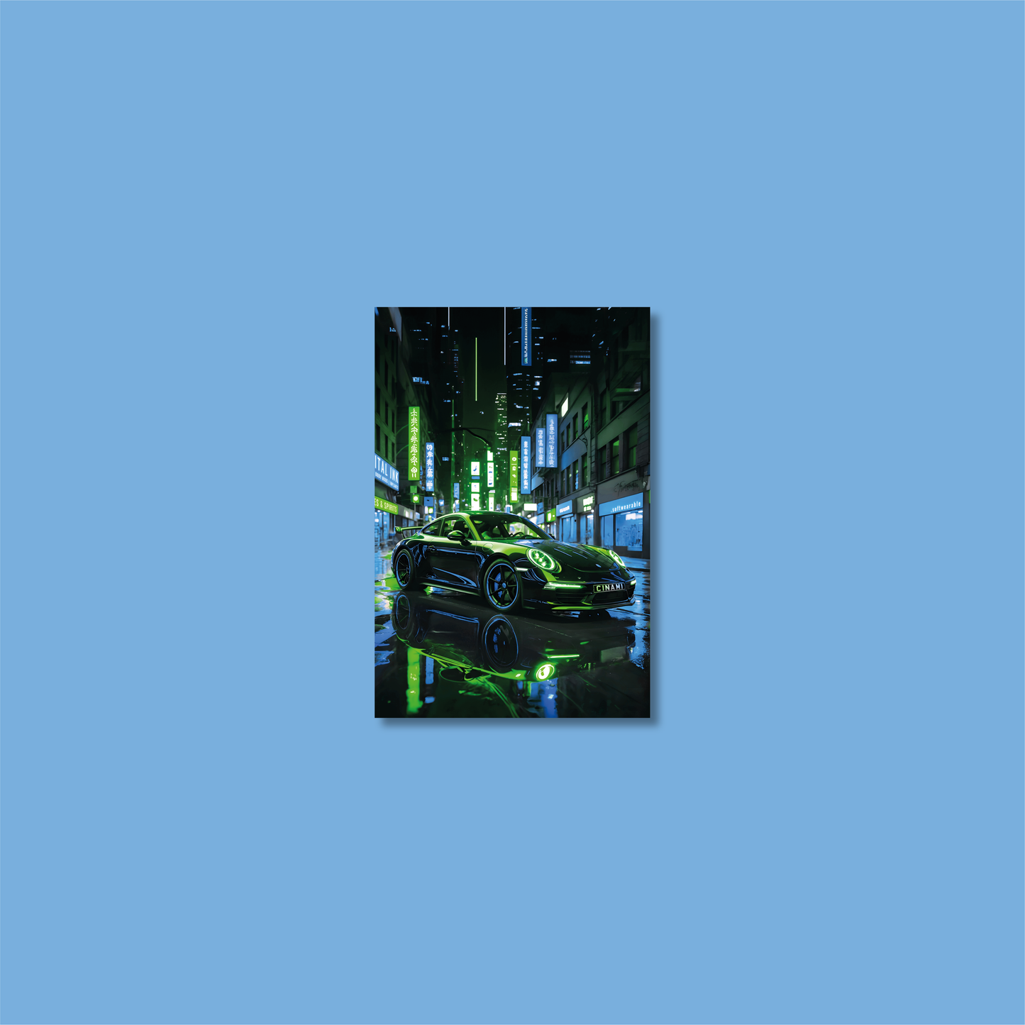 Photographic style poster of a beautiful Porsche 911. Set in the futuristic, neon lights of a cyberpunk cityscape, the watery reflections give an atmospheric feel and will make a stunning art piece to display on a feature wall. There are two designs in this collection, one showing the front of the vehicle and one showing the rear. They can be purchased alone or together to make a really impactful art display. This design is available in 5 colour options and comes with personalisation of the registration plate. Please be sure to include your chosen name within 24 hours of purchase on the personalisation information contact form, available on the product page. If no information is received within this time, the standard name of CINAMI will be used in your final print.
