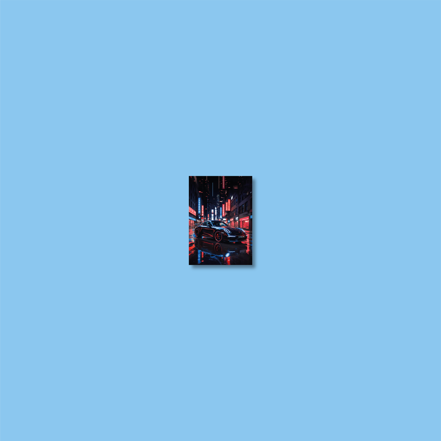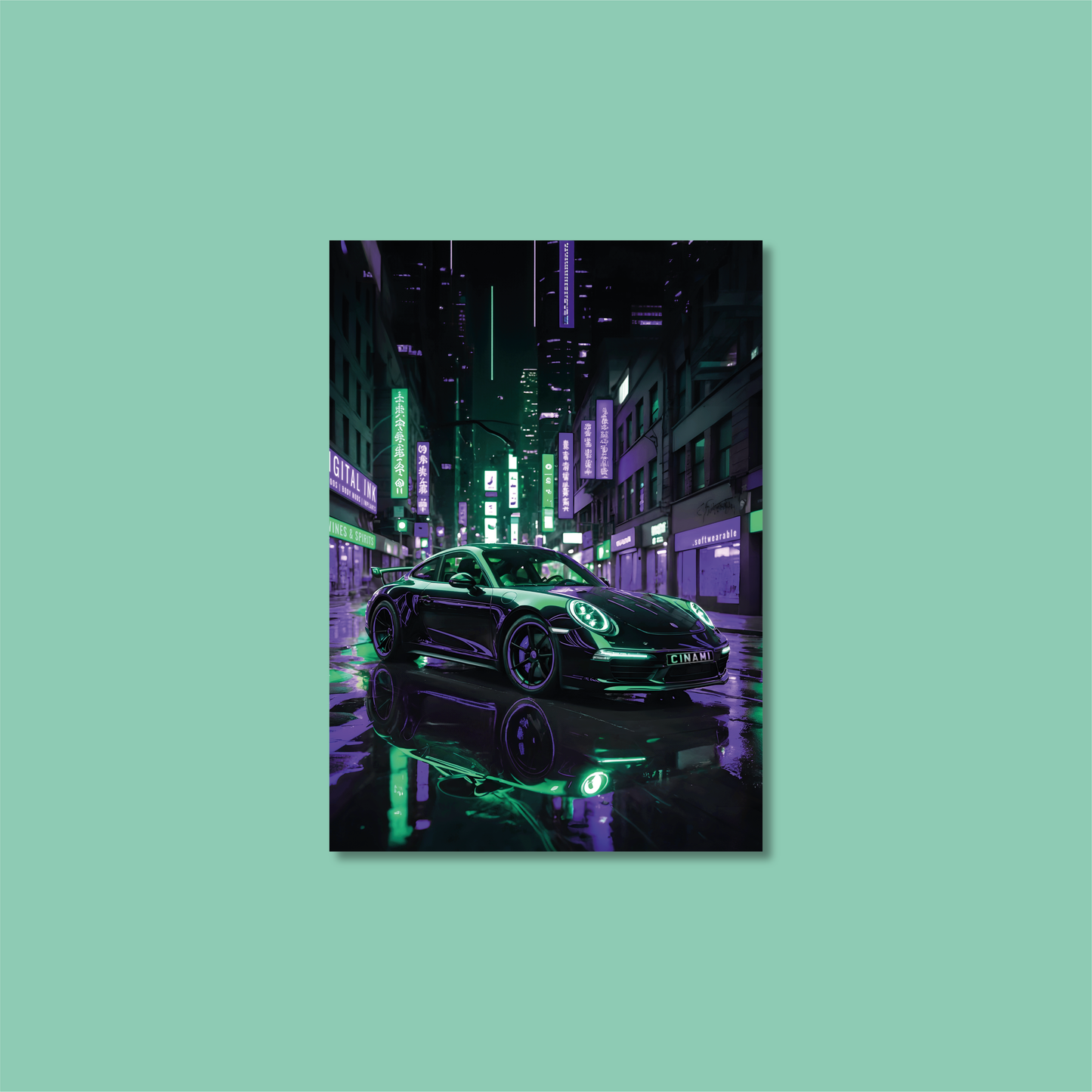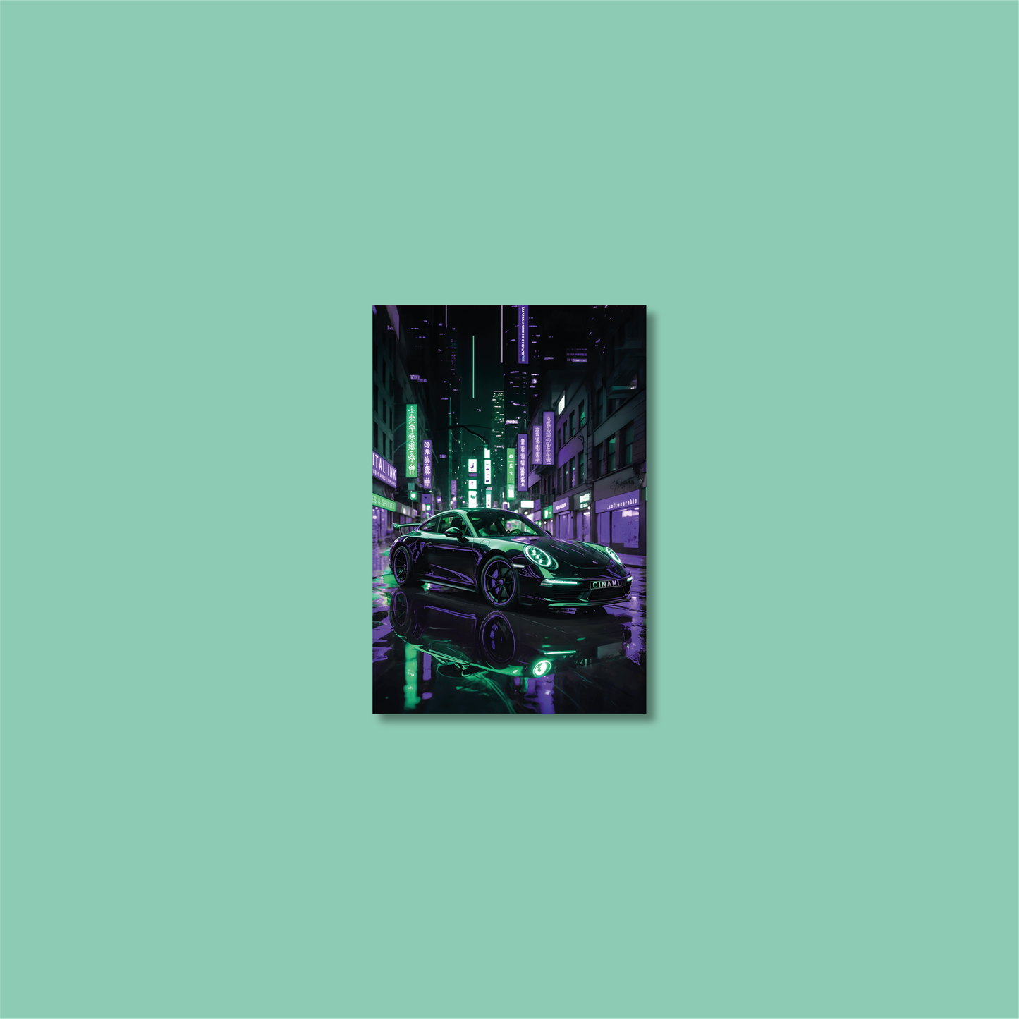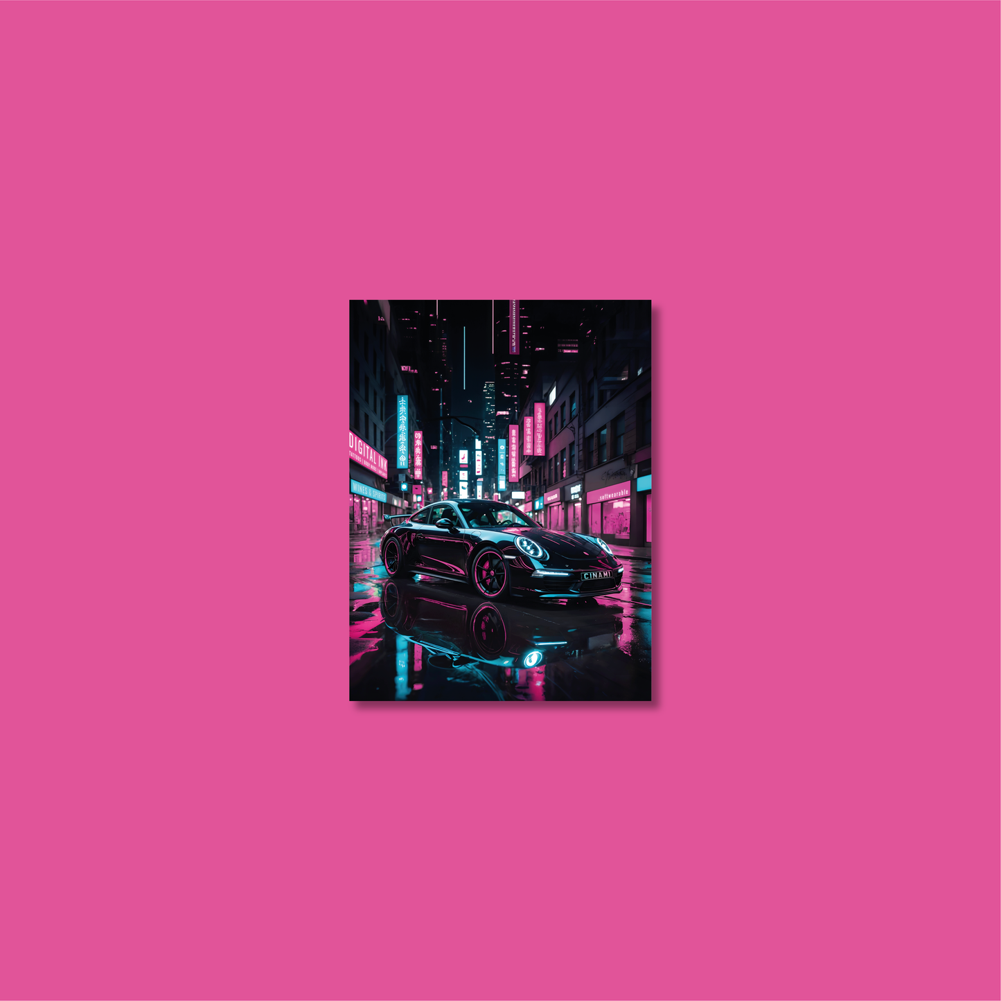 Photographic style poster of a beautiful Porsche 911. Set in the futuristic, neon lights of a cyberpunk cityscape, the watery reflections give an atmospheric feel and will make a stunning art piece to display on a feature wall. There are two designs in this collection, one showing the front of the vehicle and one showing the rear. They can be purchased alone or together to make a really impactful art display. This design is available in 5 colour options and comes with personalisation of the registration plate. Please be sure to include your chosen name within 24 hours of purchase on the personalisation information contact form, available on the product page. If no information is received within this time, the standard name of CINAMI will be used in your final print.