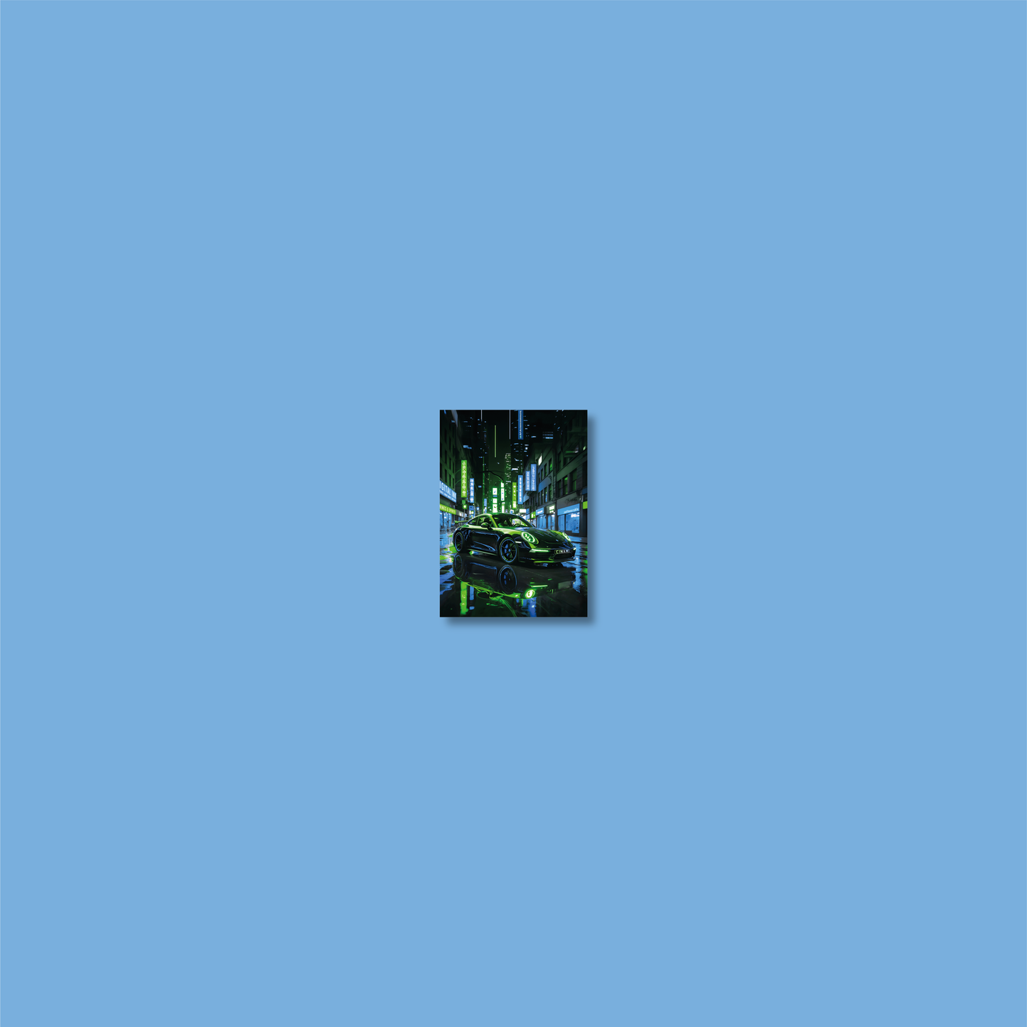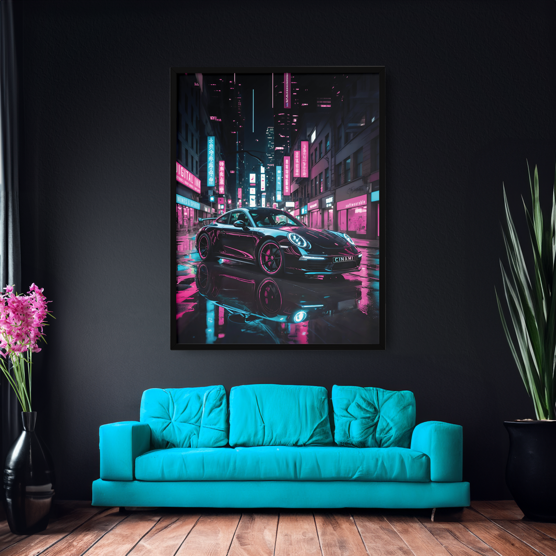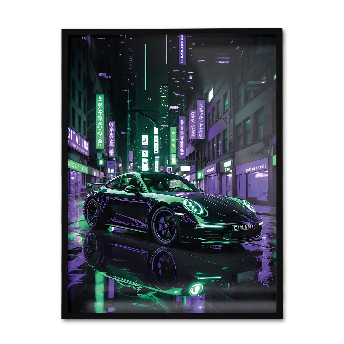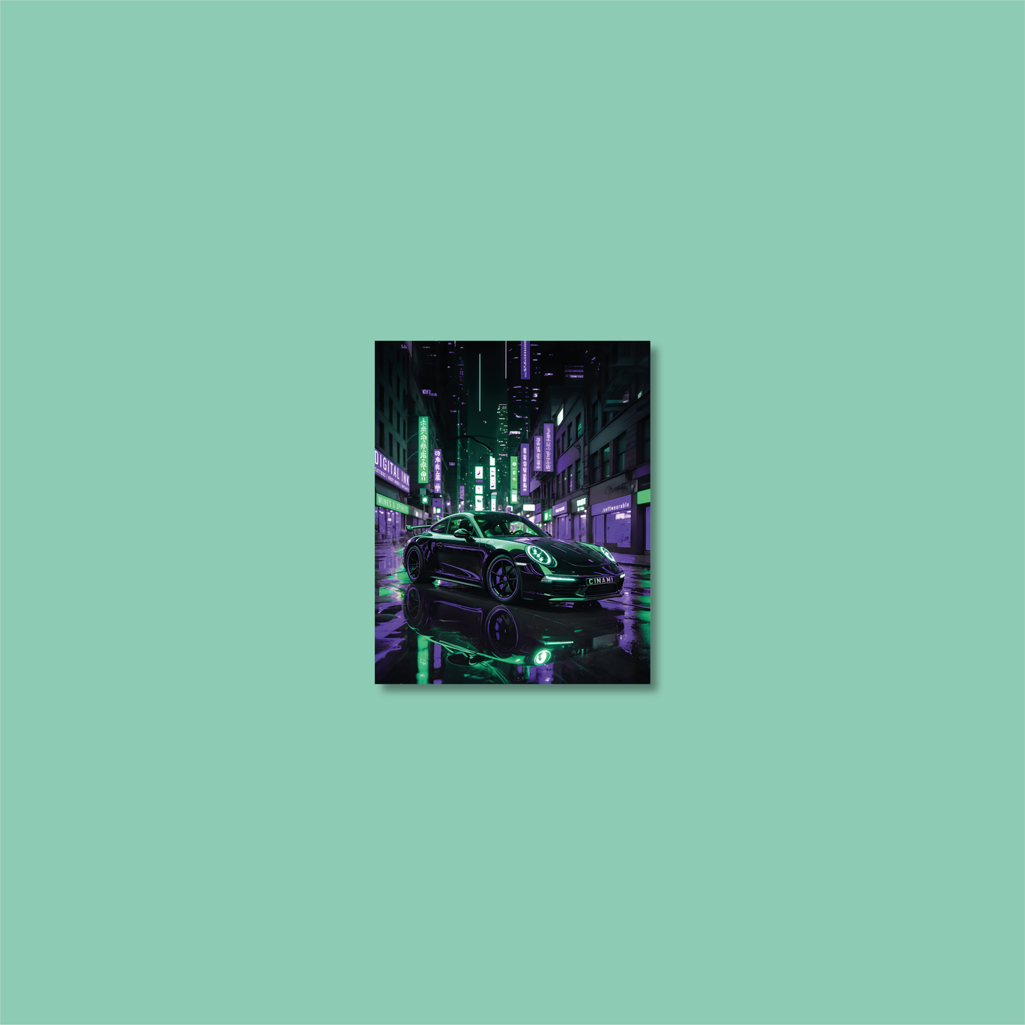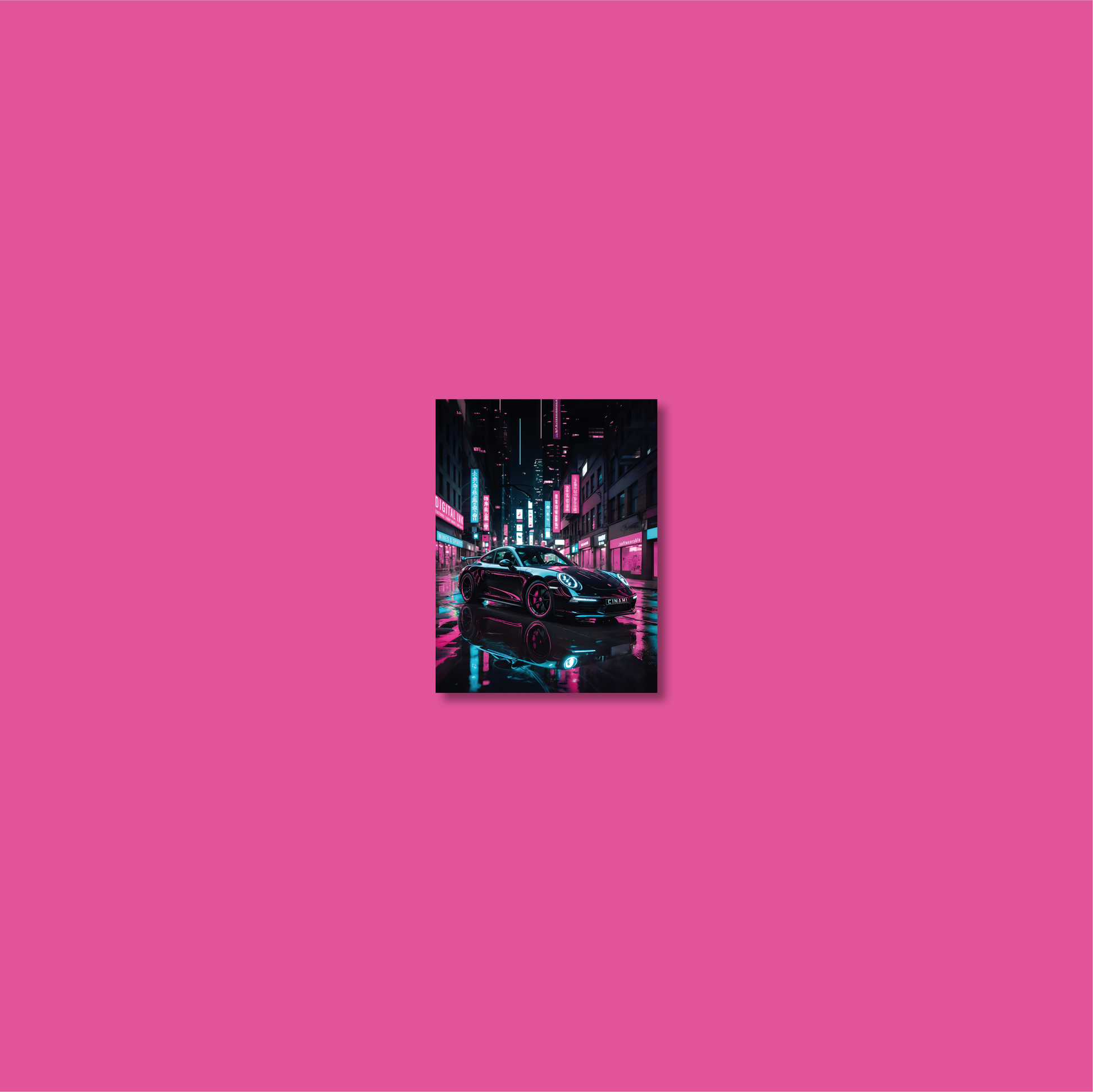 Photographic style poster of a beautiful Porsche 911. Set in the futuristic, neon lights of a cyberpunk cityscape, the watery reflections give an atmospheric feel and will make a stunning art piece to display on a feature wall. There are two designs in this collection, one showing the front of the vehicle and one showing the rear. They can be purchased alone or together to make a really impactful art display. This design is available in 5 colour options and comes with personalisation of the registration plate. Please be sure to include your chosen name within 24 hours of purchase on the personalisation information contact form, available on the product page. If no information is received within this time, the standard name of CINAMI will be used in your final print.