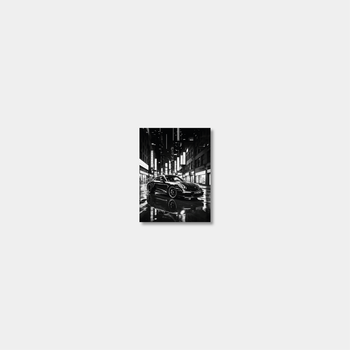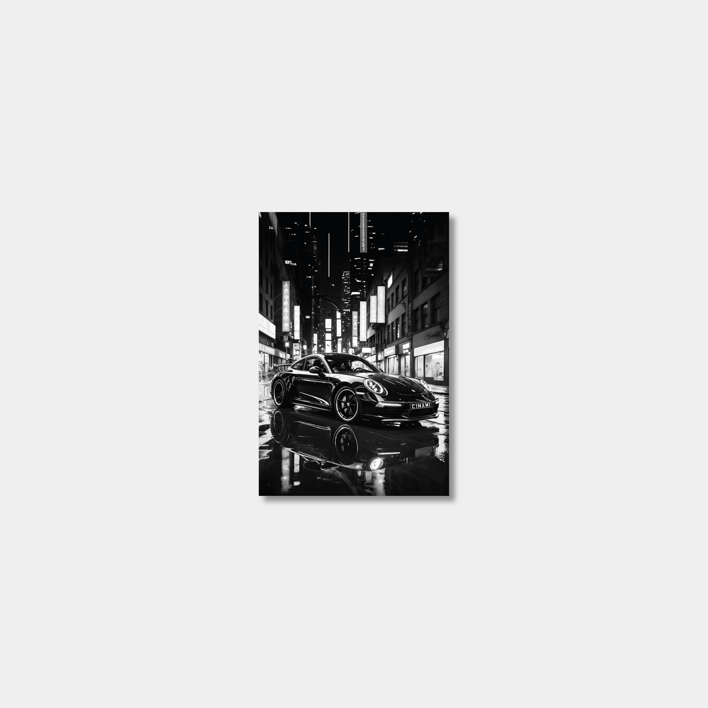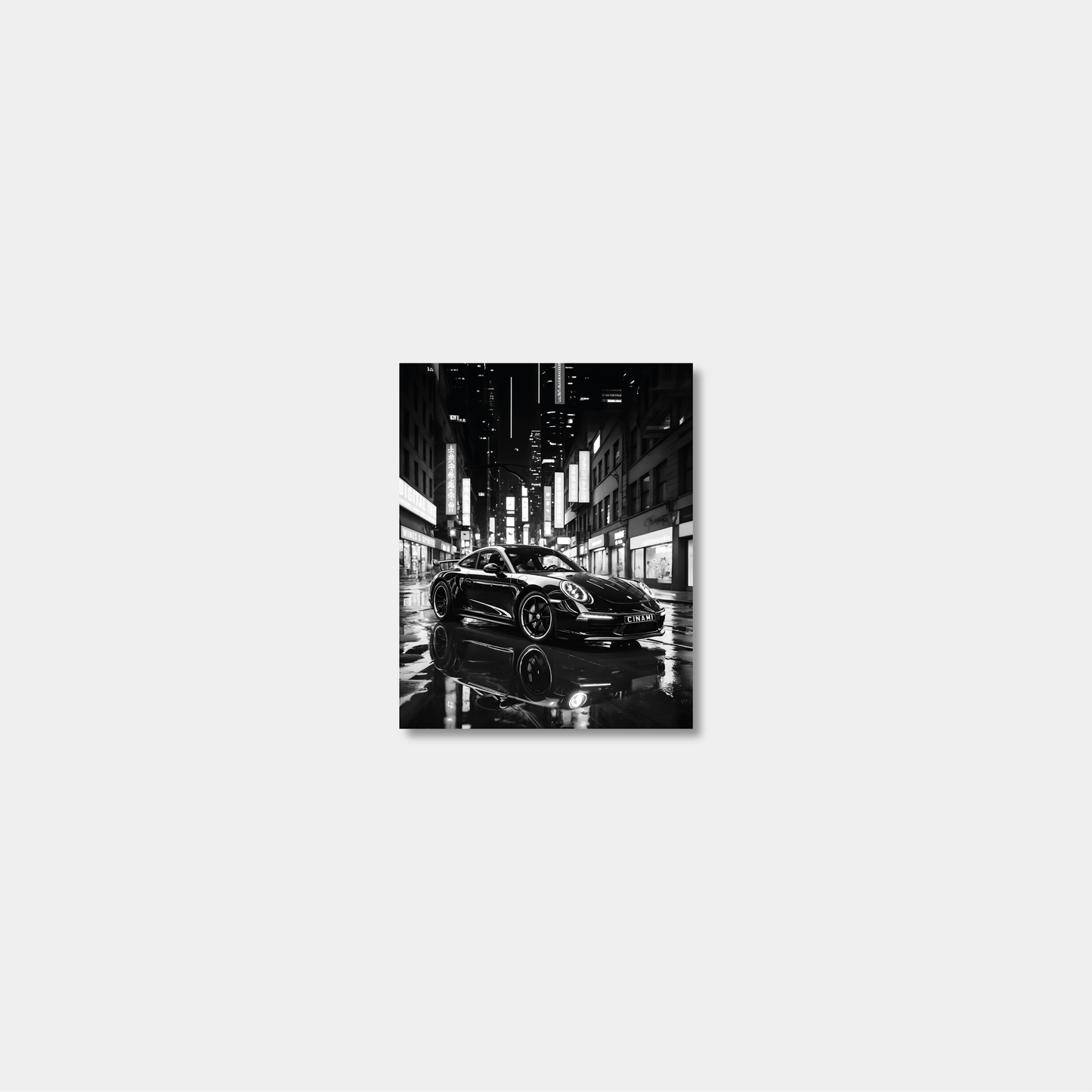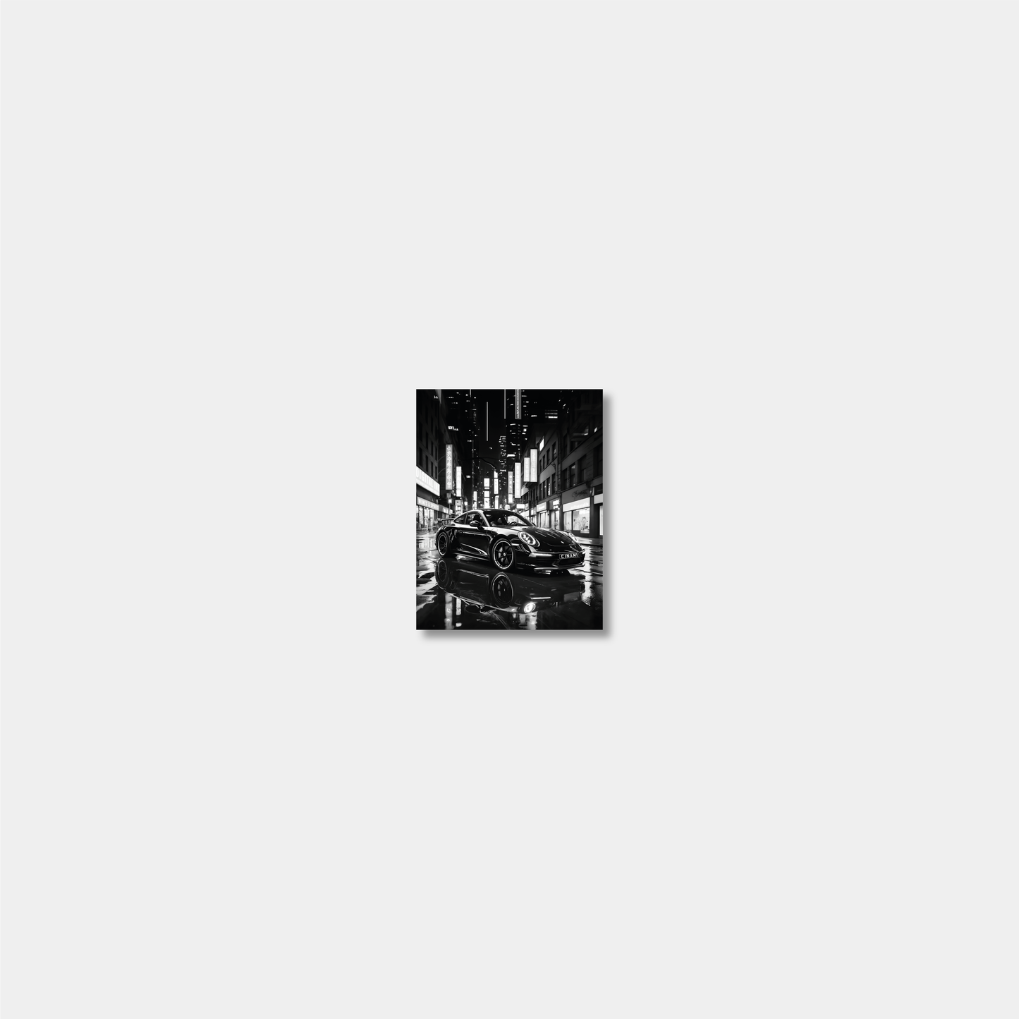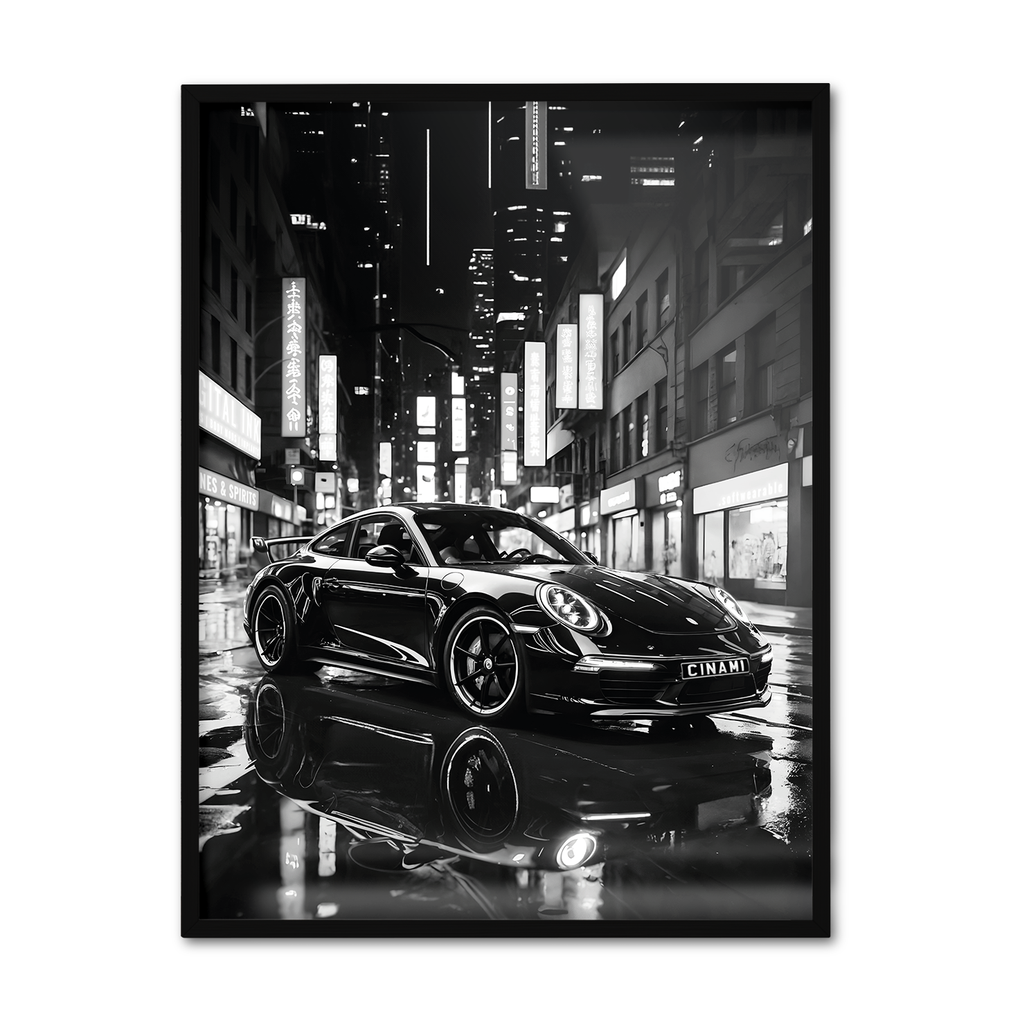 Photographic style poster of a beautiful Porsche 911. Set in the futuristic, neon lights of a cyberpunk cityscape, the watery reflections give an atmospheric feel and will make a stunning art piece to display on a feature wall. There are two designs in this collection, one showing the front of the vehicle and one showing the rear. They can be purchased alone or together to make a really impactful art display. This design is available in 5 colour options and comes with personalisation of the registration plate. Please be sure to include your chosen name within 24 hours of purchase on the personalisation information contact form, available on the product page. If no information is received within this time, the standard name of CINAMI will be used in your final print.