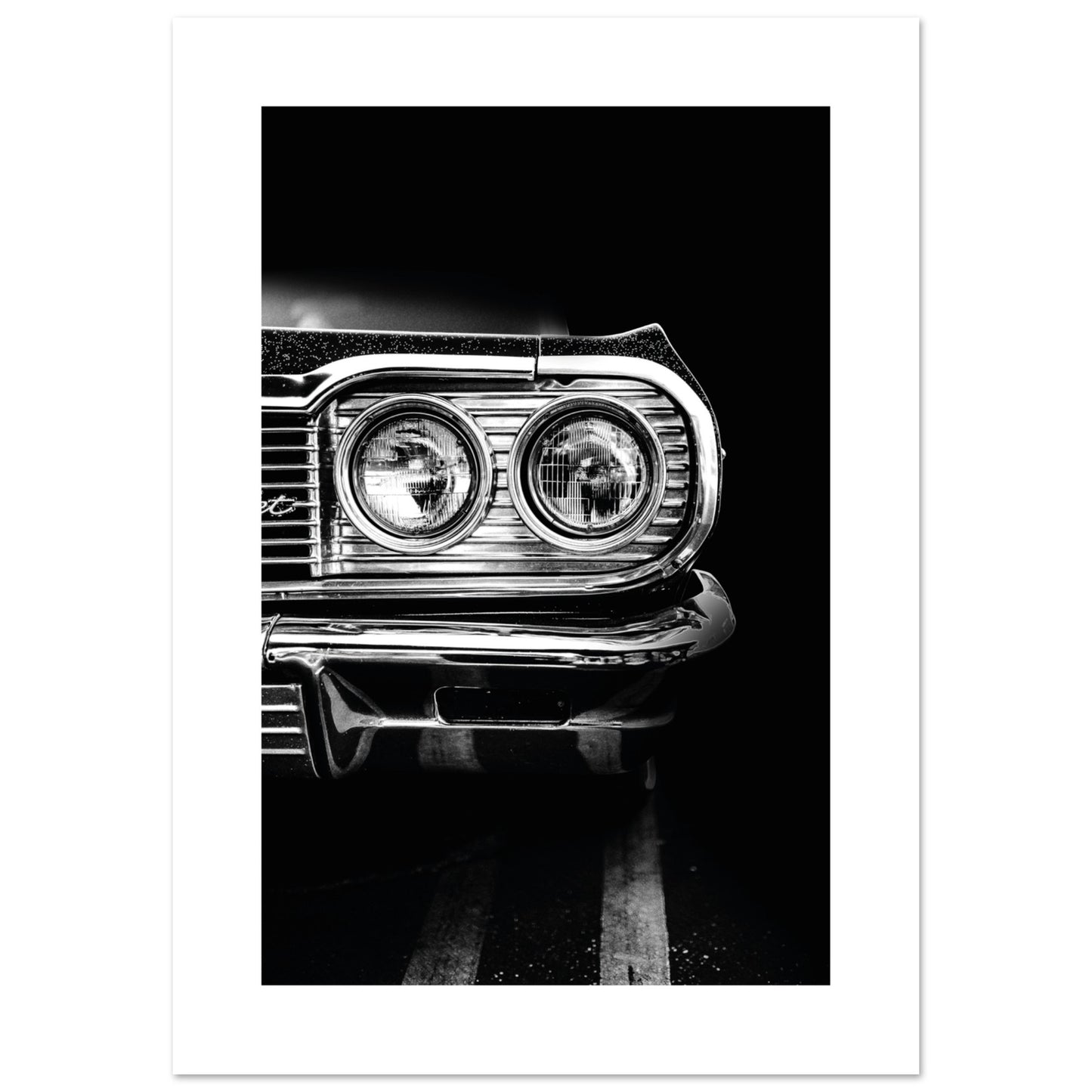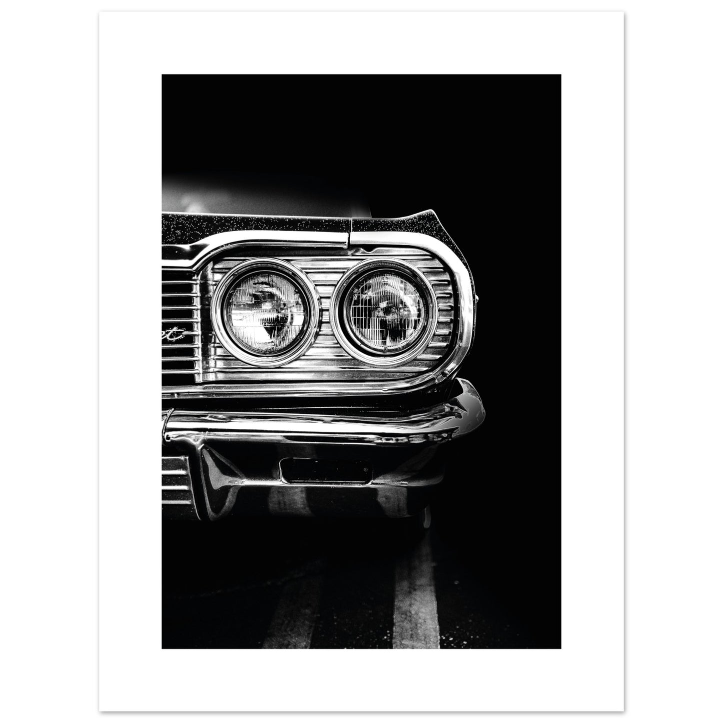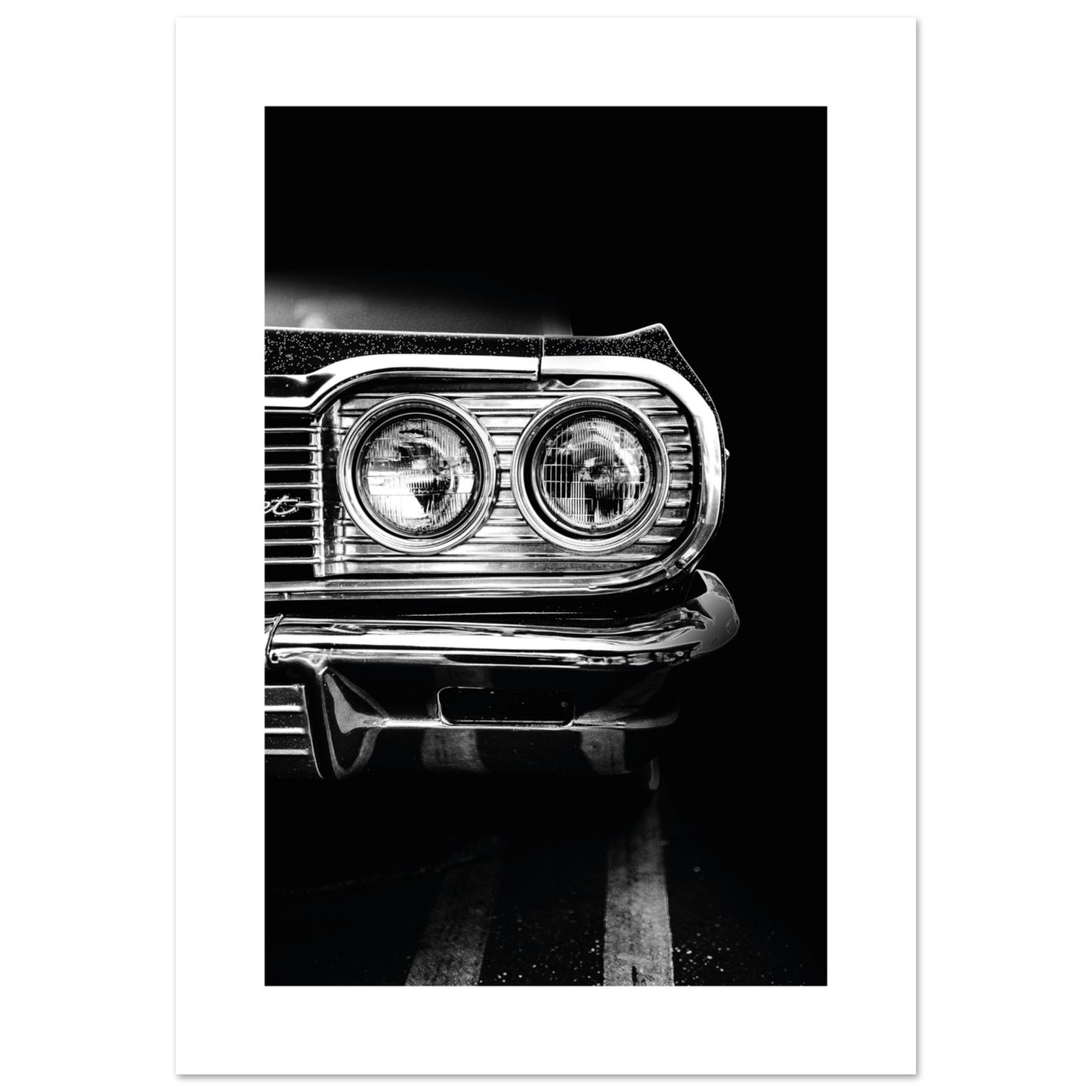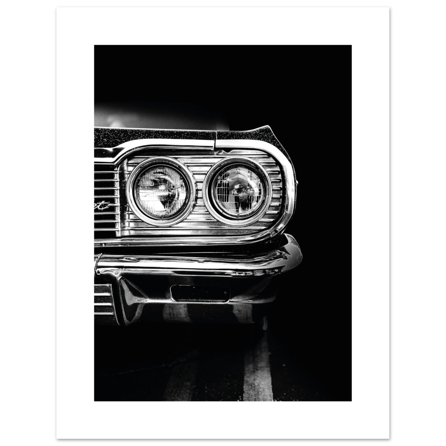 Photographic unframed poster of a vintage car headlight striking black and white.