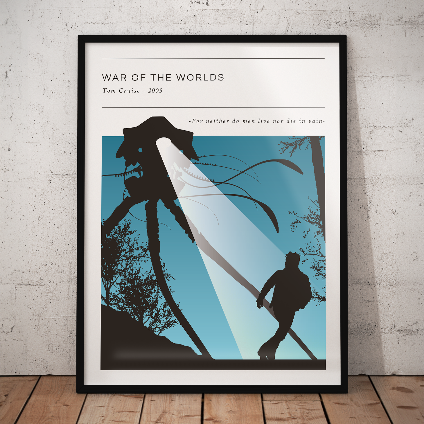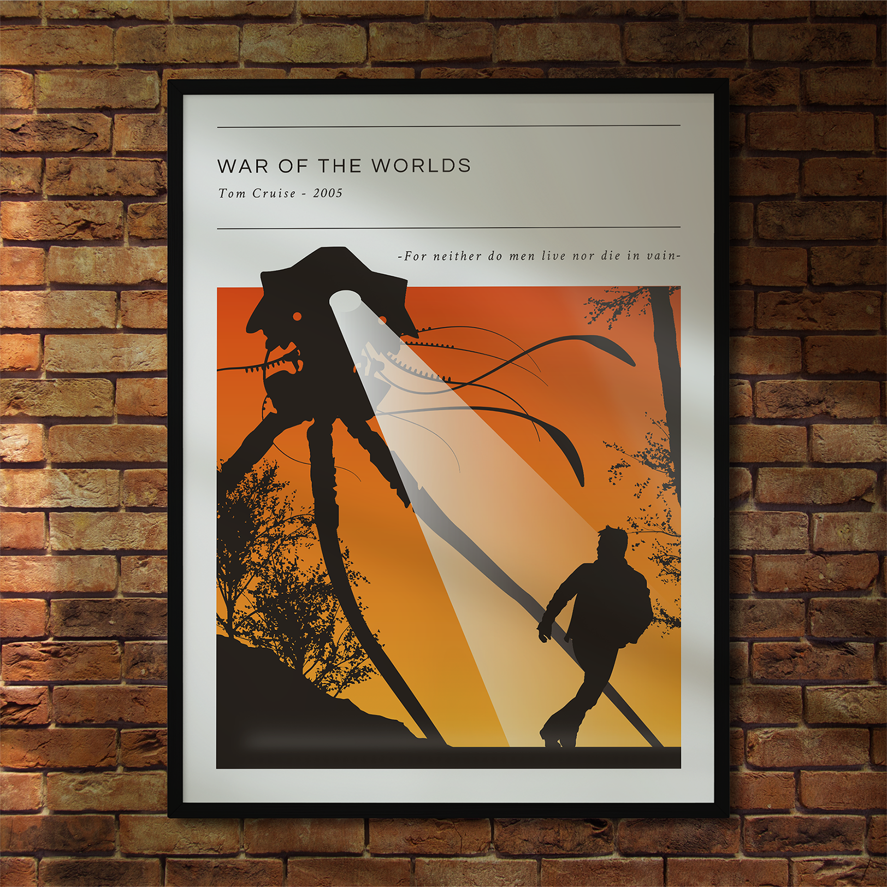 War Of The Worlds movie poster done in silhouette style with vibrant colour background. The poster displays the year, main actors and a famous quote from the movie.